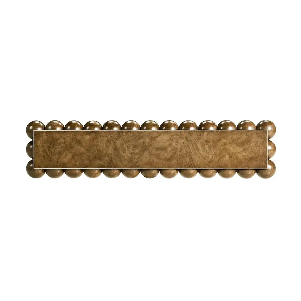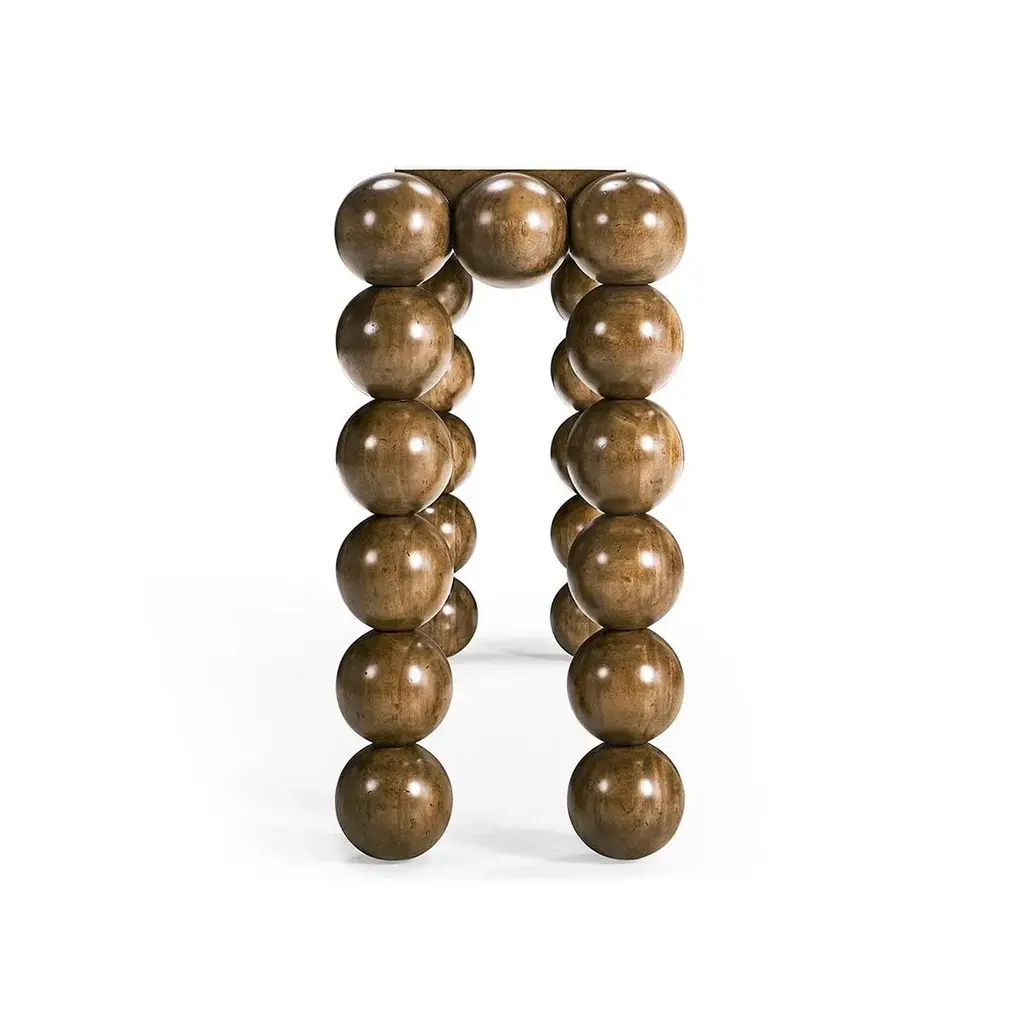 With its captivating spheres and luxurious finish, it becomes the centerpiece that seamlessly combines modern elegance and sophistication. The table's solid wood-stacked orbs form a charismatic foundation that fuses art and functionality. These orbs create a unique and eye-catching leg and apron design that adds personality to the piece. The faux bone inlay creates a subtle visual contrast against the medium brown mahogany veneers, elevating the table's overall appearance. Immerse yourself in the playful side of modern design. Dimensions: 72" W x 15" D x 32" H