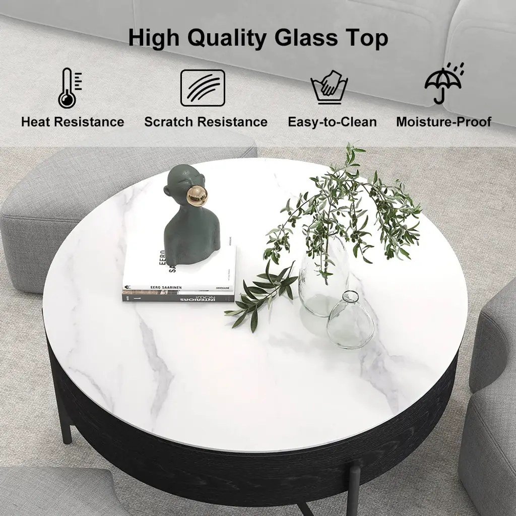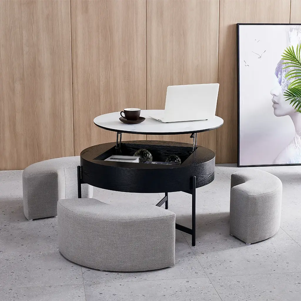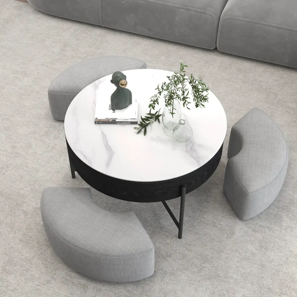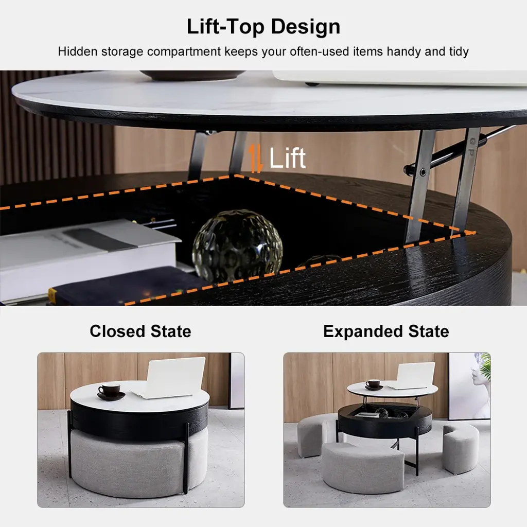 Modern Round Lift-Top Coffee Table With Storage & 3 Ottoman White & Black