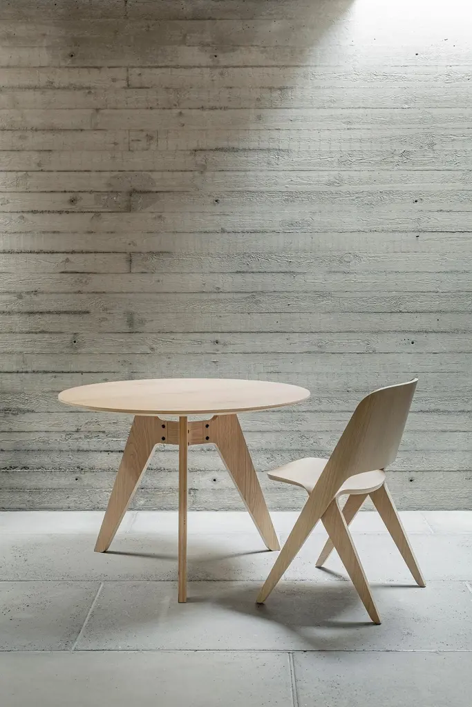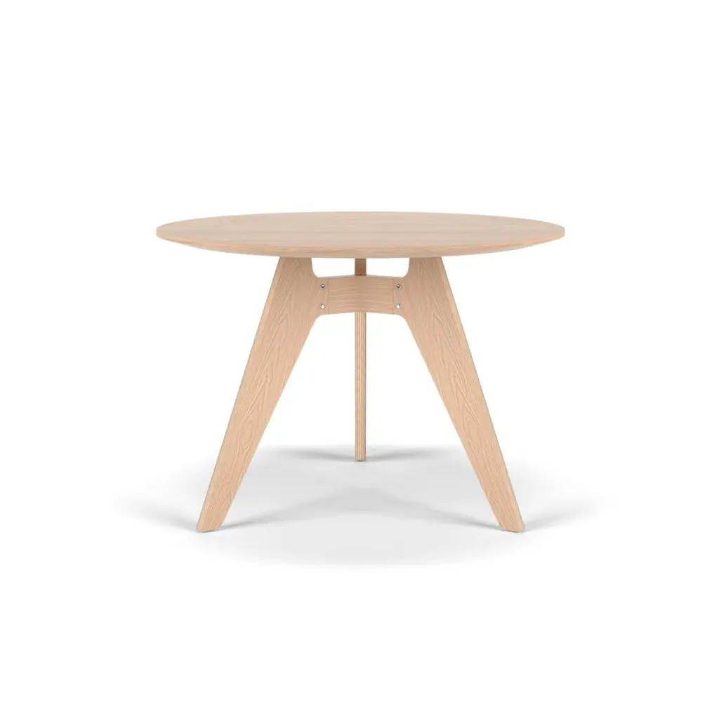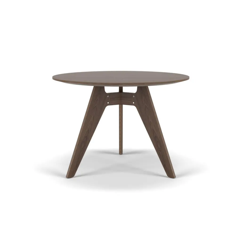 Lavitta round table (100 cm) designed by Timo Mikkonen & Antti RouhunkoskiCollection Lavitta 2016 by Poiat Model shown on pictureDimensions : H. 72 cm x D. 100 cm Color : Dark Oak Three legs The Lavitta Collection draws upon the influences of traditional rugged Finnish outdoor furniture. The novel interpretation of the countryside classics creates a fascinating contradiction where rational practicality merges with a sophisticated tactile and visual appeal.The Lavitta Round Table is a modern classic that focuses on the sophisticated union of traditional wooden furniture with contemporary design. Designed by Poiat Studio in 2016, the Lavitta Round Table follows the lines of the Lavitta Chair with its tapering legs and rounded corners. The base of the table is made entirely of veneered and moulded plywood, without any steel parts.The origin of the word Poiat summarises both worlds of the company: a small village in the Italian Alps and a word meaning “boys” in one of the Finnish dialects. The love for Italian design aesthetics and heritage combined with the Finnish cultural tradition of collaborative working.