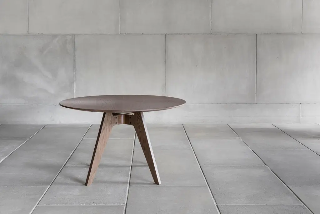 Lavitta round table (120 cm) designed by Timo Mikkonen & Antti RouhunkoskiCollection Lavitta 2016 by Poiat Model shown on pictureDimensions : H. 72 cm x D. 120 cm Color : Dark Oak Four legs The Lavitta Collection draws upon the influences of traditional rugged Finnish outdoor furniture. The novel interpretation of the countryside classics creates a fascinating contradiction where rational practicality merges with a sophisticated tactile and visual appeal.The Lavitta Round Table is a modern classic that focuses on the sophisticated union of traditional wooden furniture with contemporary design. Designed by Poiat Studio in 2016, the Lavitta Round Table follows the lines of the Lavitta Chair with its tapering legs and rounded corners. The base of the table is made entirely of veneered and moulded plywood, without any steel parts.The origin of the word Poiat summarises both worlds of the company: a small village in the Italian Alps and a word meaning “boys” in one of the Finnish dialects. The love for Italian design aesthetics and heritage combined with the Finnish cultural tradition of collaborative working.