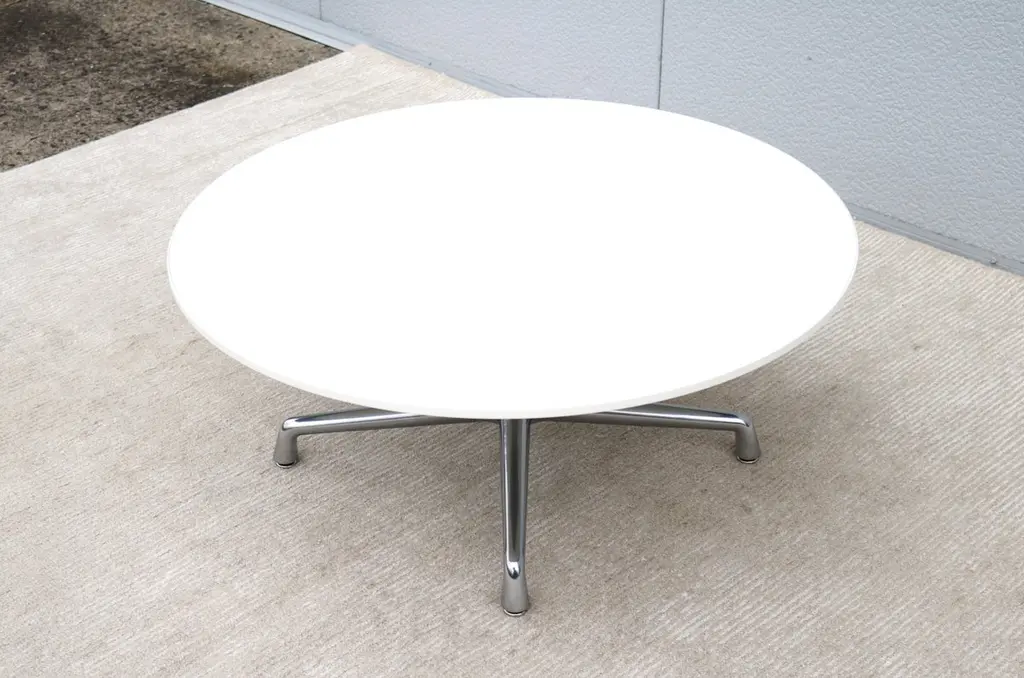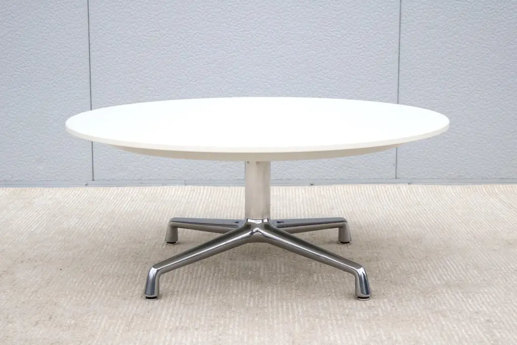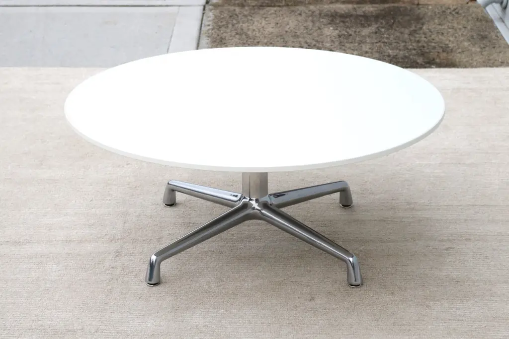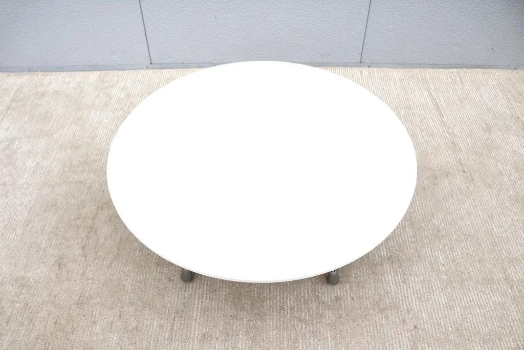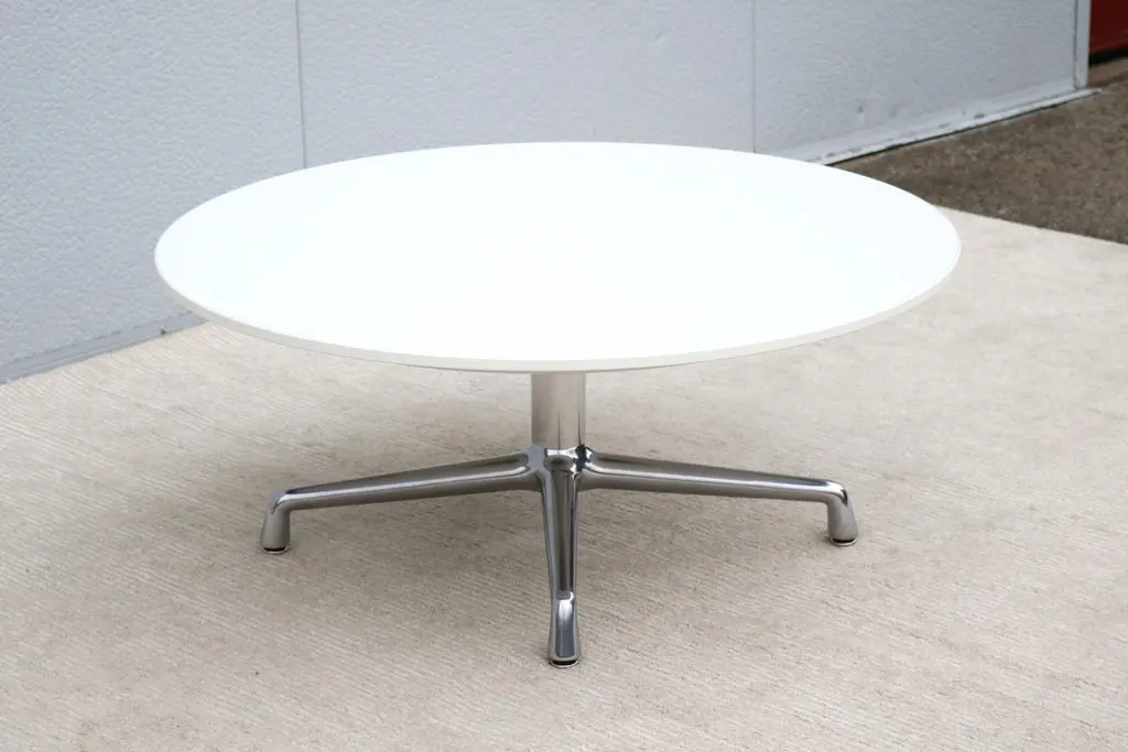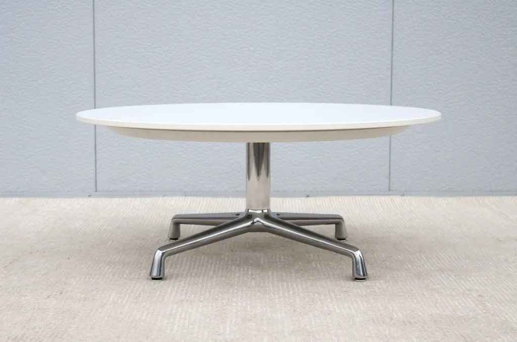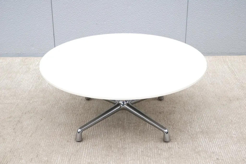 The modern beauty and smart design of the SW_1 table fit seamlessly into any environment and among mid-century classic designs.This is a masterpiece that is well-designed and well-crafted, a combination of efficiency, stability and elegance.This fabulous table is versatile in its use, and the perfect addition to any indoor living space or home office.Please note I have two tables available, selling them individually (the price listed is for one table)Specification:Round white laminate top is 1/2" thick.3mm edge band in white colorAluminum matte polished 4-star base and column.4 height adjustable glides for leveling.Indoor advantage gold certified. Style: ModernModel: SW_1 # COWOLRND36Designed by: Scott Wilson and MinimalManufacturer: CoalesseYear manufactured: 2017Made and design origin: USADimensions: Diameter 36" x Height 15"Brand new this table retails for approximately $ 2800.00+Recommend checking the Coalesse website for the quality and reputation of the brand!