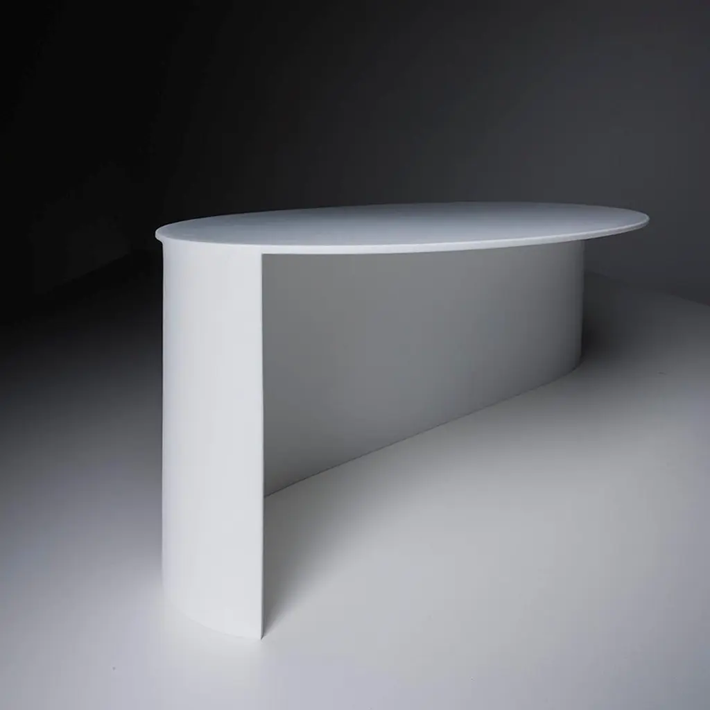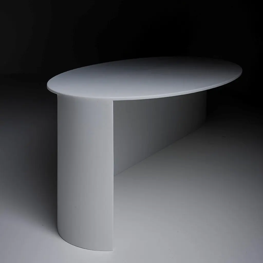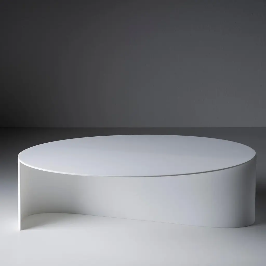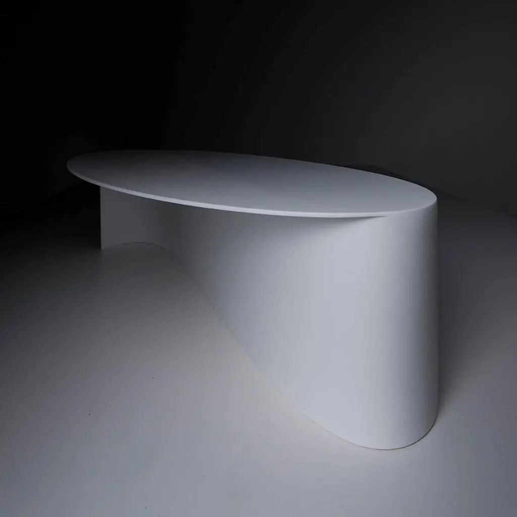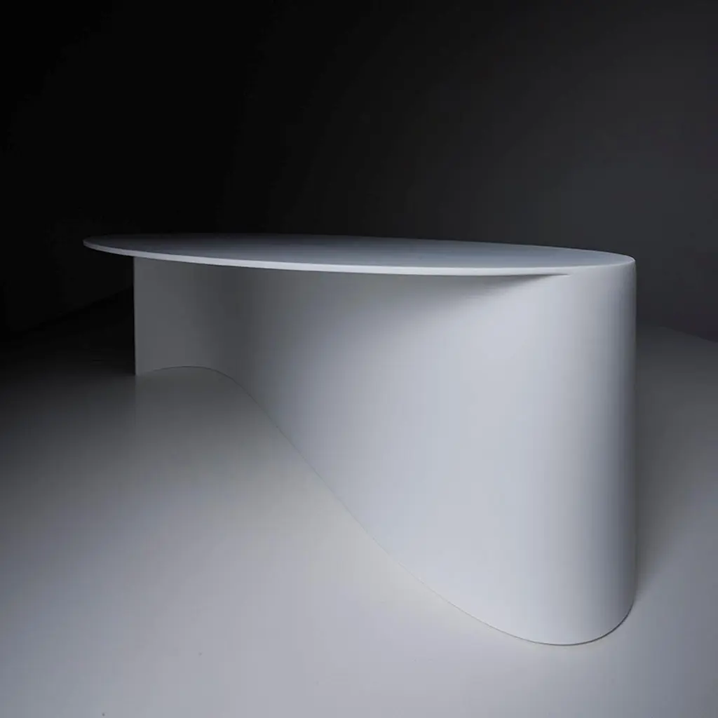 "Dorian" table by Sebastiano Bottos is a complex Corian made shape deriving from a simple design: an elliptical surface supported by a bent base that delicately skirts its vertices. Subtle surfaces turn into masses and vice versa due to the interplay of light and shadow. The composition of Corian is optimal: its invisible joints allow a fluid, seamlessly sculptured surface, velvety and pleasant to the touch.Completely designed and made in Italy.