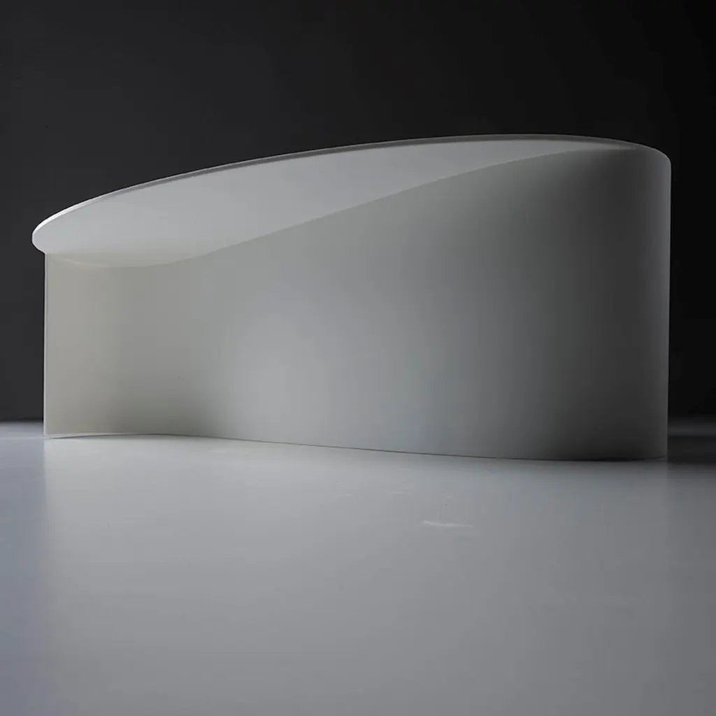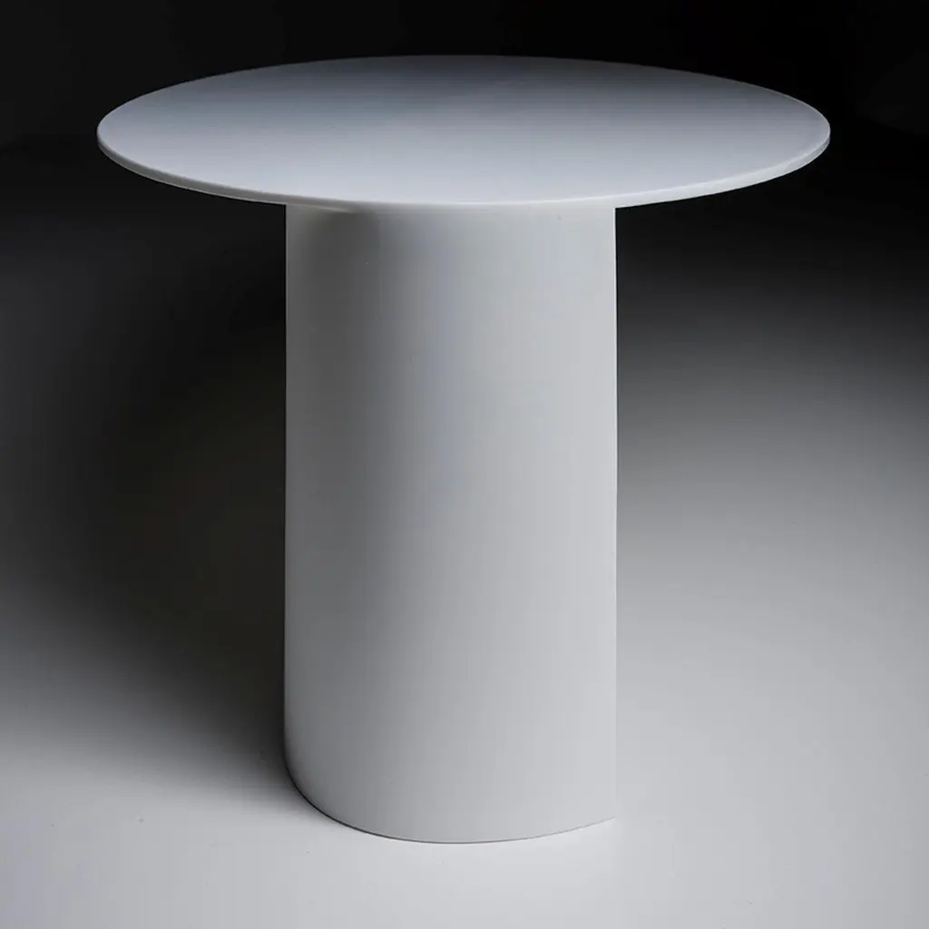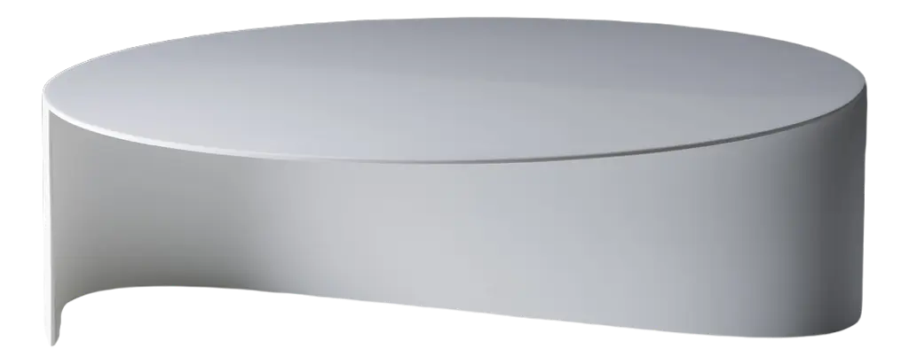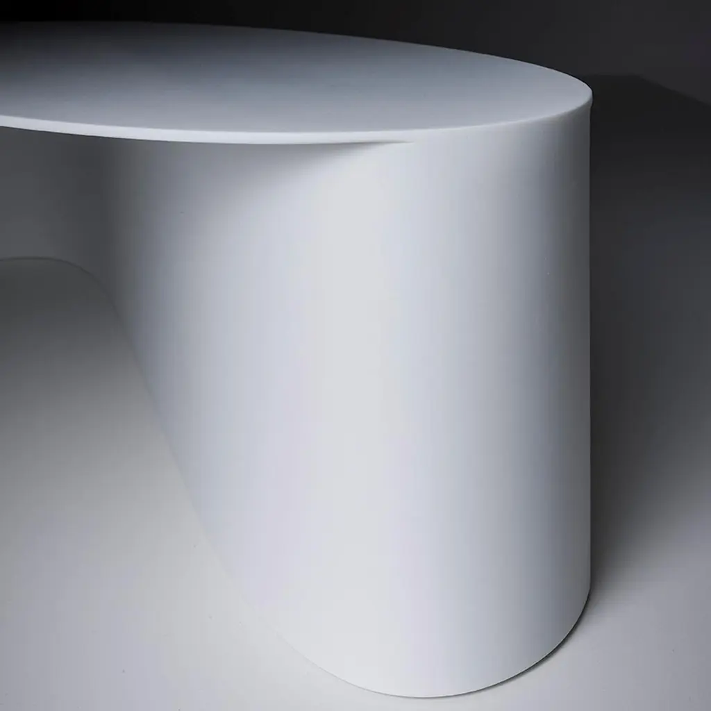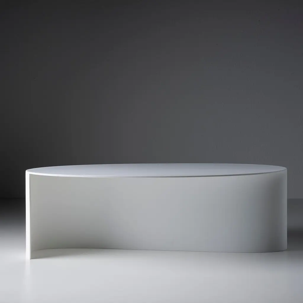 "Dorian" table by Sebastiano Bottos is a complex Corian made shape deriving from a simple design: an elliptical surface supported by a bent base that delicately skirts its vertices. Subtle surfaces turn into masses and vice versa due to the interplay of light and shadow. The composition of Corian is optimal: its invisible joints allow a fluid, seamlessly sculptured surface, velvety and pleasant to the touch.Completely designed and made in Italy.