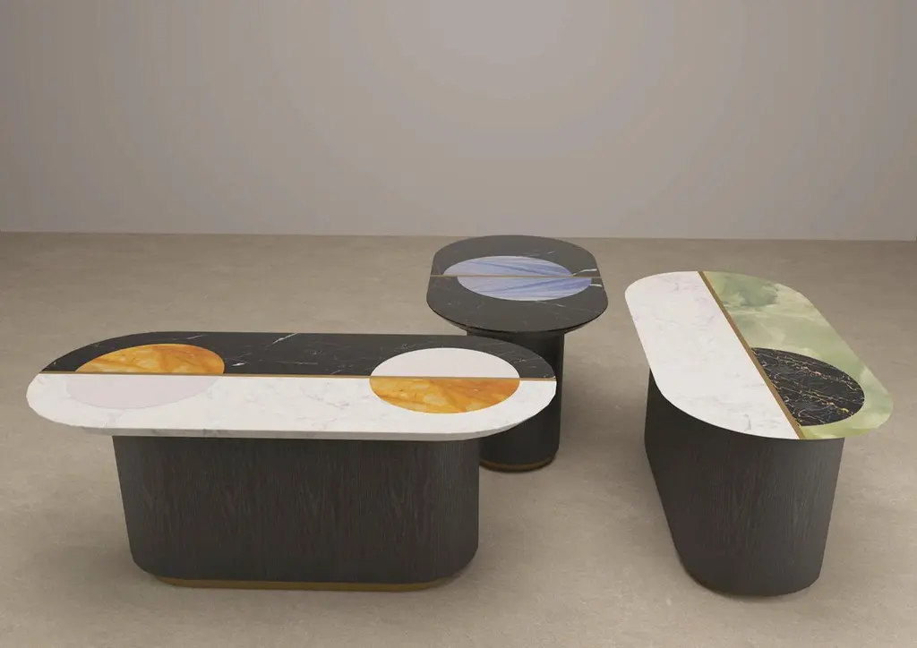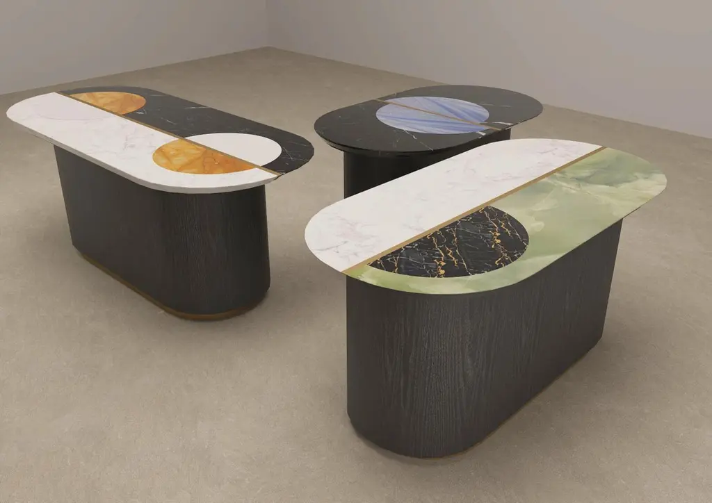 Handcrafted by skilled artisans, this Capsule or " Rounded Oval" Table features a base crafted from bent plywood and edged with matte brass. The top made by layering Bianca Carrara (White), Yellow Marble and Nero Marquina (Black) stones in circles and semicircles, intertwining to form a unique and playful design.Versatile and complementary, this table effortlessly pairs with other combinations from our exclusive collection. offering boundless possibilities for curating your space. It can be combined with the other tables is Green Onyx, Yellow marble allowing many combinations. It also presents the option for custom sizes and stone selections, allowing you to craft a truly one-of-a-kind masterpiece that reflects your design vision.Size: 950 mm l x 450 w x 450 hNote : Price is for one table