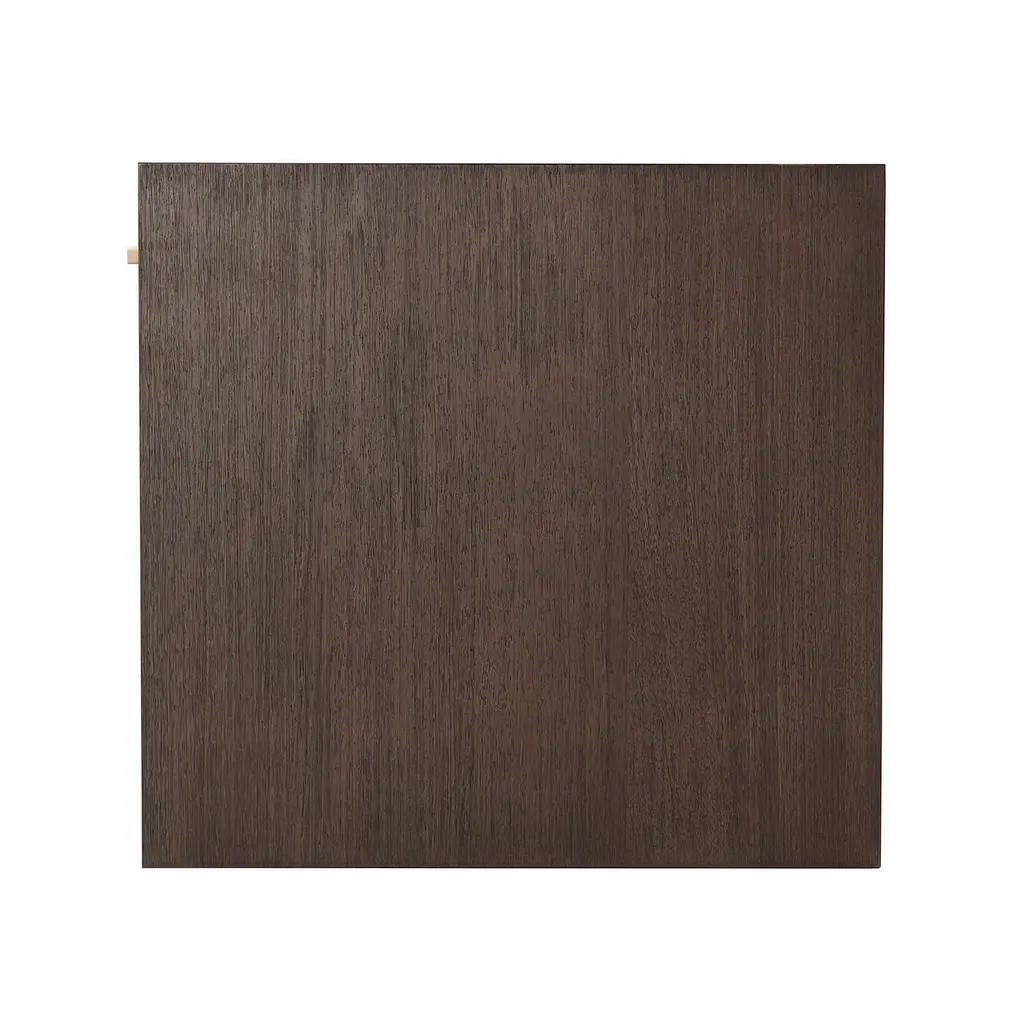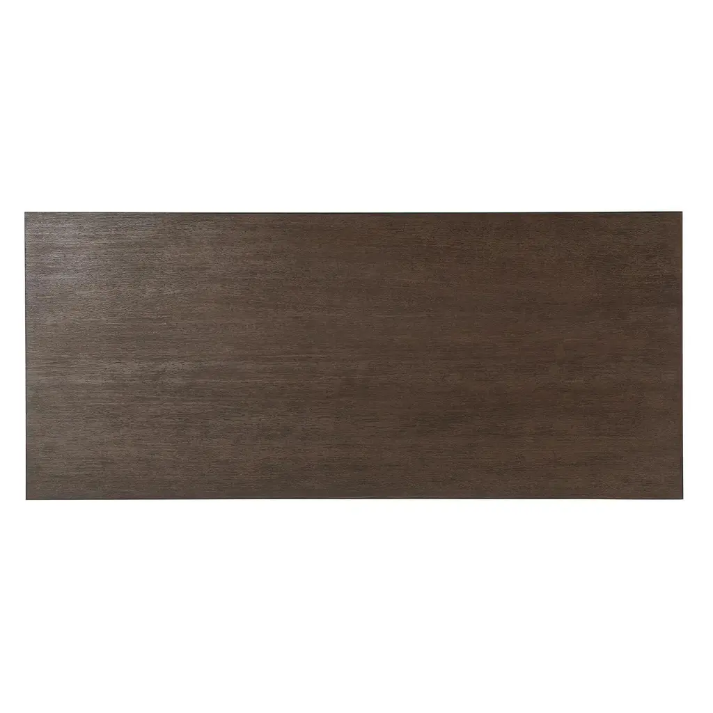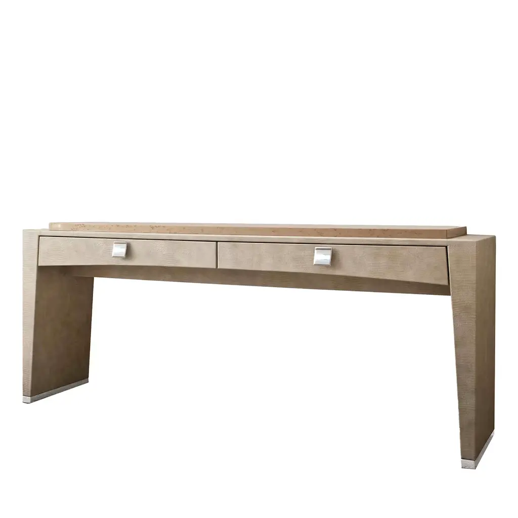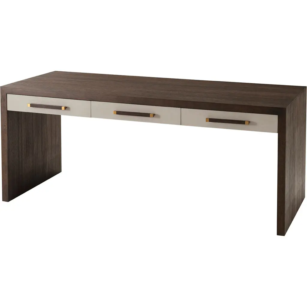 An elegant modern writing table with three singular leather wrapped drawers, our Cardamon finish on the veneered frame (and handles) with panel end supports and brushed brass finish accents. Dimensions: 72" W x 31.45" D x 30" H