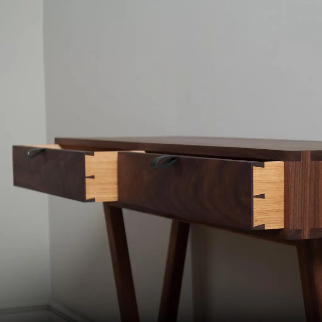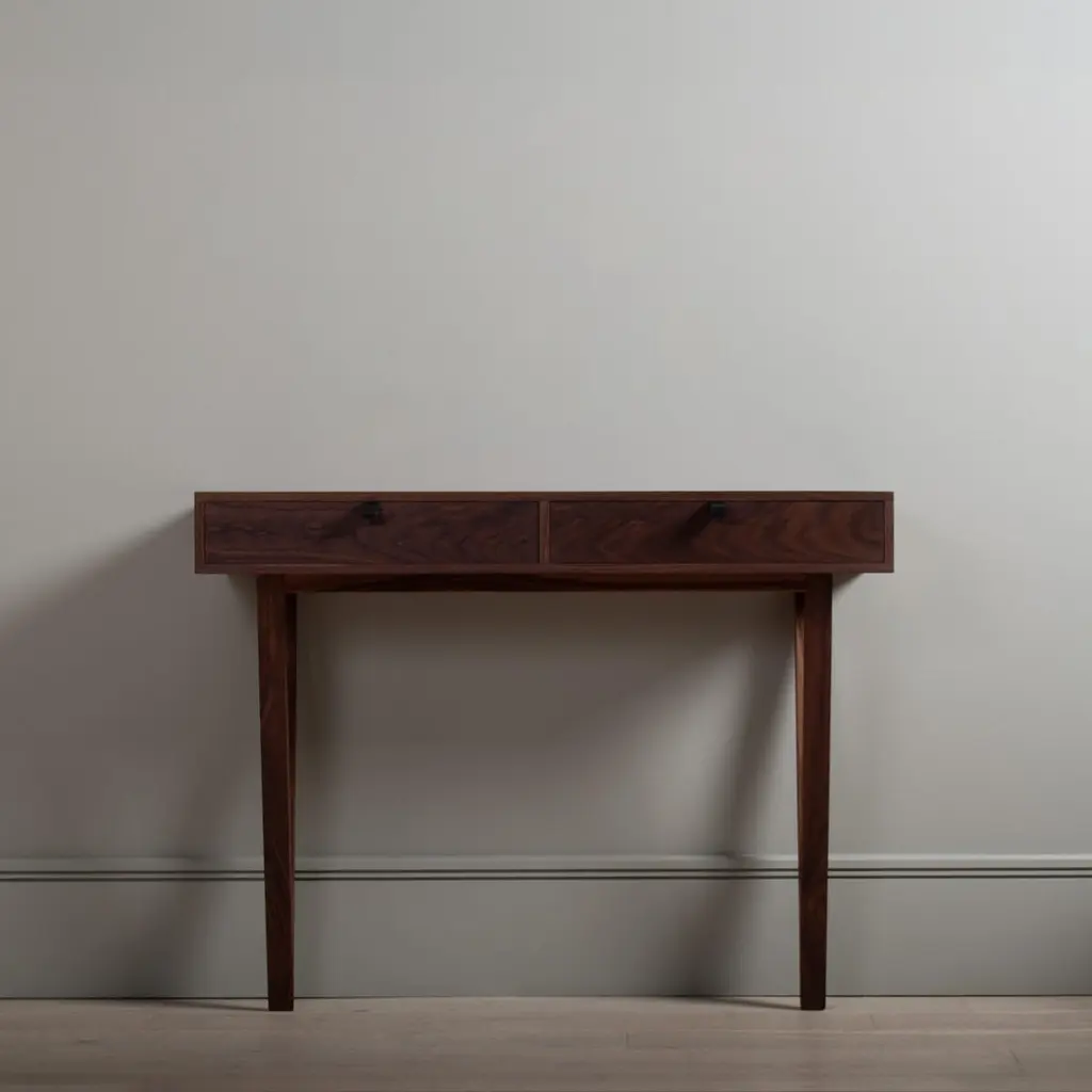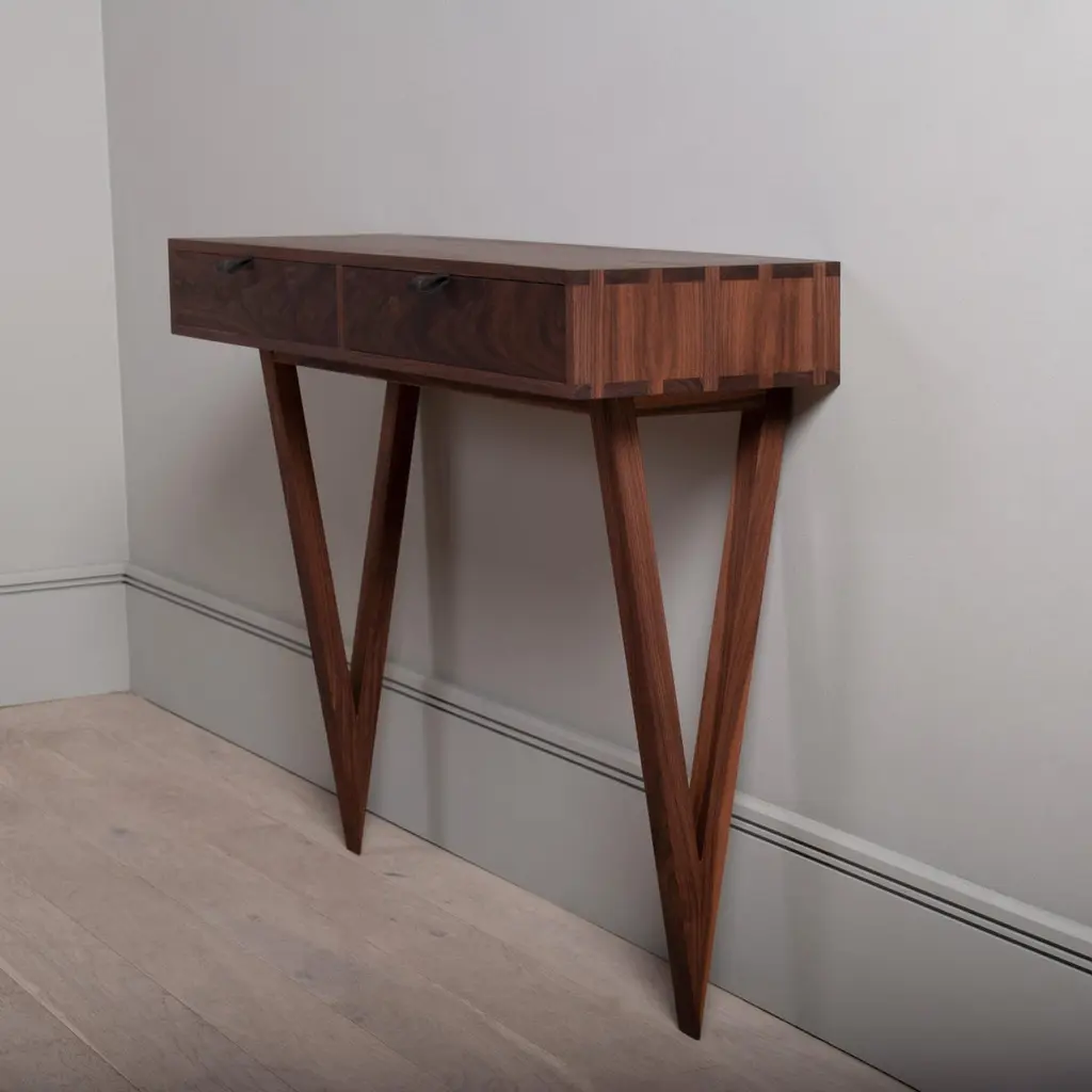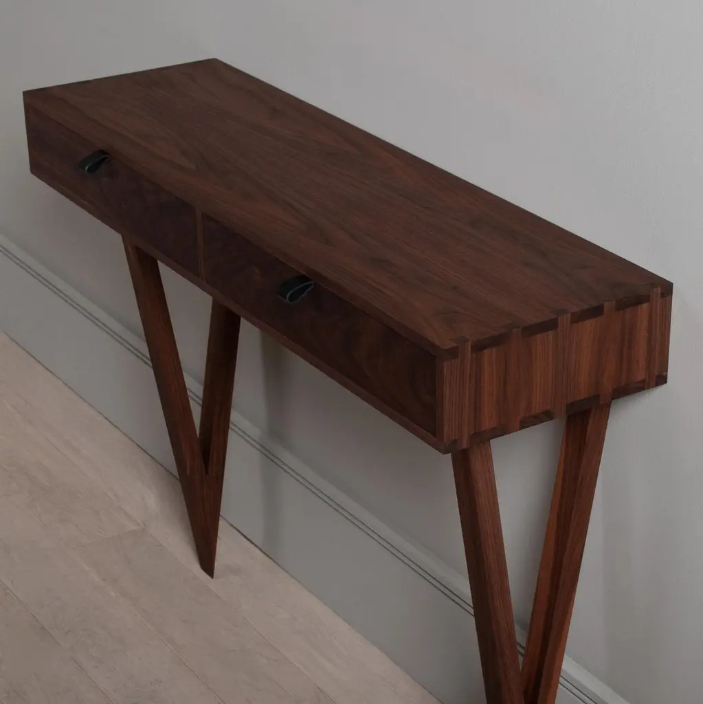 Modernist American black walnut console table designed and produced in England using traditional furniture making techniques. Completely handcrafted from the finest American black walnut. Hand dovetailed joints to the main console drawer box and all inner English oak drawer parts. This console table is fixed to the wall via screw holes hidden away behind the drawers - a straightforward process. A rock solid and striking piece of modernist furniture that is built to last. Handmade Leather finger pulls or matching walnut handles.Finished in durable natural oils.Legs simply unscrew and dismantle/assemble for extra safe transportation.We are also able to produce this piece in other sizes and in full prime English oak - Please enquire for any further details and quotations.We design bold and distinctive pieces of furniture – our main objective is combining the design alongside the natural beauty and properties of the raw materials.These timbers and materials are very carefully chosen for each specific design - maintaining our focus on the benefits, visual impact and strengths of what we use. Our regular use of English Quartersawn Oak is one case in point. It has been the beloved timber of fine furniture makers across the world for centuries. It is costly to produce but gives huge benefits and rewards such as its striking medullary rays and superb stability qualities. By utilising these wonderful and naturally occurring features with our contemporary designs we aim to continue creating some very distinct, tactile and idiosyncratic pieces.These are all completely handmade, in very small numbers, by our skilled craftspeople in England.