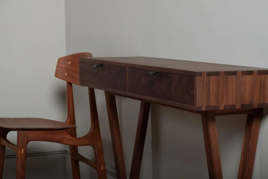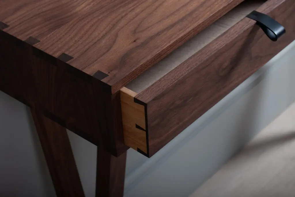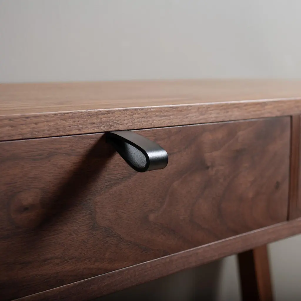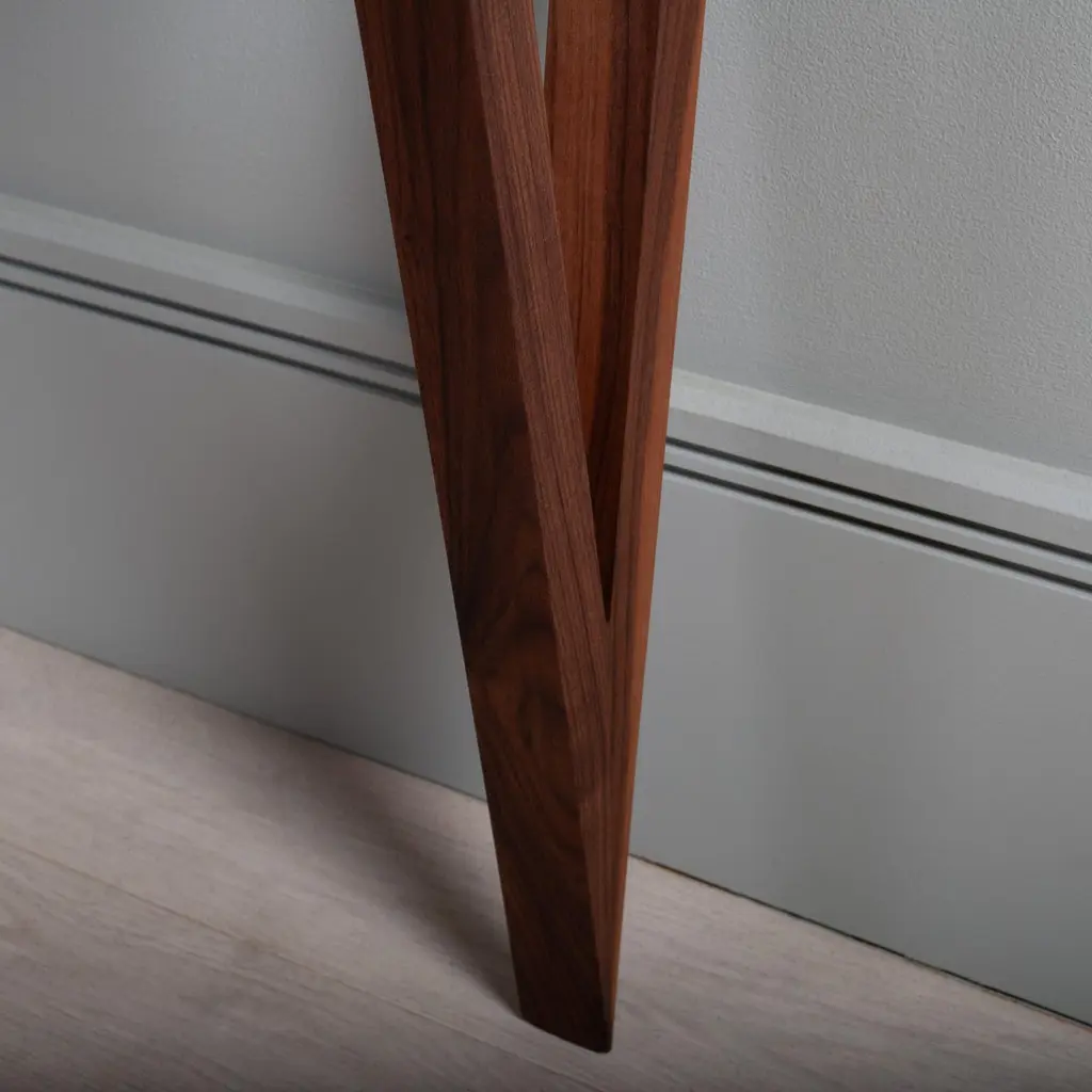 Modernist American black walnut console table designed and produced in England using traditional furniture making techniques. Completely handcrafted from the finest American black walnut. Hand dovetailed joints to the main console drawer box and all inner English oak drawer parts. This console table is fixed to the wall via screw holes hidden away behind the drawers - a straightforward process. A rock solid and striking piece of modernist furniture that is built to last. Handmade Leather finger pulls or matching walnut handles.Finished in durable natural oils.Legs simply unscrew and dismantle/assemble for extra safe transportation.We are also able to produce this piece in other sizes and in full prime English oak - Please enquire for any further details and quotations.We design bold and distinctive pieces of furniture – our main objective is combining the design alongside the natural beauty and properties of the raw materials.These timbers and materials are very carefully chosen for each specific design - maintaining our focus on the benefits, visual impact and strengths of what we use. Our regular use of English Quartersawn Oak is one case in point. It has been the beloved timber of fine furniture makers across the world for centuries. It is costly to produce but gives huge benefits and rewards such as its striking medullary rays and superb stability qualities. By utilising these wonderful and naturally occurring features with our contemporary designs we aim to continue creating some very distinct, tactile and idiosyncratic pieces.These are all completely handmade, in very small numbers, by our skilled craftspeople in England.