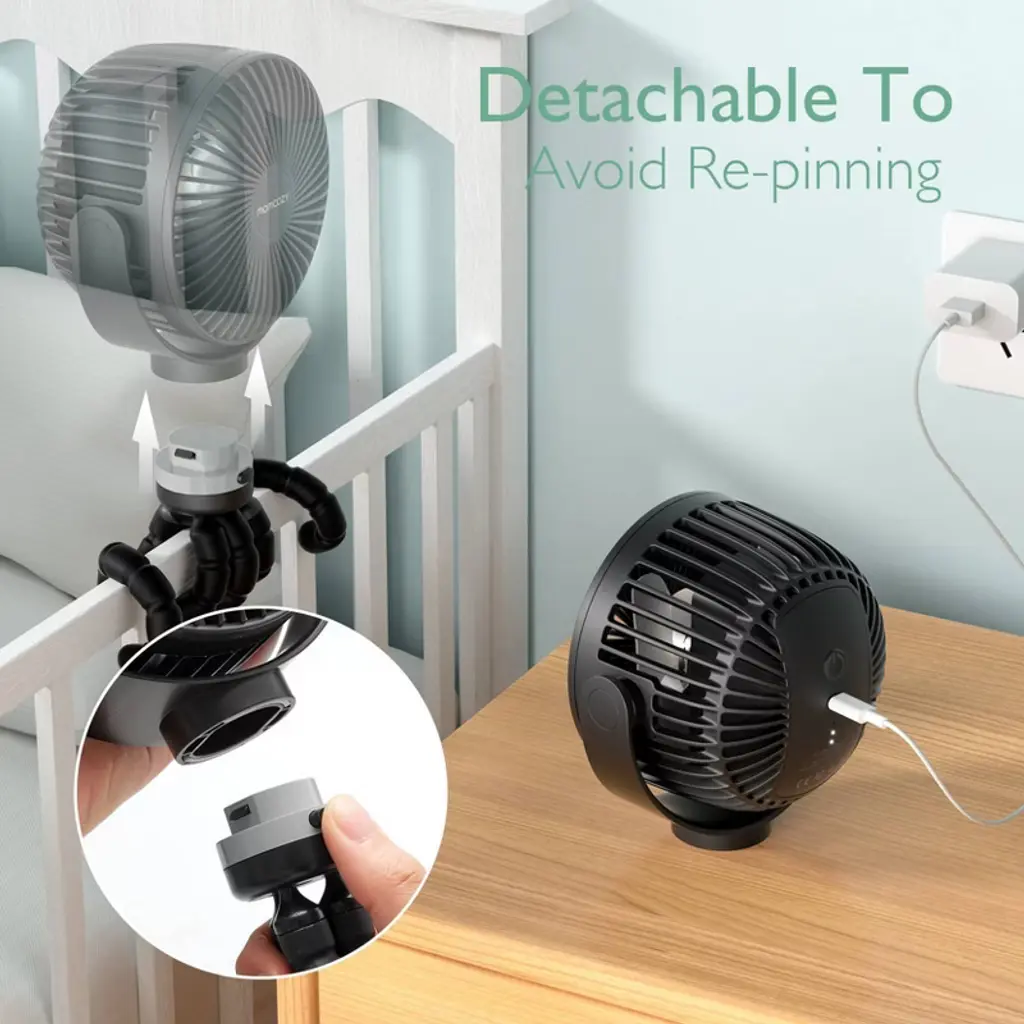 Momcozy Portable stroller fan equipped with a large-capacity battery of 8000mAh, lasts 12-27 hours depending on winds, and provides a 1M USB charging cable for convenient charging anytime and anywhere without distance restrictions. It can be charged by computer, power bank, car charger, etc.Momcozy Baby stroller fan's head can adjust vertically and horizontally in any direction, to provide cool airflow from every direction, keeping your little one comfortable on hot days.; it comes with 3 speeds for different purposes, The fourth level is natural wind, which is more comfortable for babies.Smaller fan gap size <5mm(±0.2mm), fully protects the baby and prevents little fingers from accidentally touching the fan blades; LED night light with 2 modes, white light mode, and cycle colored light mode to light up the night, keep your baby feeling safe, convenient for Mom and the elder in the darknessThe fan head and tripod are detachable structures, making it incredibly convenient for charging. Simply remove the fan head without the need for re-pinning. This tripod is made of high-quality metal and silicone materials, you can bend any angle you want, grip it, wrap it, or stand it.Our flexible tripod design allows for versatile and convenient use. Clip it onto strollers, cribs, and car seats for your baby, or use it in various settings such as waiting for childbirth, bedrooms, desktops, baby carriages, camping, bicycle riding, and travel. It's your perfect companion for any situation.