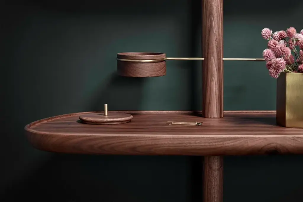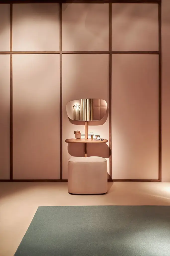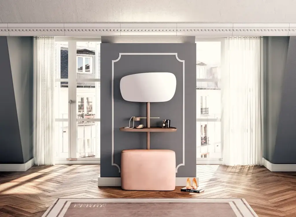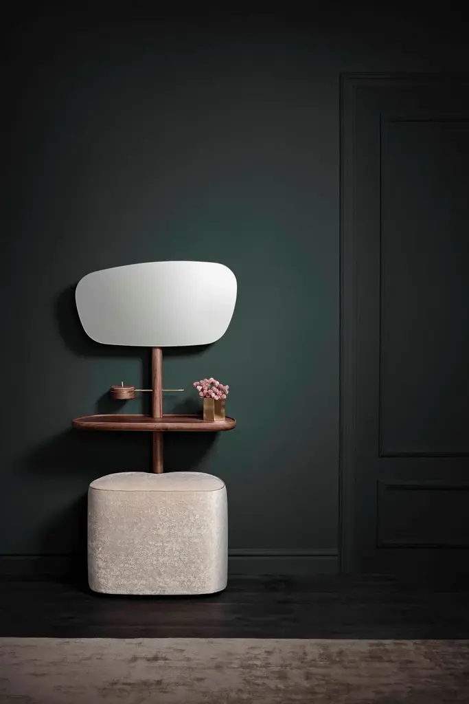 MOMENTS is a wooden dressing table. Deconstruction of the classic vanity/dressing table, which acquires a new, much more contemporary dimension without sacrificing to its functionality. The organic shapes and velvet upholstery with silk trimmings accentuate its eminently feminine character. Both in its natural walnut wood version and in the marble version combined with ash, it exudes elegance and sophistication. It incorporates a small box in the shape of a jewelry box.Wood options:Natural solid walnutBlack ashPuf finishes:BeigePinkGrey