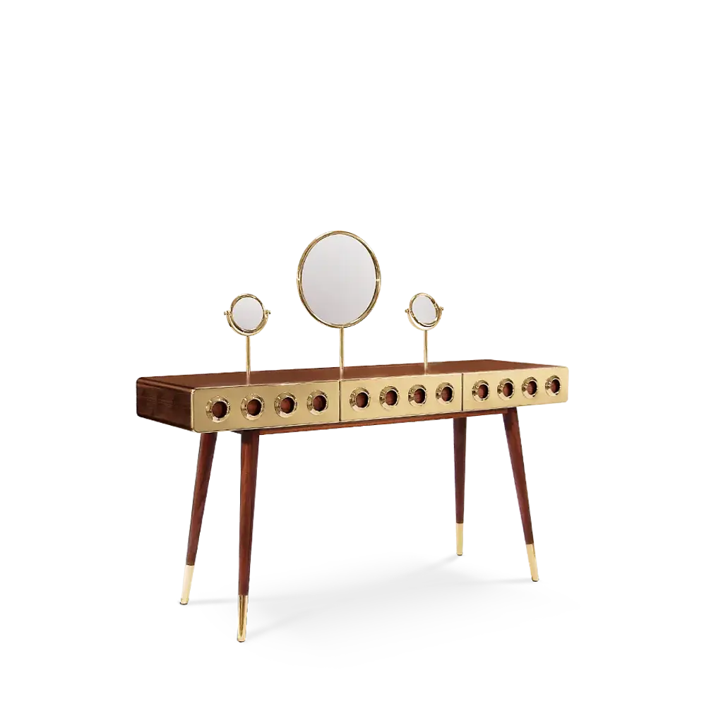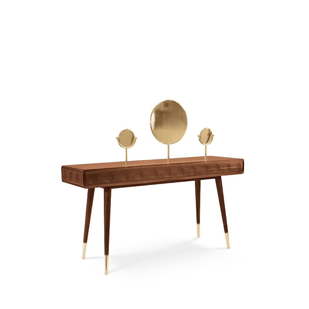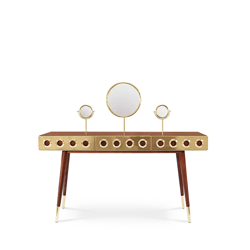 A striking addition to your glamorous boudoir. This retro table constructed of solid walnut wood is supported by atomic legs and features a set of 3 bullseye mirrors with a brass rim, and the smaller ones rotate.
