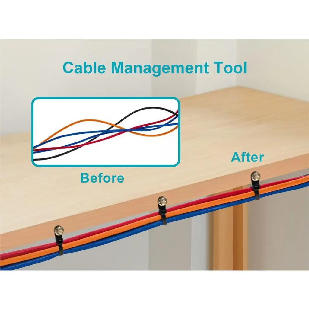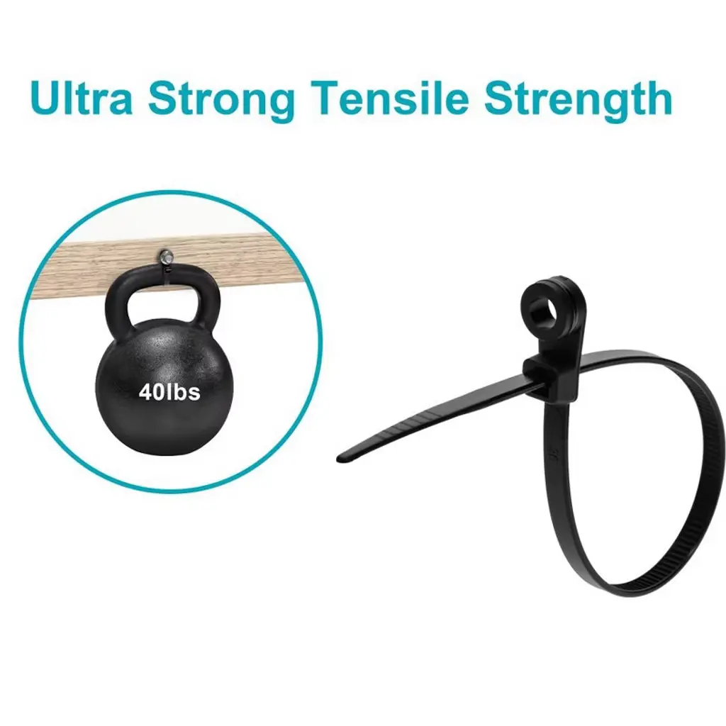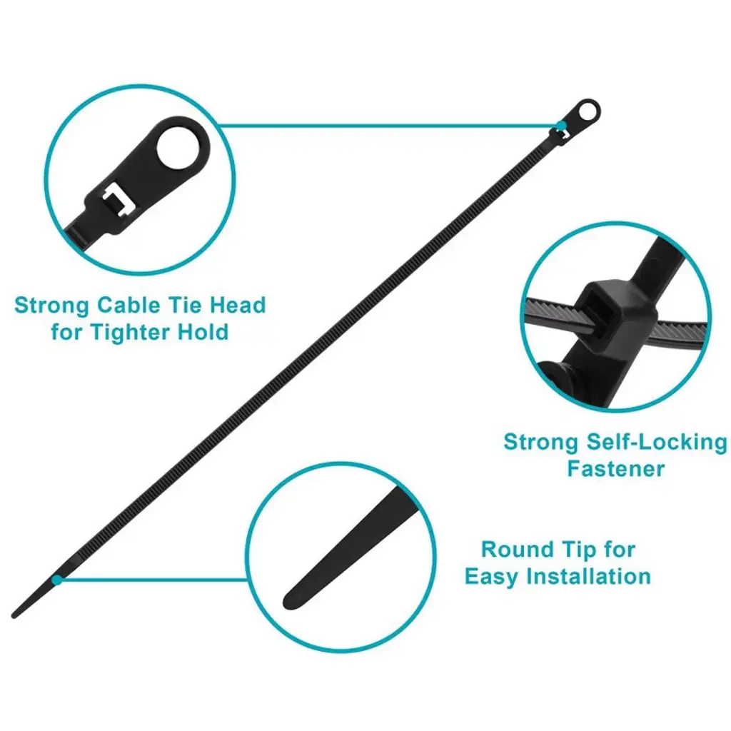 Mountable head cable ties combine two great products into one. Zip bundles of cables together and mount the ties to a wall using the integrated mounting eyelet on the zip tie head. No need for additional wall clips or mounts. Helps keep cables neat and organized. Prevents loose cables from wandering and causing accidents. Prolongs cable life by keeping them out of the path of traffic.