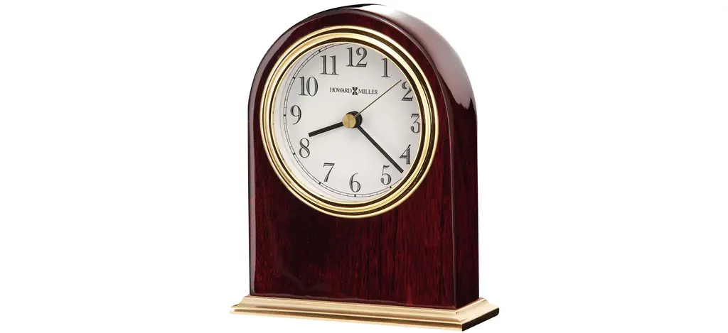 Elevate your decor with the Monroe Tabletop Clock by Howard Miller. Crafted with precision, this clock features a high-gloss Rosewood Hall finish on select hardwoods, adding a touch of sophistication to any space. The arch-shaped design and brass-finished metal base create an elegant silhouette. The polished brass-finished waterfall bezel, complemented by black numerals and hands, along with a brass second hand, stand out against the crisp white dial. With its timeless appeal and reliable battery-operated mechanism, the Monroe Tabletop Clock is a stylish and functional addition to your home. Embrace the classic charm and enduring craftsmanship of this Howard Miller masterpiece.