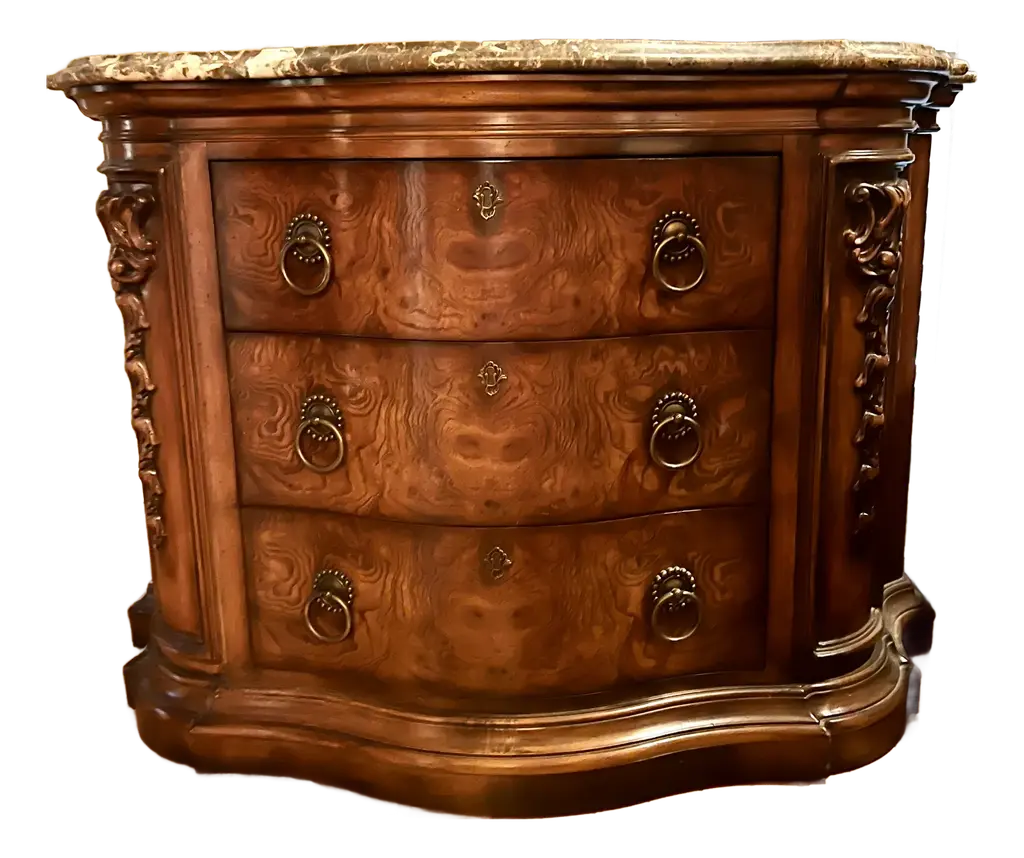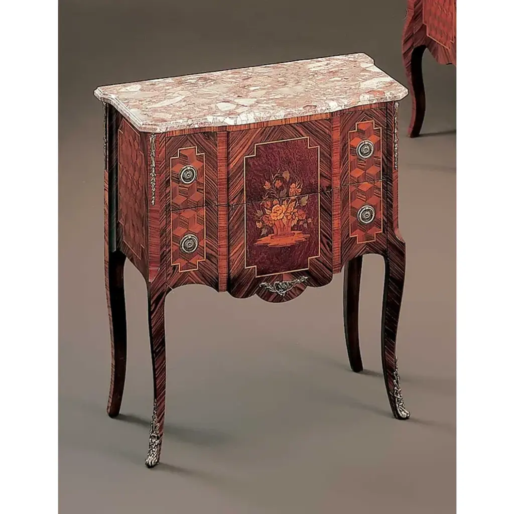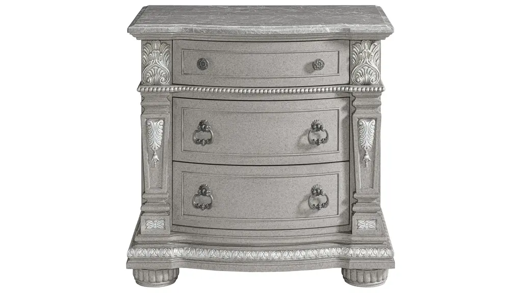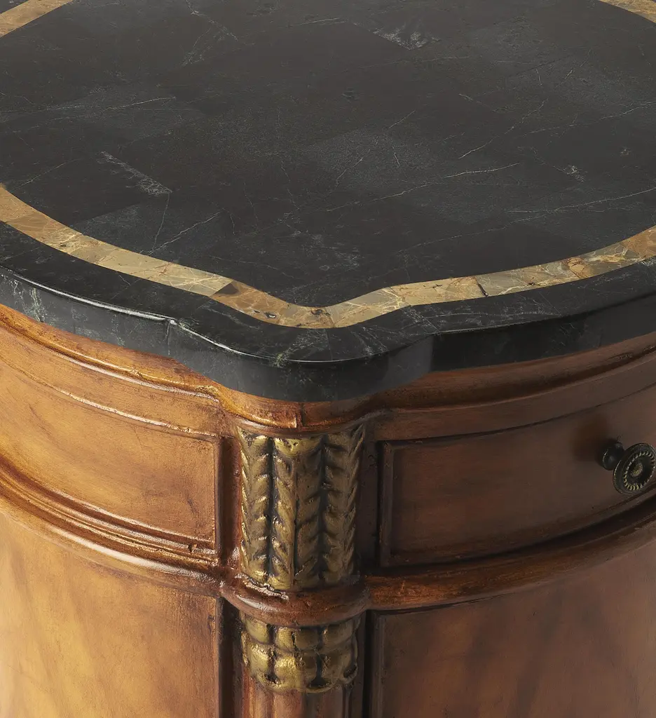 Made of select solid Woods, Wood products, resin components and choice veneers. Fossil stone veneer top with snakeskin fossil stone inlay border. Single drawer and one door with antique brass finished hardware. Center shelf behind door. Durably Constructed With: Gemelina Wood Solids, Plywood, Resin, Fossil Stone Veneers Product Construction Features: Finish Distressing Product Assembled Measurement & Weight: 28.0" H x 20.0" W x 20.0" D -- 59.0 lbs. 55 lbs. Suggested weight capacity Item Arrives: Assembled Stone is natural material and is known for its variation in color, carbon deposits and veining patterns. Variations in colors, shade and markings are normal and can be expected with the natural materials used in the construction of this product. Avoid placing hot or wet items on surface. Coaster or trivet recommended Photo may slightly differ from actual item in terms of color/finish due to the lighting during photo shoot or the monitor's display.