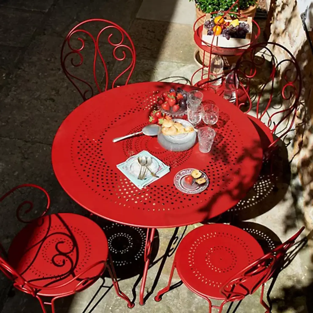 A truly elegant piece for the modern garden. The Montmartre Outdoor Table by Fermob pairs intricately patterned perforations ringed all around its top with curvy metal scrollwork on its base. The singular resulting design is at once decadent and refined. And while it may look delicate, the entire piece is actually made to last out of ultra-strong Steel, including an electro-zinc coated steel sheet top and steel rod frame. A tough anti-UV powder coat finish adds to the overall durability of this outdoor table design, while also emphasizing its many details with rich color. A piece equally well-suited to conversation or quiet contemplation.