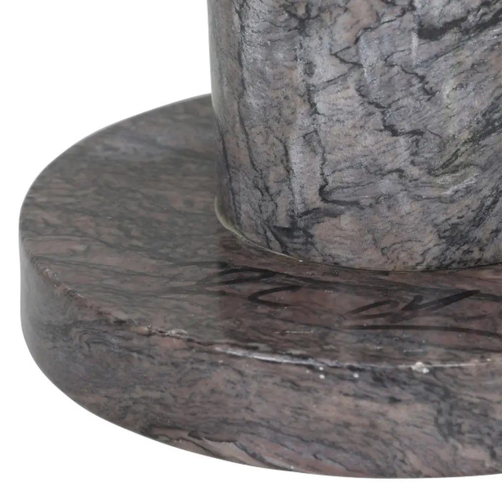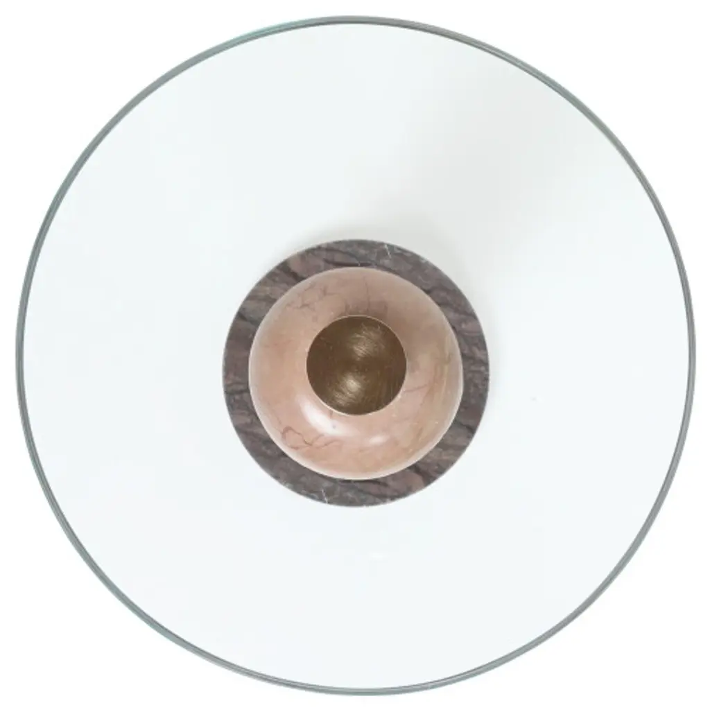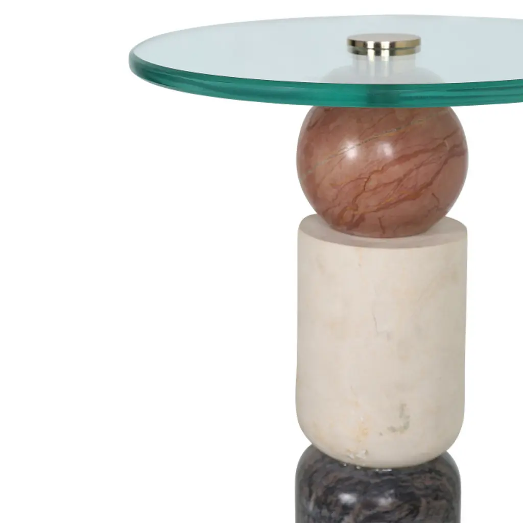 The Moreno Drinks Table is a geometric sculptural piece with tremendous personality, highlighted by the unique veining of the marbles used in its construction. Crafted from natural stone, each table's surface is distinct, ensuring that no two pieces are exactly alike. The table features a glass top with double bevels, adding to its sophisticated design.