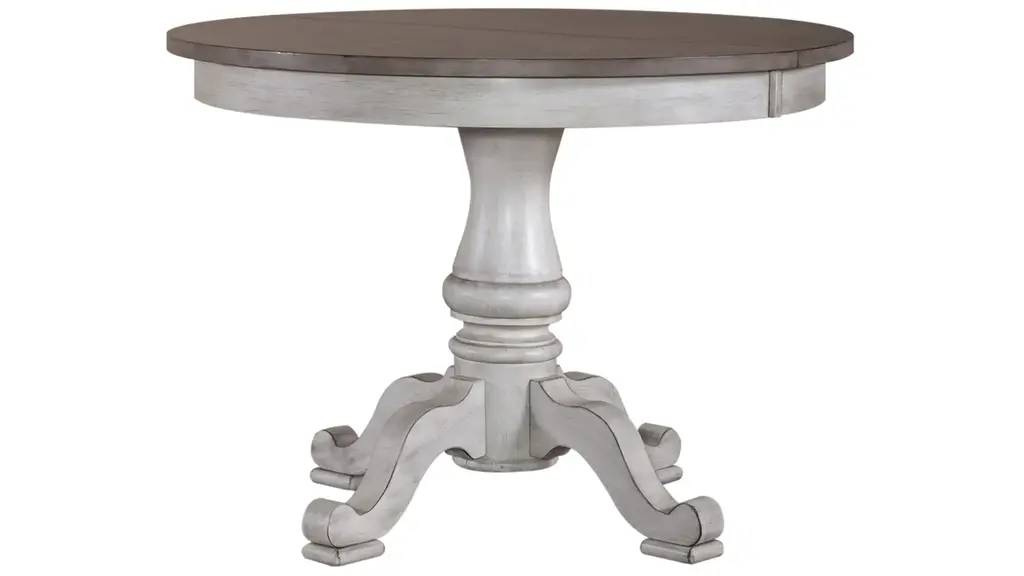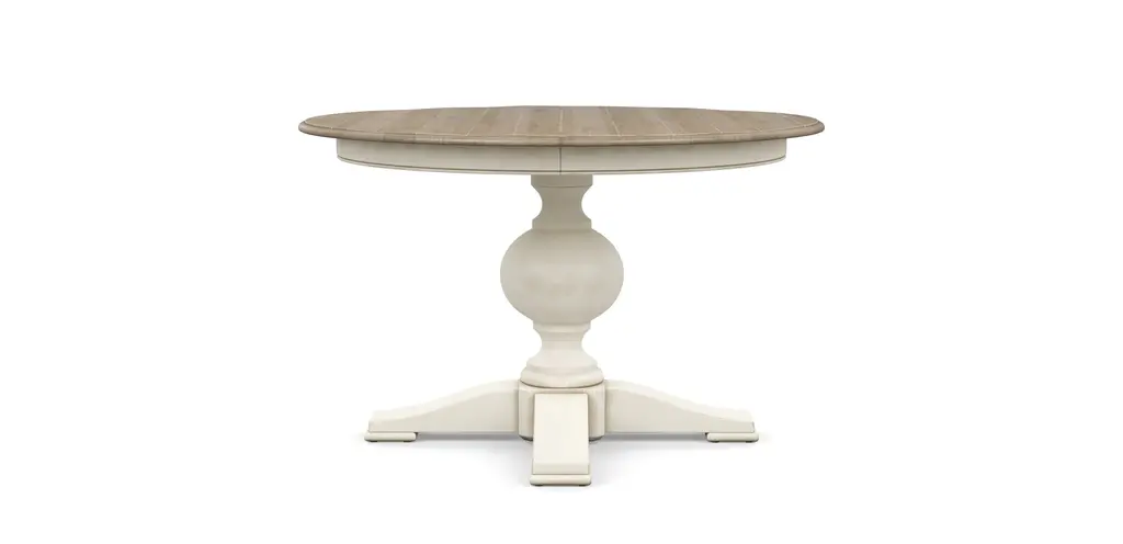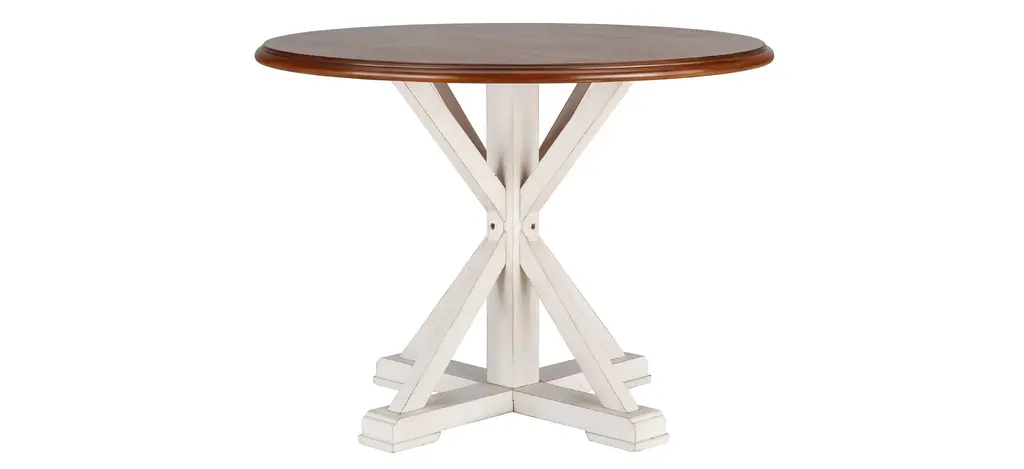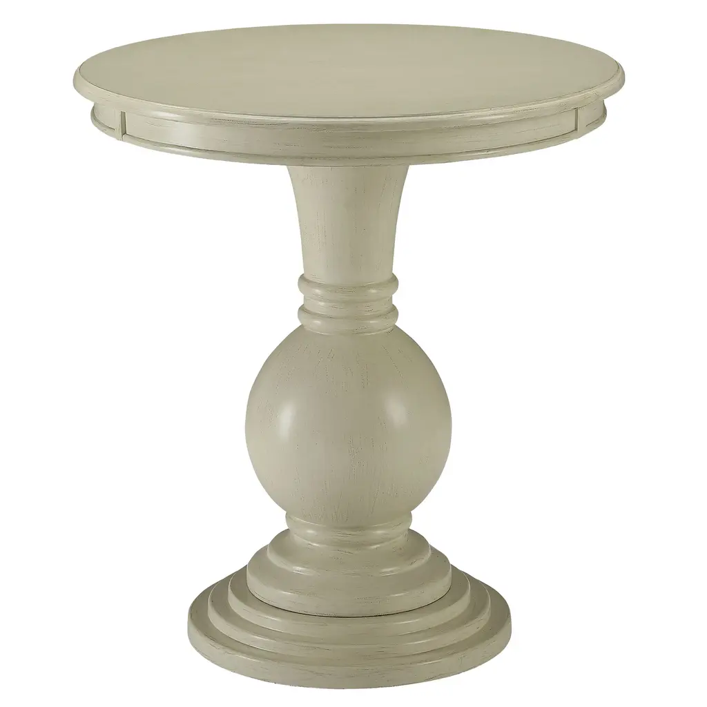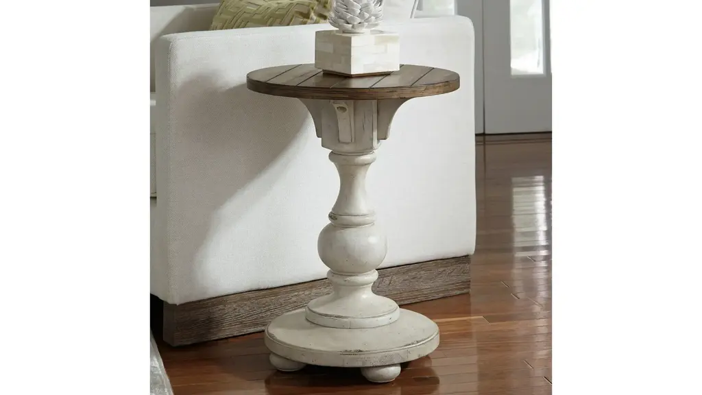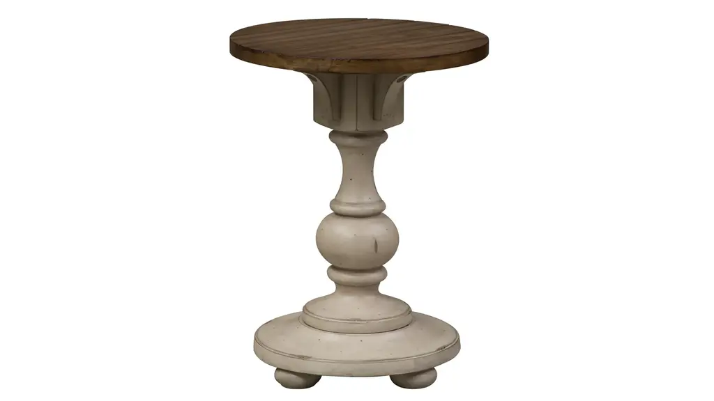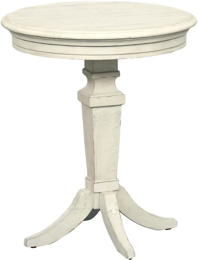 Accent your traditional style space with the Morgan Creek Chair Side Table. This piece features an antique white finish with spatter and watermark accents with a wire brushed tobacco planked top, corbel accents, anchored by a turned pedestal. This luxurious side table would make a wonderful addition to your home.