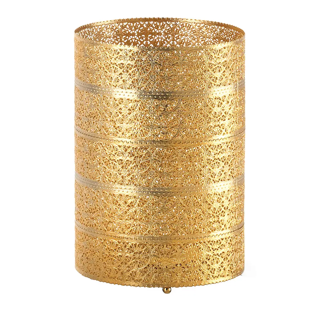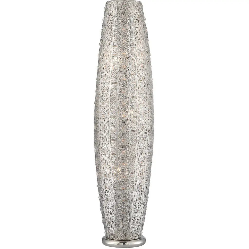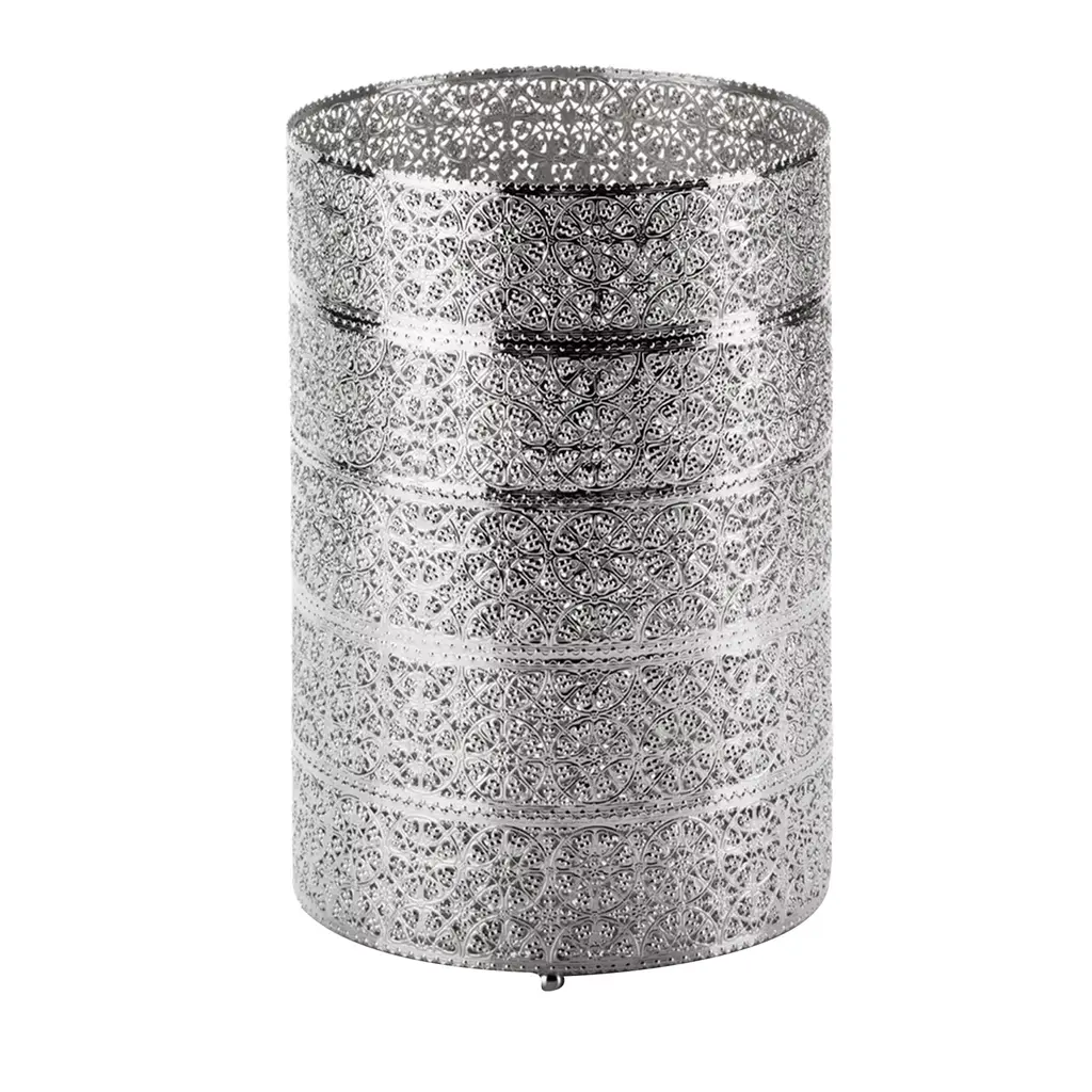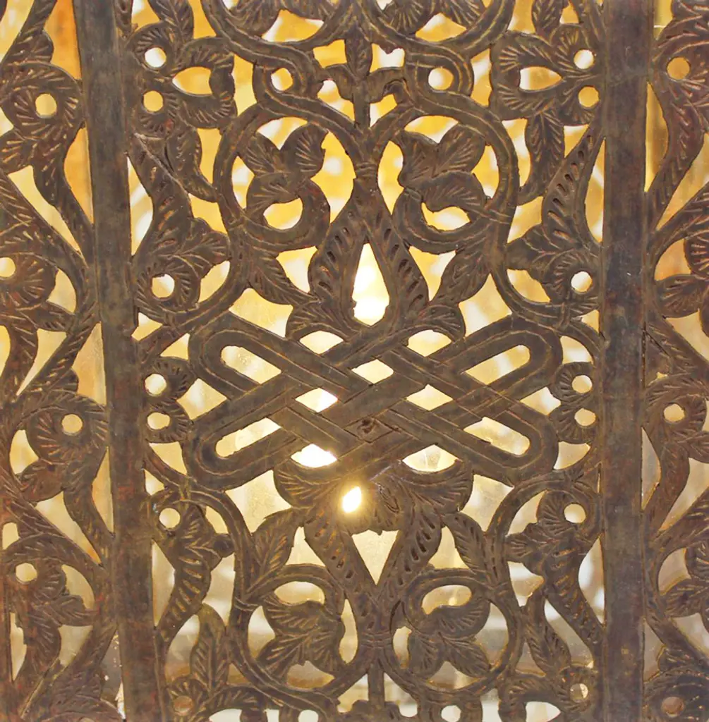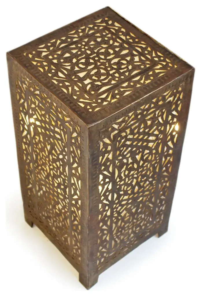 Hand cut brass work cube table or floor lamp. Glass paneling on the inside. Stunning intricate hand etched detail on brass. Comes wired and ready to plug in. 100 watt max fixture. Bulb not included. This item is non-returnable - all sales are final.Bulb Type: 100 watt maxNumber of Bulbs: 1Bulbs Included: 0UL CertifiedChain / Ceiling Plate: N/A