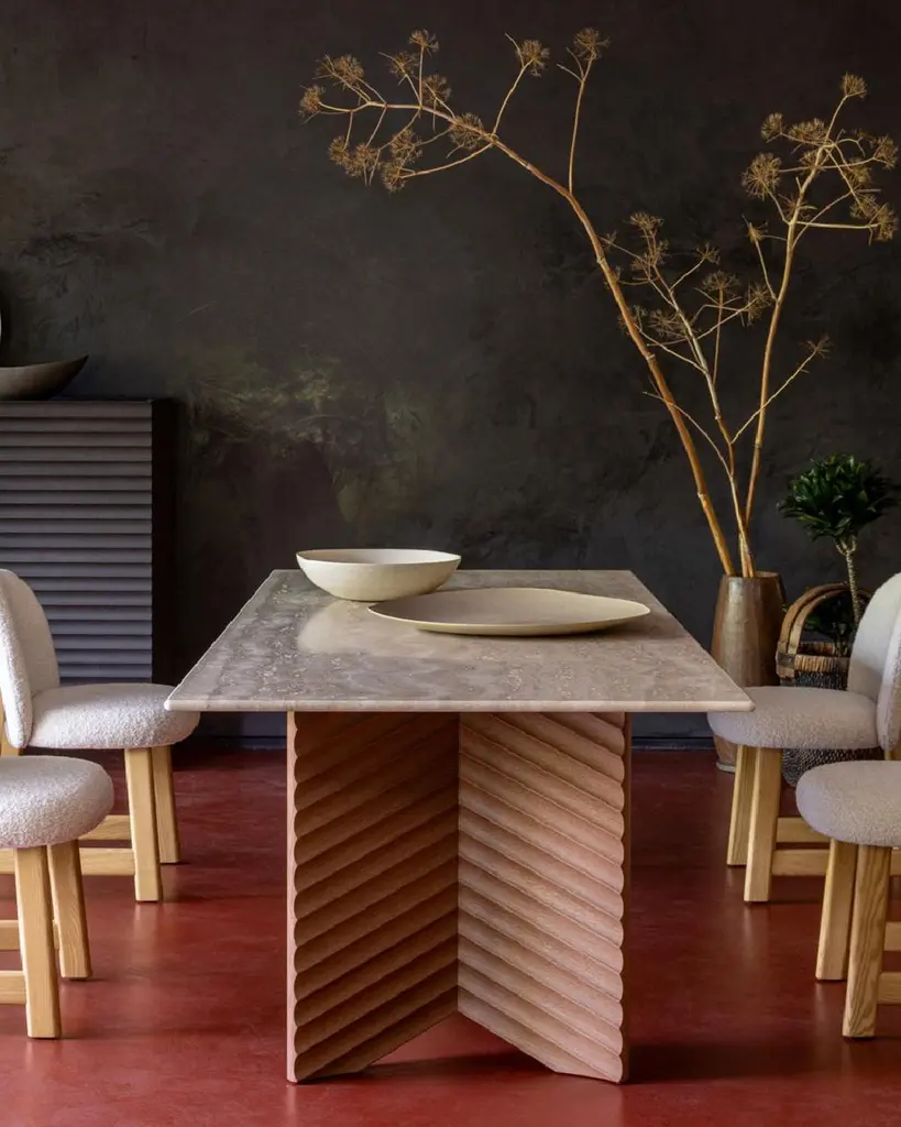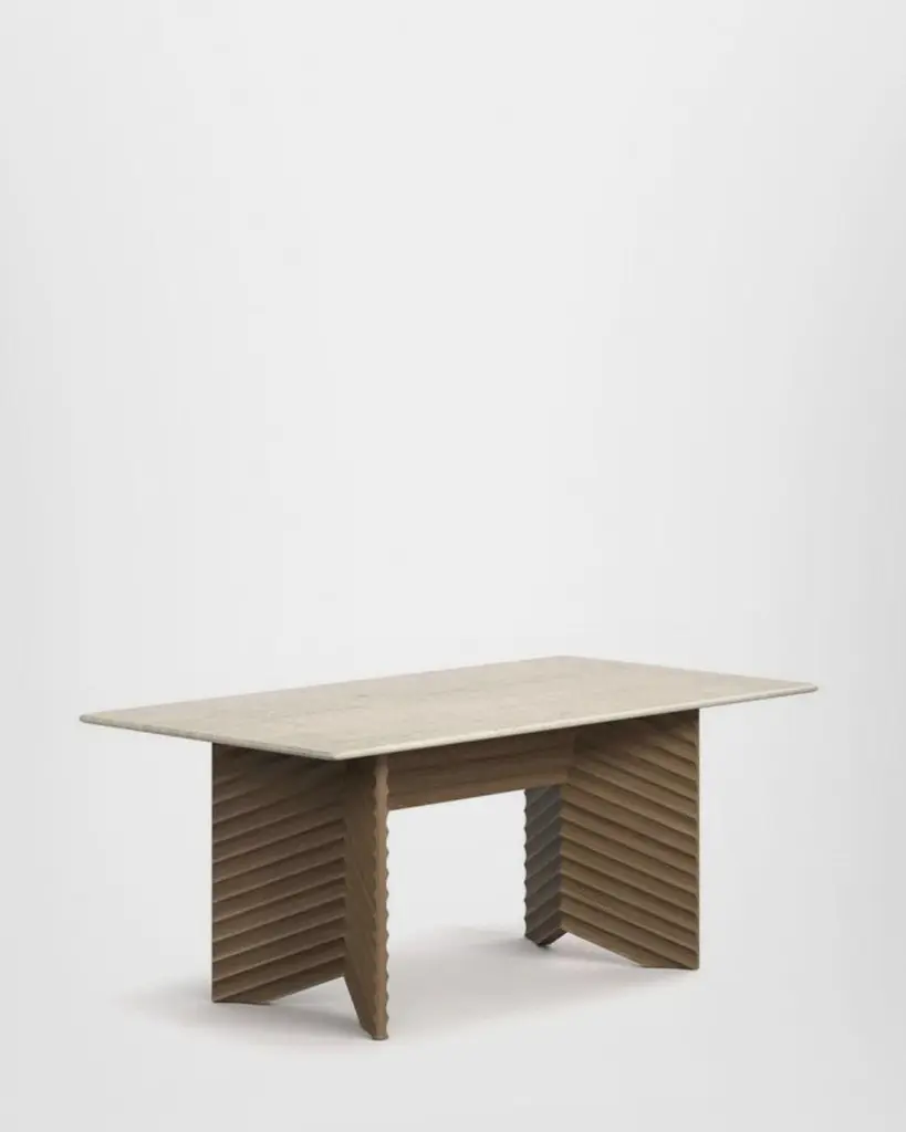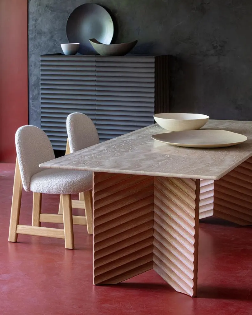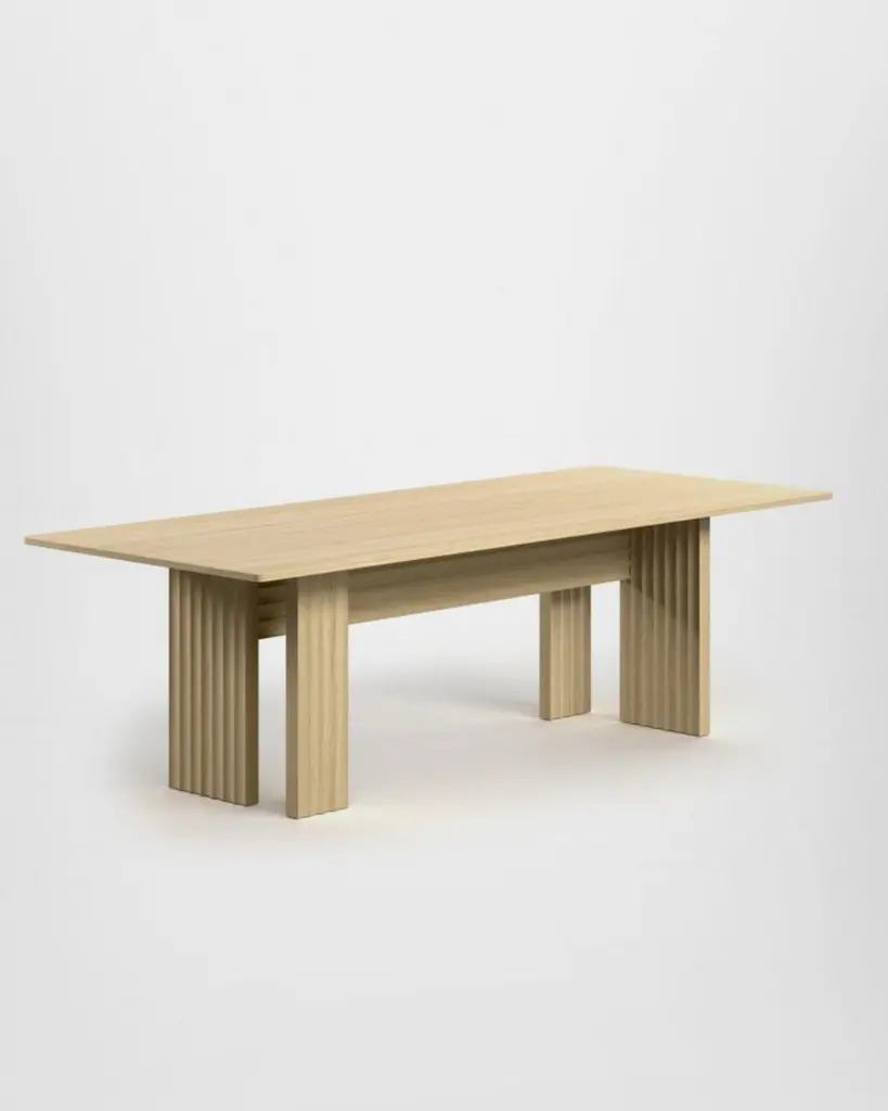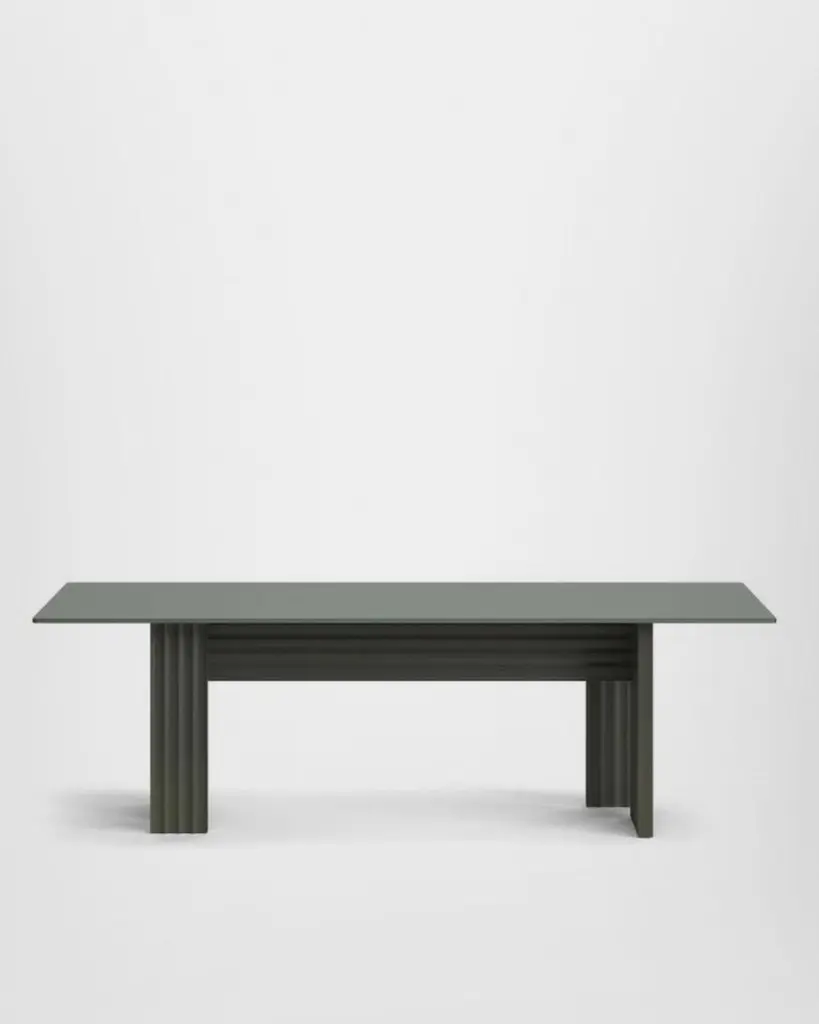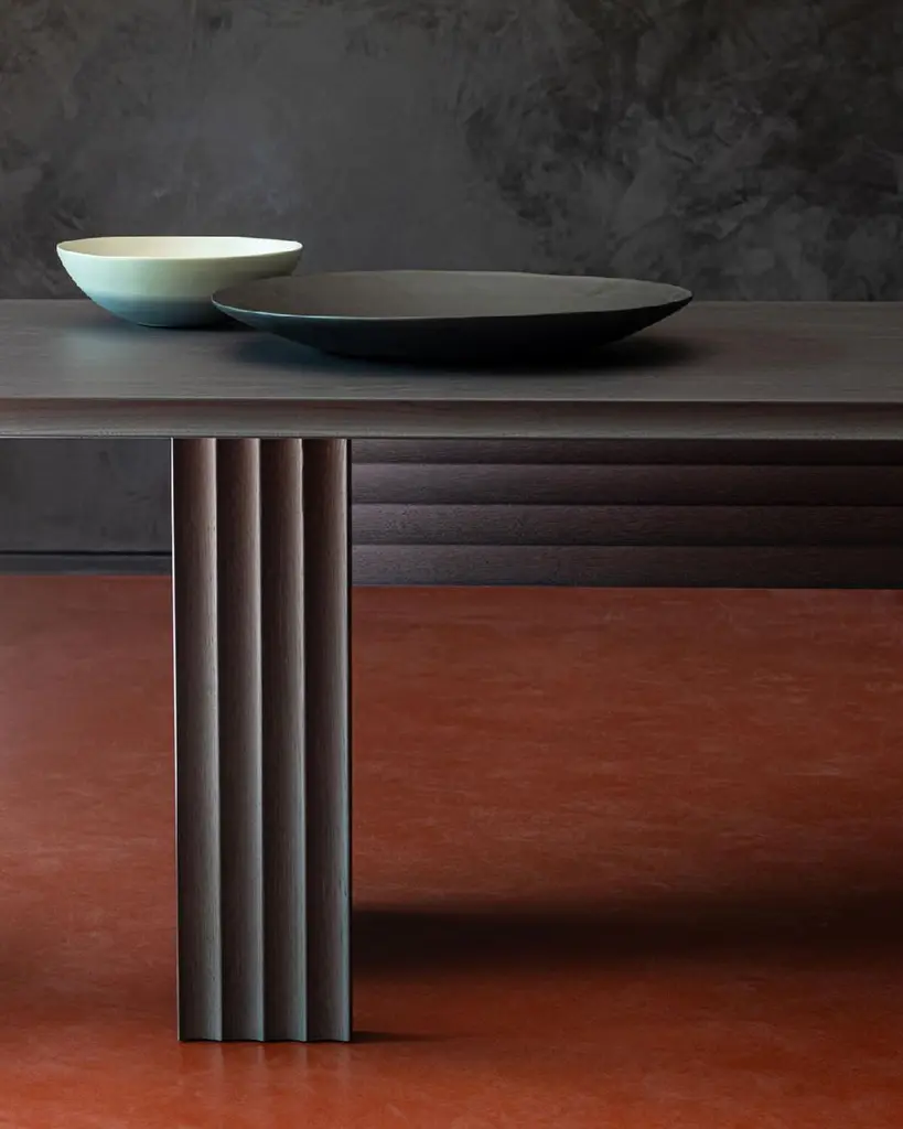 With linear forms and clear-cut symmetries, the Rows collection by Patricia Urquiola is geometrical and minimalist, expressing a refined artistic concept. Doors, side panels and table bases are both formal and decorative. The curved milled edge running the length of the surface is inspired by the nature morte of Amédée Ozenfant, a French writer and painter who founded the Purism movement.Urquiola also conveys the expressivity of form in the two rectangular tables. Both pieces show a strong contrast between the solidity of structure, the graphic effect of the surfaces and the linearity of the table top, available in wood, back-painted glass or marble.The Vertical table, designed with a nod to classical architecture, brings to mind the fluting of a column. The sculpture influence is even more evident in Diagonal, a table whose perpendicular geometry and oblique lines add more movement to the structure.Round version available.Different tops and finishes options available, please inquire with us.DIMENSIONS:Small: W. 180 x D. 95 x H. 74 cmMedium: W. 240 x D. 100 x H. 74 cmLarge: W. 300 x D. 100 x H. 74 cmAvailable in different options, price upon request.