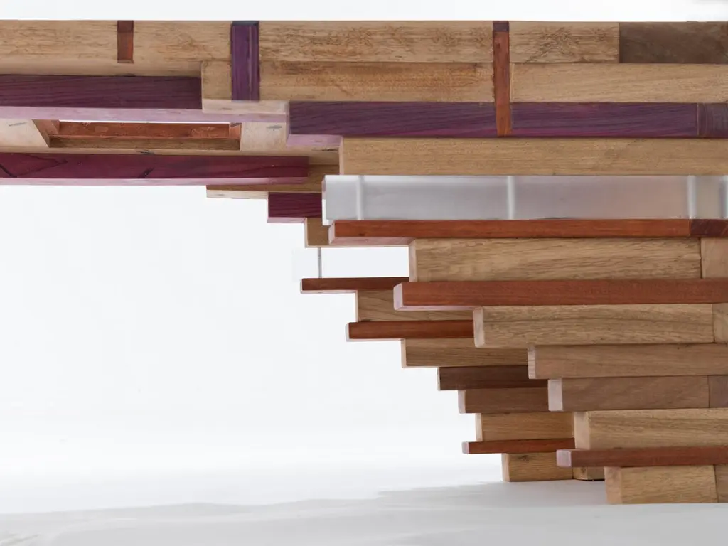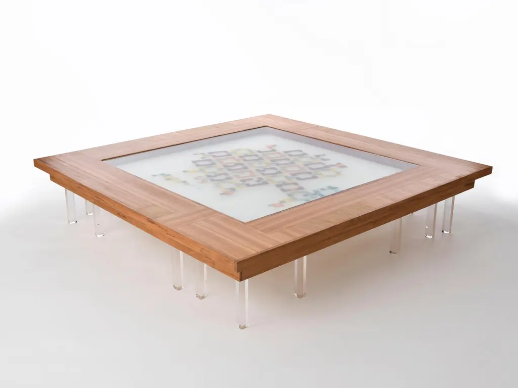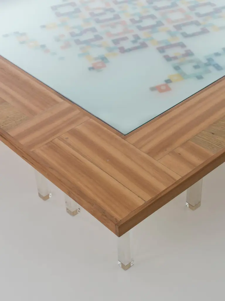 Mosaiced Coffee Table by HillsideoutDimensions: W 150 x D 150 x H 30 cm.Materials: Handcrafted Amazonian Woods, Acrylic, Resin, Glass. Hillsideout is an Italian-German collaboration which combines antique restoration techniques with contemporary mediums. Founded in 2009 by Andrea Zambelli and Nat Wilms, the brand name is a linguistic game related to their vision of furnishings that finds inspiration in an external element from the land by bringing it "out" into interiors.Andrea Zambelli (b. 1978 in Italy) is a professional restorer of furniture with more than 15 years working experience in Bologna dealing with wealthy family heritages dating from the early 17th to the mid 20th centuries. As a designer he believes in a possible re-interpretation of his former profession believing that ancient skills of application, which are slowly disappearing, should be preserved. The insertion of innovative materials using antique manufacturing skills is based on the historical furniture tradition but also renews it at the same time.Nat Wilms (b. 1976 in Germany) is a freelance artist with a degree in Sculpture at the Academy of Fine Arts in Bologna/Italy. She graduated with her thesis about Circular and Linear Time in cultural-visual Anthropology with the art critician Roberto Daolio in 2006. Both during and after her academic formation she took part in multimedia classes at the University of Art in Berlin and has participated in numerous workshops. She is a teacher of multimedia classes and as a conceptualist she developped the brand strategy.Post-Hillsideout: The project Hillsideout contains the production of unique editions made between 2009 and 2022. The creative collaboration ends after more than 12 successful years and the two founders divide for going on with their own projects. The left editions or designs which came out during that period are still for sale though and in production on request, brandmarked and with the usual certificate of authenticity signed by the designers.