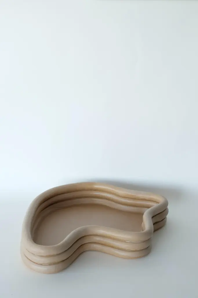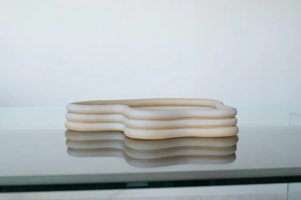 Mother table centerpiece by Sophie ParacheyDimensions: W 37 x D 32 x H 8 cmMaterials: Sand stoneware, mate sage glaze.Inspired by extended stays in Central America, Sophie Parachey’s work questions transformation, the antagonism between the ancestral and the modern, and our relationship to the living world. Sophie intentionally handcrafts her ceramic artwork in stoneware or handpicked clay. Each piece expresses itself with its curves, textures, and resonances. Rough or smooth, they embody a paradoxical realm. Unrefined and primitive forms,reminiscent of organic magma flow, blend with softer, delicate, and more subtle shapes. A new balance seems to emerge from this surprising combination.