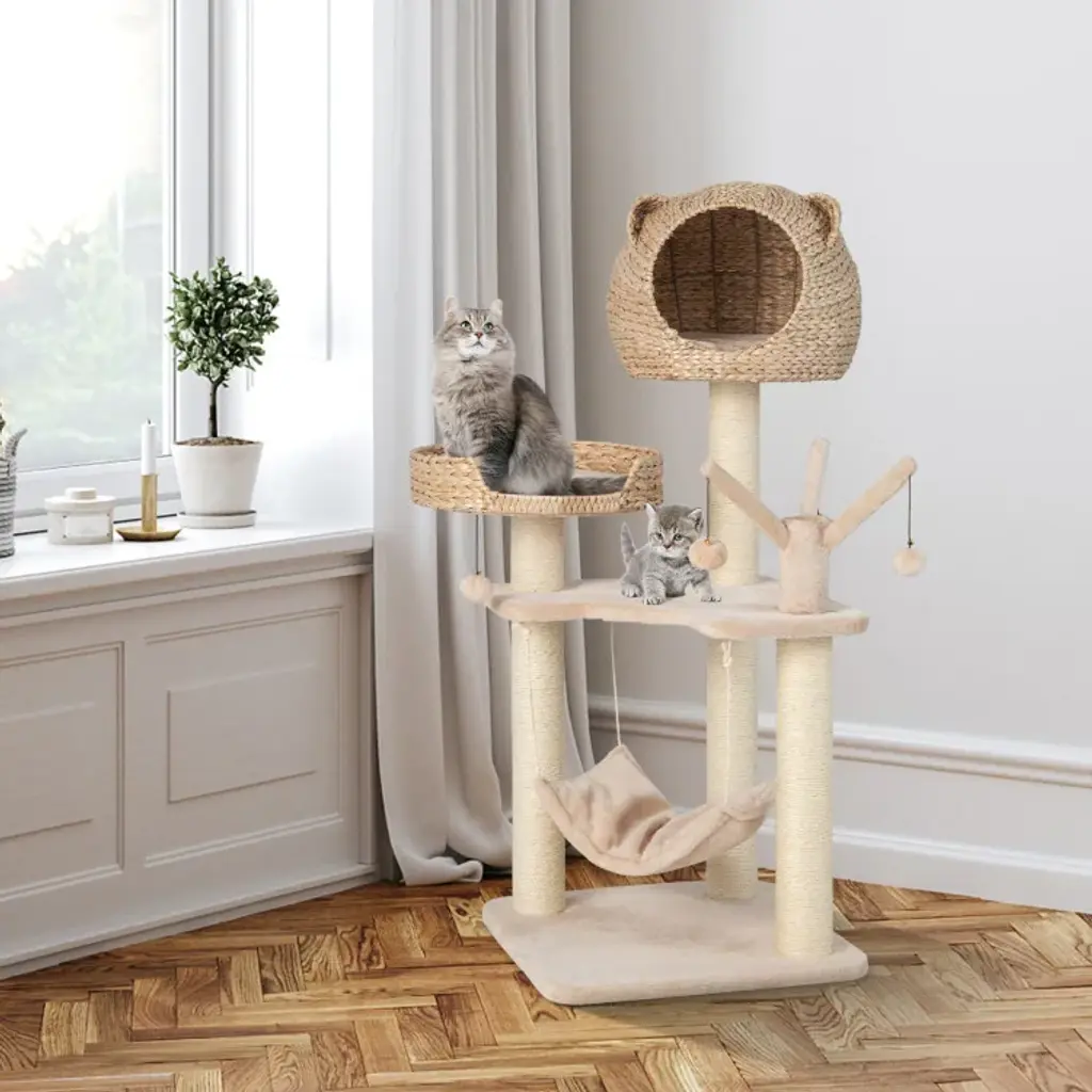 Specification: Color: NaturalMaterial: Cattail Fluff, Sisal Rope, Engineering Board, Plush, Polyester FabricOverall Dimensions: 19.5" x 19.5" x 48" (L x W x H)Size of the Cat Condo: 14.5" x 13" (Dia. x H)Diameter of the Cat Bed: 15.5"Weight Capacity of Each Layer: 33 lbsNet Weight: 23.5 lbs Key Features:● Multi functional Cat Tree: The 5-layer cat tree can be a perfect activity center for your lovely kittens, meeting the needs of exploring, resting, playing, and relaxing. Your furry friends can rest on the large cat bed or in the private condo, play with 4 amusing jingling fur balls, lounge and nap in the comfy hammock, or jump up and down the spacious jumping platform. ● Premium and Durable Material: The cat condo and bed frames are crafted of hand-woven cattail basket, which is comfortable, breathable, and cool. And through fine craftsmanship, the surface is smooth and burr-free. Besides, it comes with ultra-soft and pet-friendly plush cushions, bringing warmth and ultimate comfort to your lovely cats. ● Natural Cat Scratching Posts: Multiple supporting posts are fully wrapped by safe and natural sisal ropes, which can satisfy the instincts of scratching while ensuring the claw's health. The sisal posts can effectively prevent cats from obesity caused by lack of activities, damaging your furniture, or making a mess of the room. ● Sturdy and Stable Structure: The 5-layer activity center is made of thick engineering boards and supported by thick posts, ensuring good sturdiness and stability. And each layer can load up to 33 lbs. In addition, the cat condo is supported by a sturdy metal frame, ensuring safety. ● Gorgeous Looking and Easy Assembly: Combing with aesthetics and practicality, the gorgeous and attractive cat tower will blend into your home decor perfectly as a piece of modern cat furniture. In addition, with the clear illustrations and all parts numbered in the instruction, it is easy and quick to set up. Overview:-Features 5 tiers, satisfy kitten's need to climb and seek different heights -The top cat condo provides a private area to enjoy a long nap -The cat bed with a soft plush cushion provides a soft and comfy lying experience -The hanging hammock allows kittens to lounge or take a nap gently back and forth -Equipped with 4 jingling balls, attract cats' attention and add more fun -The cattail fluff cat condo and bed are breathable, comfy, and durable -The sisal scratching posts allow kittens to release the scratching urge -The posts are covered by natural sisal ropes, safe, durable, and wear-resistant -The big posts and wide base provide strong support and ensure stability -The plush cushion in the cat condo can be removed for easy cleaning -With its cute cat-shaped condo and natural appearance, look charming and stylish -With safe round corners, there is no need to worry about accidental collisions -With its stylish and modern appearance, can be a perfect addition to your home