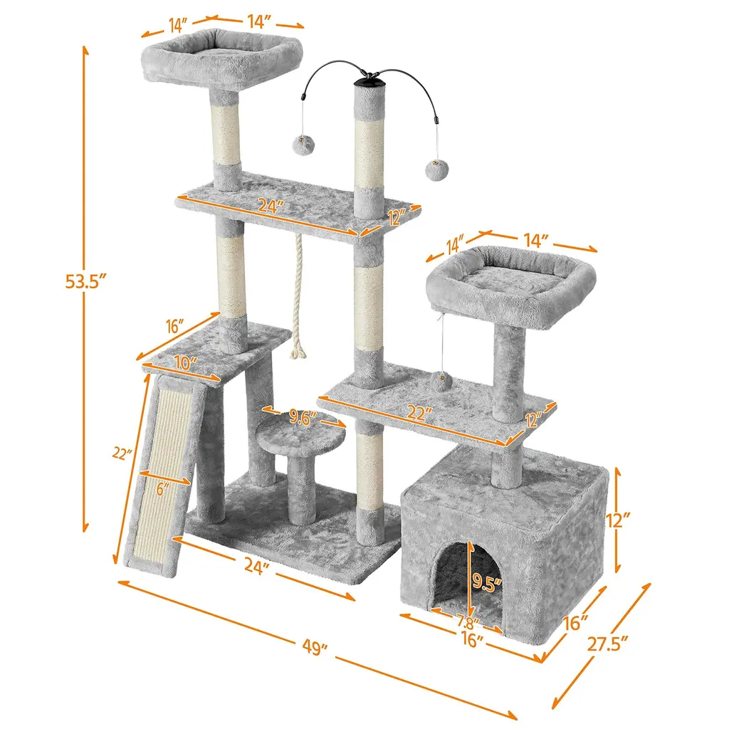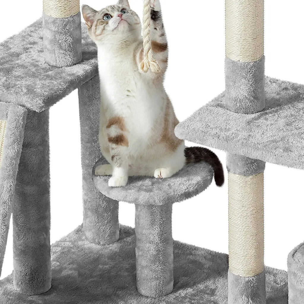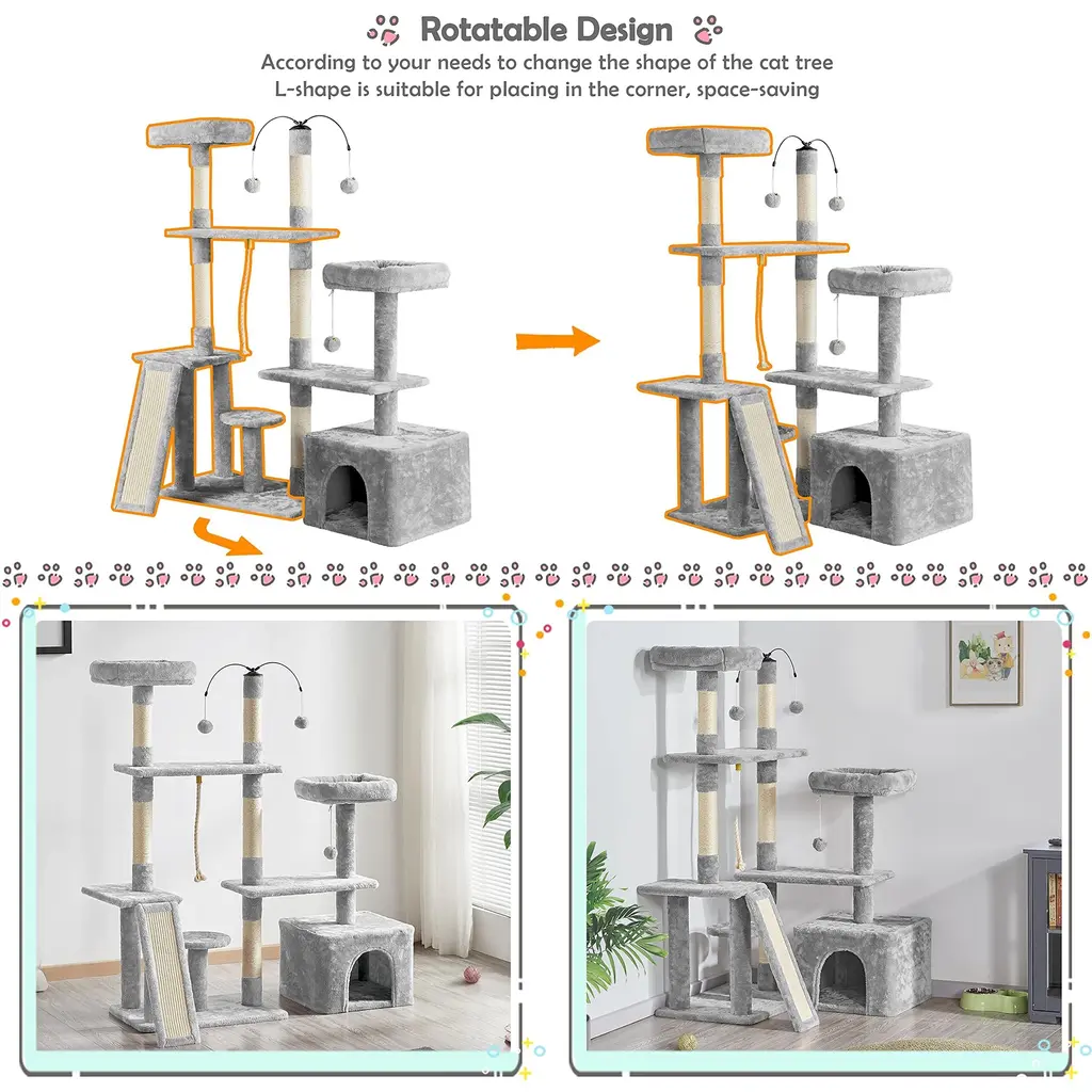 DIRECTION CHANGEABLE: The flexible structure and changeable direction make this cat tree suitable for many places. The right part with a condo of the cat tree can be turned into an L shape. You can put this cat tree against the wall horizontally, or you can put the L-shaped part in the corner at will MULTILEVEL CAT TREE: Boasting multilevel and multifunctional design, this cat tree has different levels and layouts so that your cat will have a good place to sleep, hide and play. Different heights and sizes of perches, platforms, and scratching posts will meet cats' needs for resting, jumping, lounging and scratching PLUSH COVERED: The whole cat tree is mostly covered by soft plush, with several sisal ropes. It is skin-friendly for long-time service life. This large cat tower made from quality materials will company your lovely cat forever PRACTICAL AND DECORATIVE: Our plush cat tree is practical because it has a condo for cat o sleep, perches for cats to rest and view, dangling balls for cats to play and scratching posts for cats to exercise, also, it is decorative due to its easy-to-match color and interesting layout QUALITY MATERIALS: The cat tree has durable particleboard and a soft plush surface to offer cats strong support and a comfy feeling. Owning this plush cat tree at home, your cat won't feel bored even without your company