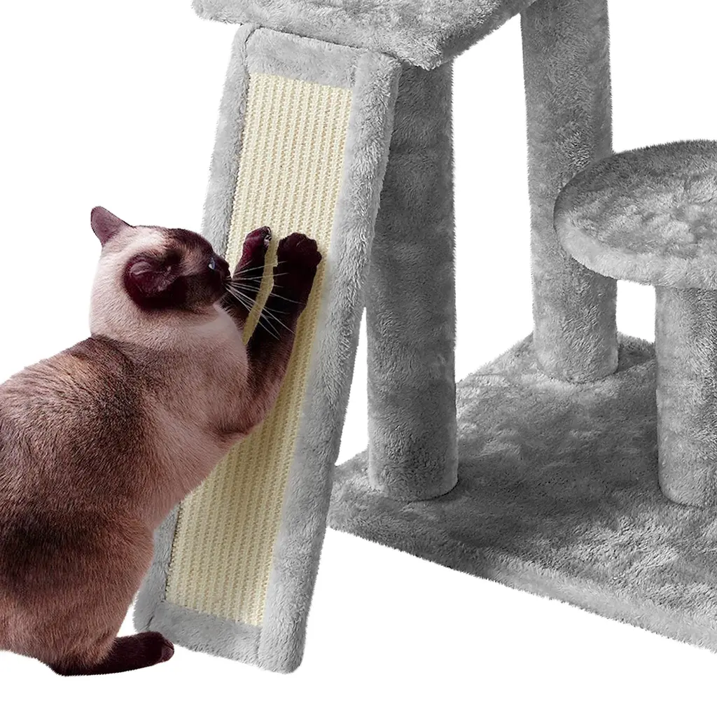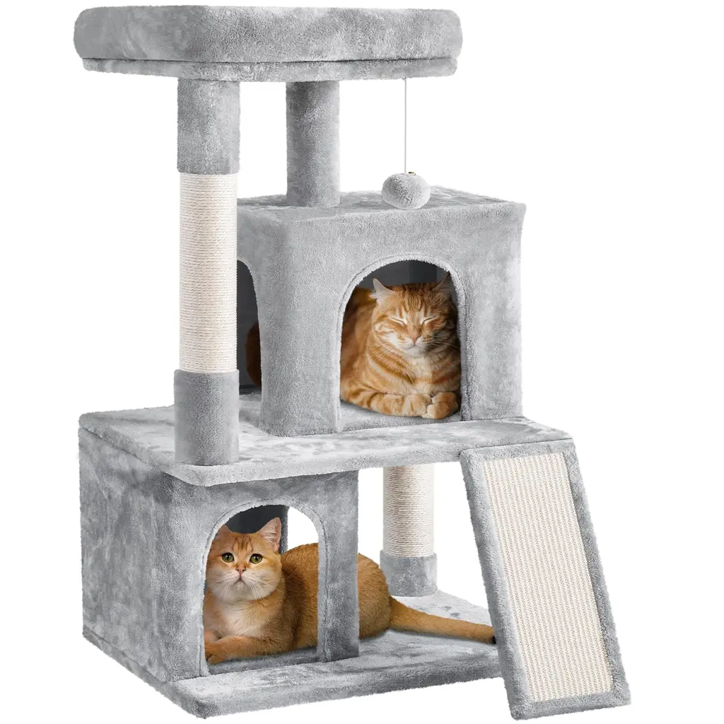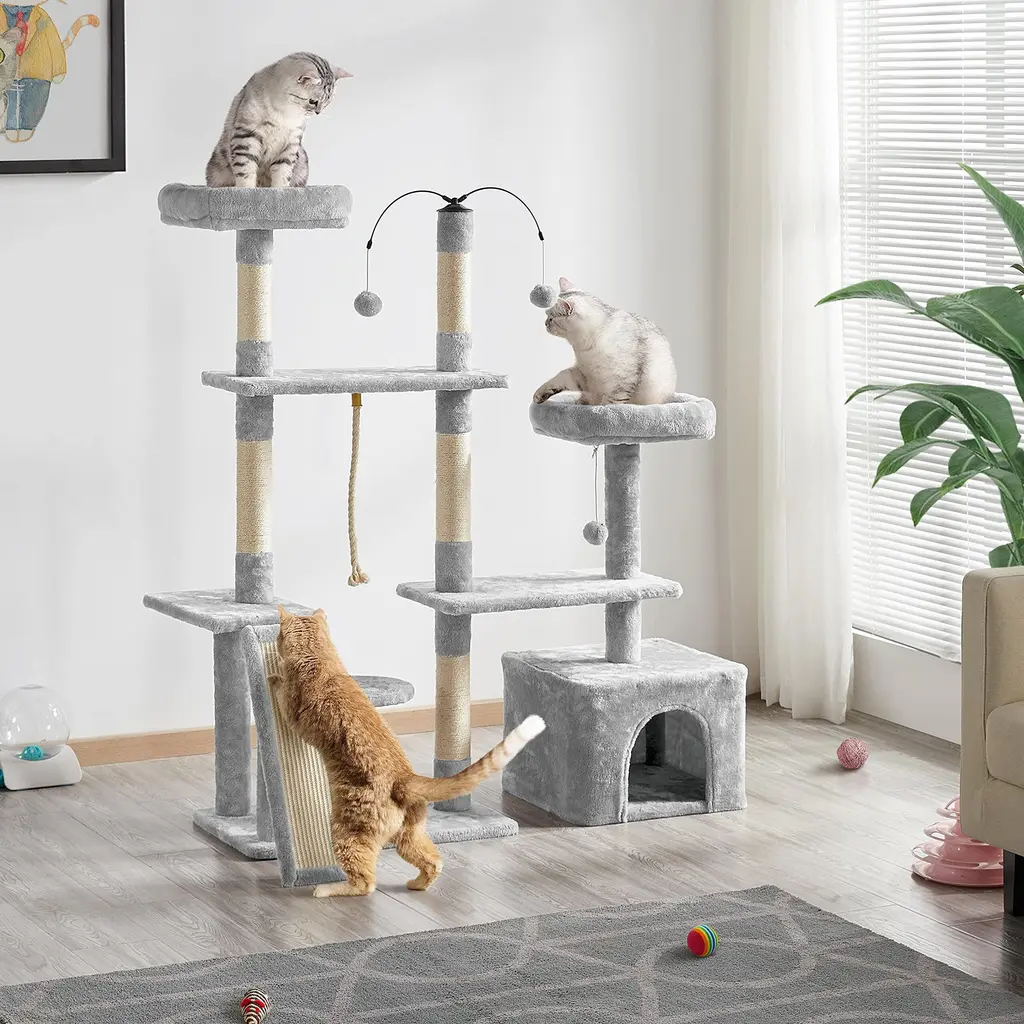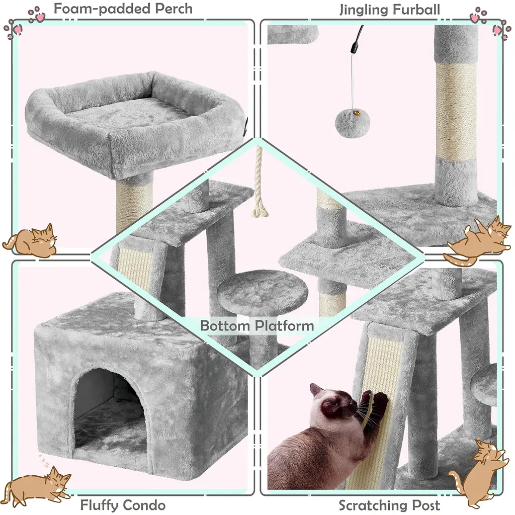 DIRECTION CHANGEABLE: The flexible structure and changeable direction make this cat tree suitable for many places. The right part with a condo of the cat tree can be turned into an L shape. You can put this cat tree against the wall horizontally, or you can put the L-shaped part in the corner at will MULTILEVEL CAT TREE: Boasting multilevel and multifunctional design, this cat tree has different levels and layouts so that your cat will have a good place to sleep, hide and play. Different heights and sizes of perches, platforms, and scratching posts will meet cats' needs for resting, jumping, lounging and scratching PLUSH COVERED: The whole cat tree is mostly covered by soft plush, with several sisal ropes. It is skin-friendly for long-time service life. This large cat tower made from quality materials will company your lovely cat forever PRACTICAL AND DECORATIVE: Our plush cat tree is practical because it has a condo for cat o sleep, perches for cats to rest and view, dangling balls for cats to play and scratching posts for cats to exercise, also, it is decorative due to its easy-to-match color and interesting layout QUALITY MATERIALS: The cat tree has durable particleboard and a soft plush surface to offer cats strong support and a comfy feeling. Owning this plush cat tree at home, your cat won't feel bored even without your company