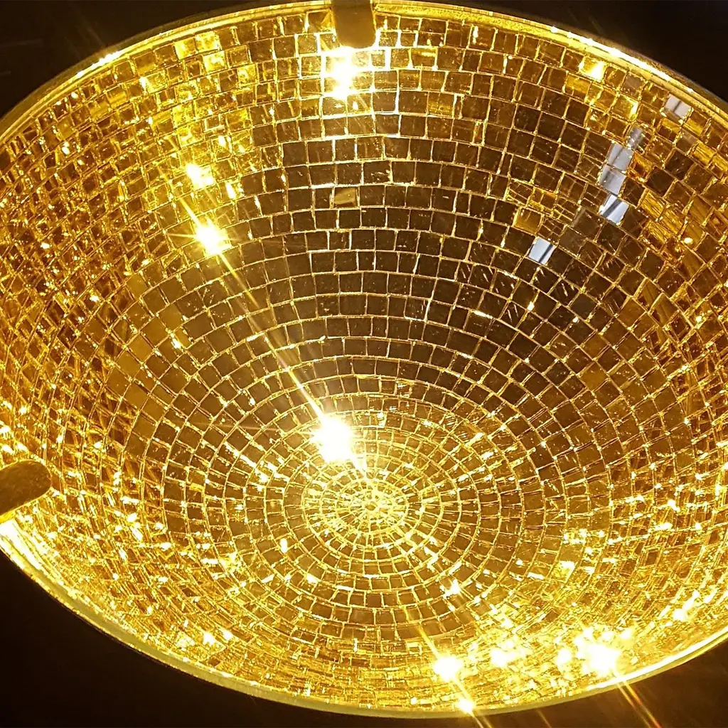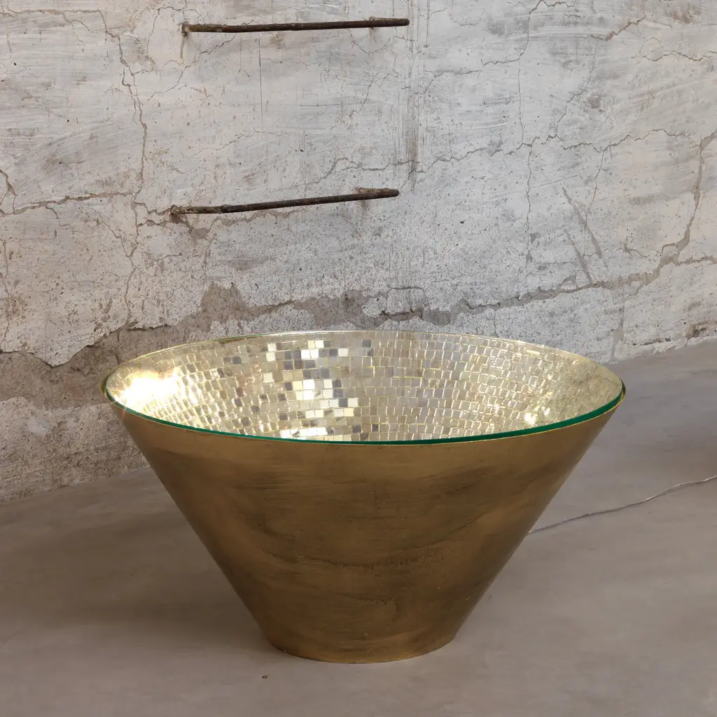 Expertly handcrafted and hand-finished, this table features a cone-shaped iron frame painted in antique satin gold and entirely decorated inside with a mosaic of gold mirrored glass tiles. The mosaic is meticulously constructed by assembling each tile one-by-one to create diffused reflections that emerge with alluring visual effect. This table is also available in two other sizes (Ø50 x H45 cm and Ø60 x H60 cm). Complete with a clear glass top, this unique piece is a welcome addition to a contemporary foyer, living room, or commercial setting.