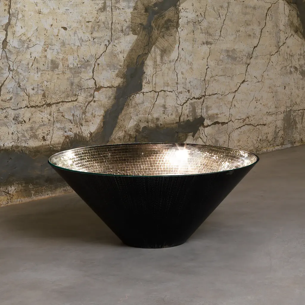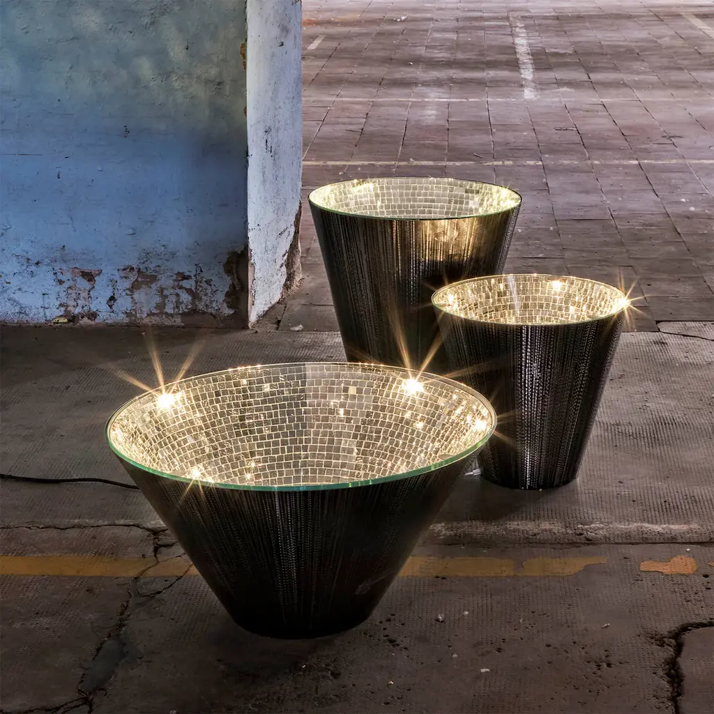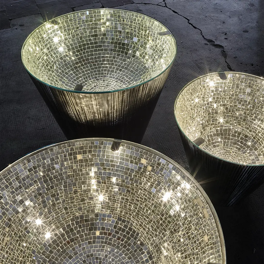 This statement-making table from the Narciso Collection is a unique combination of classic and modern that will infuse a warm and inviting ambiance as well as deliver a glamorous look in a modern living room. The cone-shaped frame of brushed iron is topped with clear glass that showcases the stunning mosaic of silver mirrored glass tiles inside in all its shimmering allure. Available also in a gold finish and the following dimensions (in cm): d 50 x H45, d60 x H60, d100 x H40, and d120 x H82.
