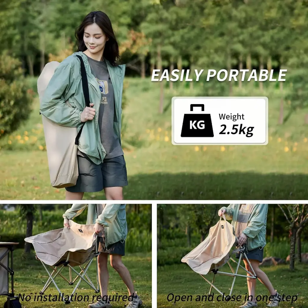 This folding camping chair can bear a load of 110kg and comes with a portable storage bag, making it easy for you to take it to camping, picnics, fishing, the beach, or wherever you need it. Do not exceed the maximum weight capacity of 110 kg. This chair is not intended for use by children. Always unfold and lock the chair completely before use. Keep the chair away from heat sources and open flames.