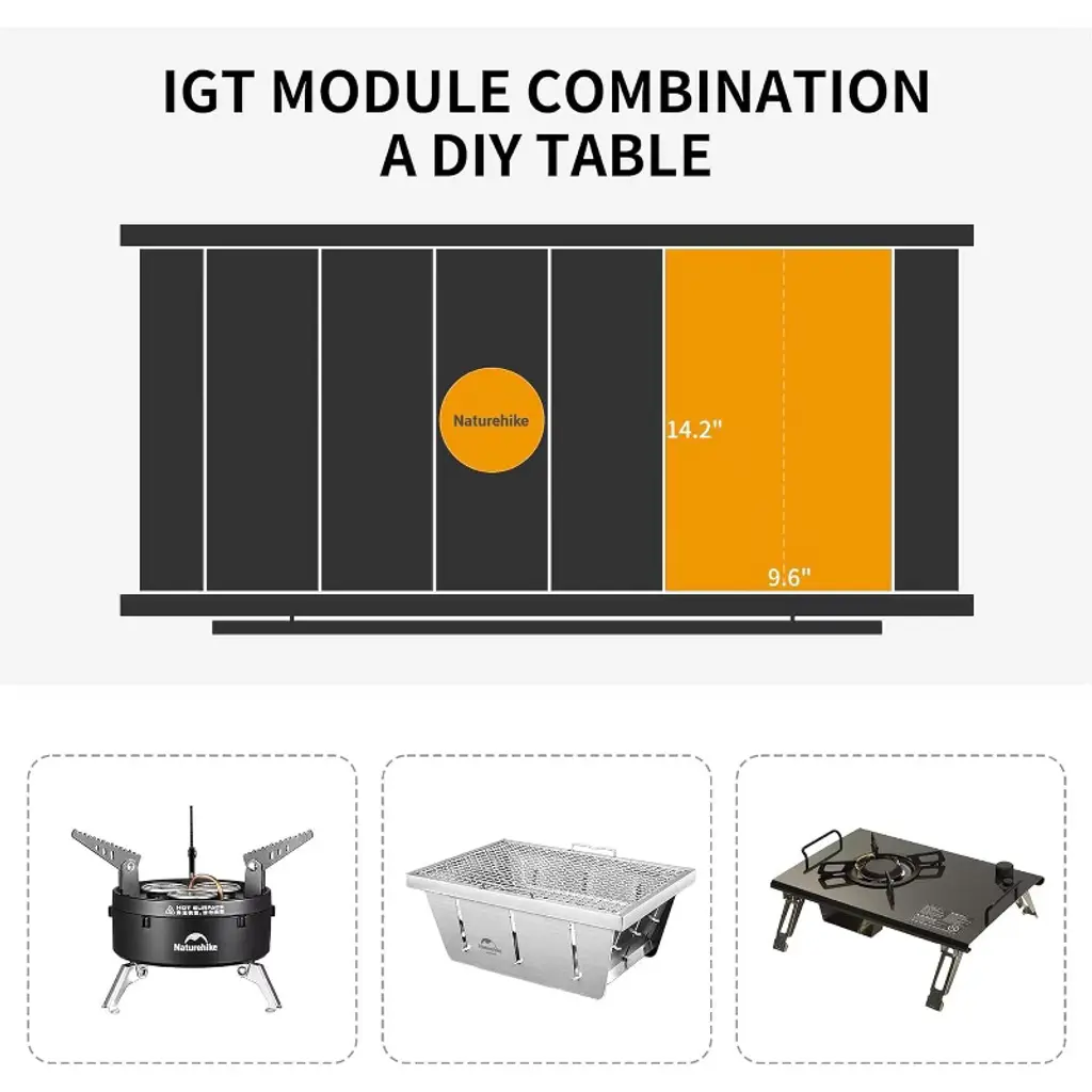 The Naturehike Folding IGT Camping Table is a versatile and portable outdoor cook system designed for camping, picnics, and RV trips. Featuring a modular IGT system, it allows for multiple cooking combinations with grills and stoves. The easy folding design enables quick setup, and its compact size makes it effortless to carry. Crafted from lightweight 6063 aluminum, it offers excellent durability while supporting up to 220 lbs. With thoughtful details like a hanging rod and a stove module, this table is perfect for car camping, BBQs, and outdoor adventures.