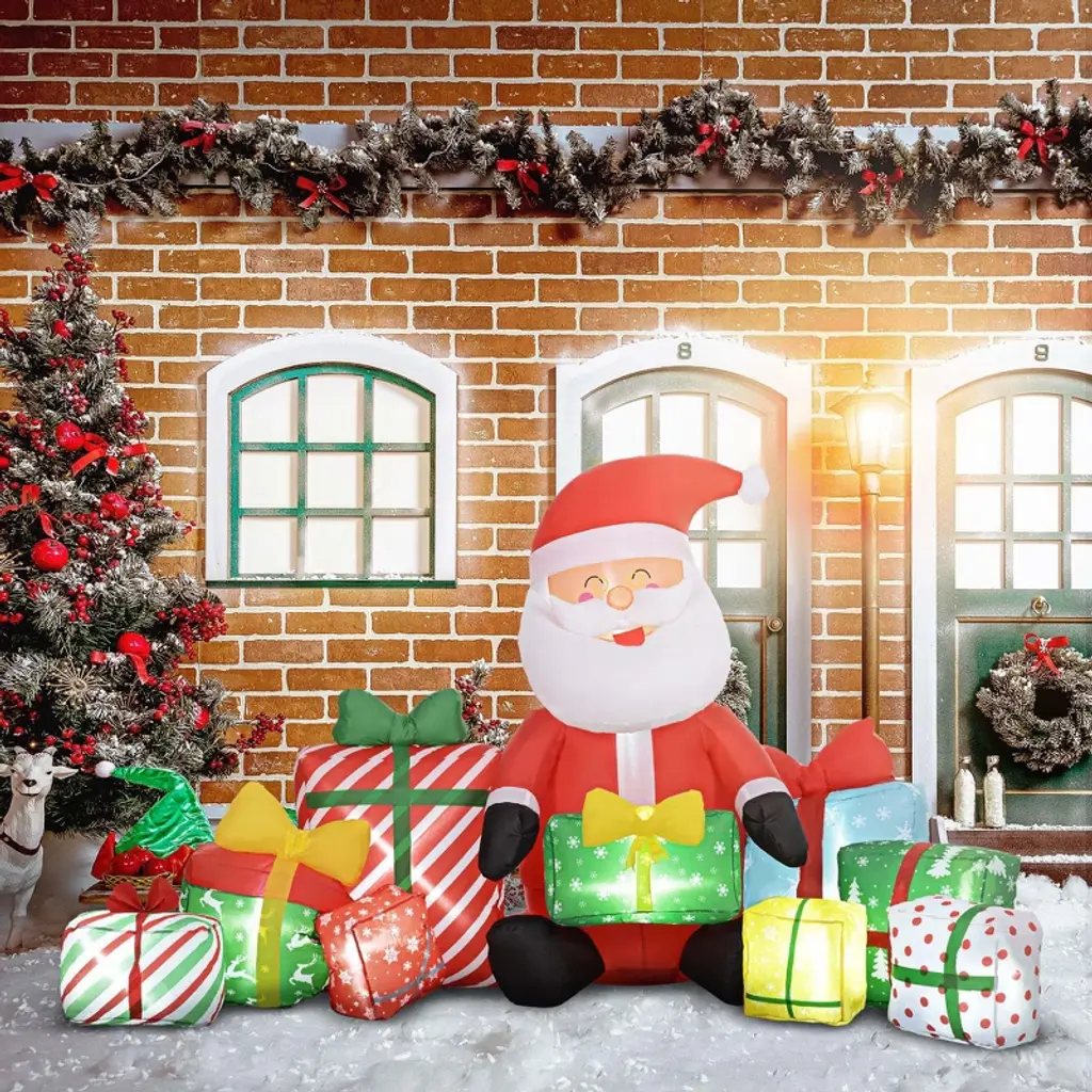 NAYSAYE brings holiday spirit to your outdoor celebrations with this inflatable Santa Claus holding gift boxes. Designed to add festive charm this decoration creates a joyful atmosphere in any yard or garden. Equipped with suction cups drawstrings and a sandbag it stays secure in mild weather. Easy to set up this cheerful inflatable welcomes family friends and neighbors to share in the warmth and magic of the season.