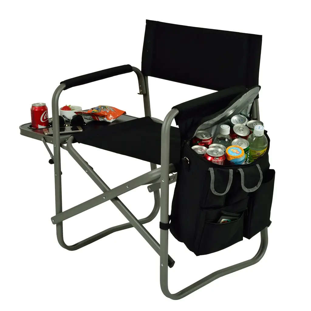 PICNIC LIFETIME WARRANTY at ASCOT USA - Designers and manufacturers for over 25 years of a wide range of high quality picnic baskets, coolers, wine carriers and lifestyle products Comfortable ergonomically designed folding sports chair with convenient folding side table with cup holders for bottles, wine glasses and coffee cups, ideal for picnic, beach, fishing and camping High quality 600 denier polyester canvas padded seat, armrests and backrest. Heavy duty rectangular aluminum frame for stability on soft floors, with powder coated grey finish. Extra wide 21.5 inch seat for comfort, holds up to 300 lbs. - Hanging side organizer with multiple pockets for sunglasses - magazines, etc. with insulated bottle holder, side table holds up to 10 lbs, for food and drinks Easy to carry with an adjustable shoulder strap or use the two sewn-in handles. The seat weighs 8 lbs. and folds for storage. Dimensions: 32"H x 24.5"W x 19.5"D
