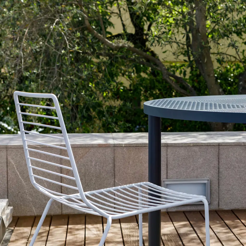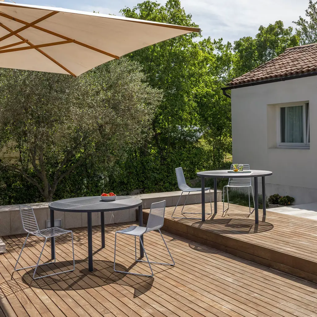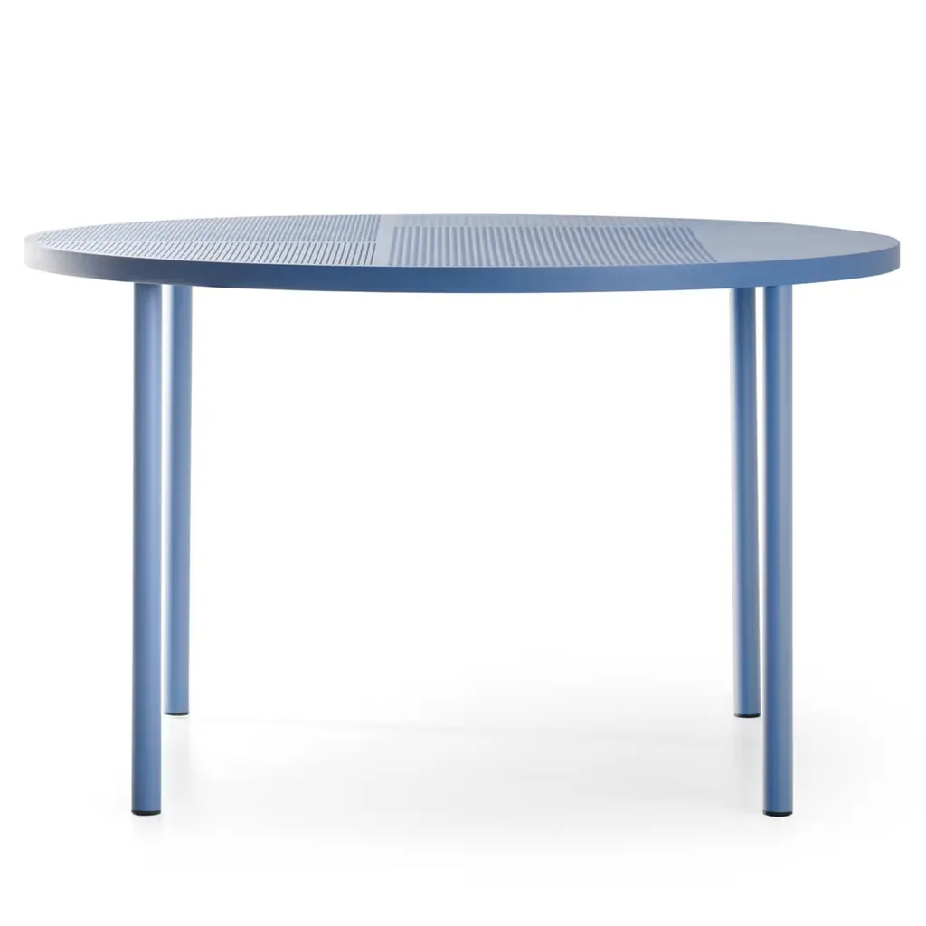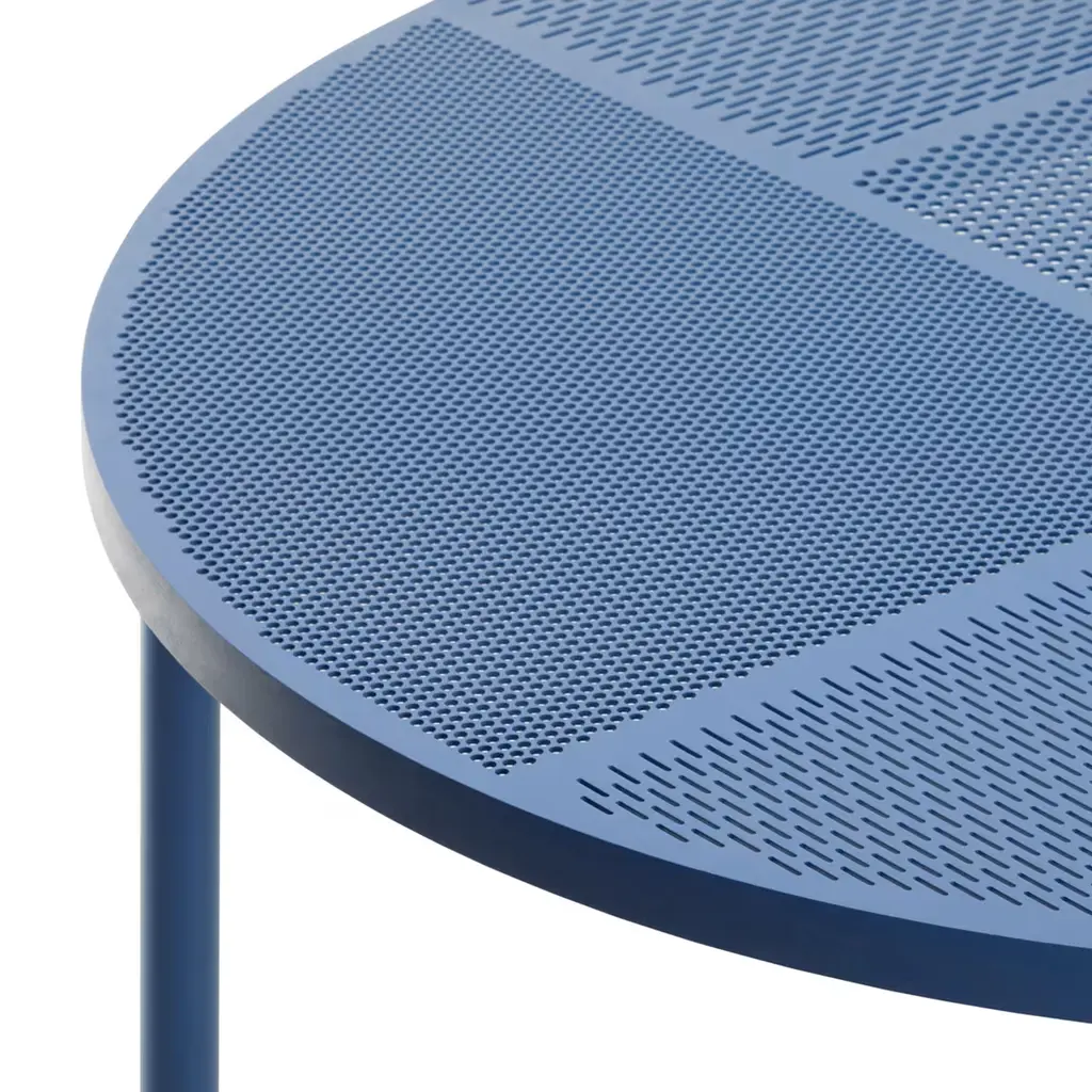 This essential table in blue-lacquered metal makes for a spot-on addition to modern patios or terraces for a quick lunch or a relaxed breakfast. The round top is fashioned from a color-matching metal sheet with pierces organized in a puzzle of geometric shapes. Cylindrical legs ensure impeccable support while the polypropylene feet (adjustable) guarantee a steady floor grip.