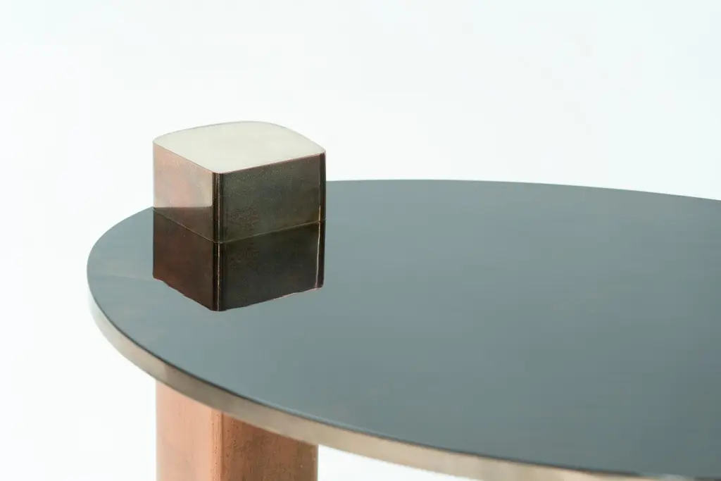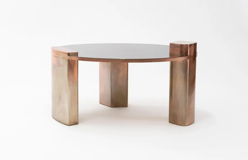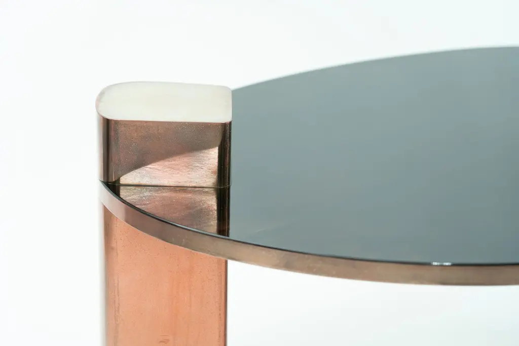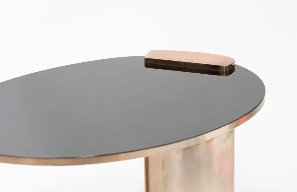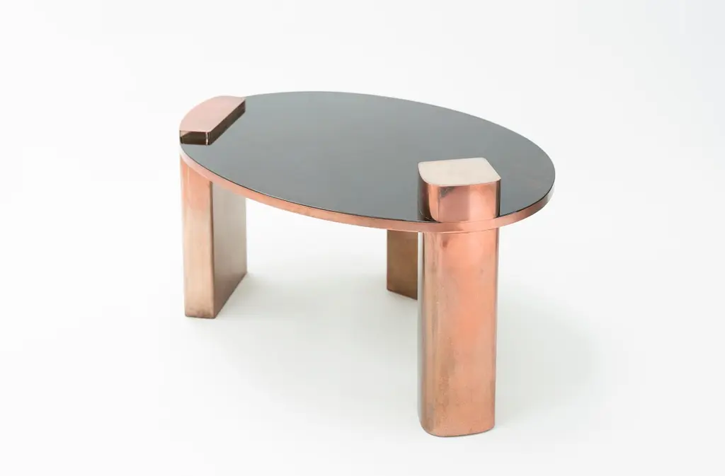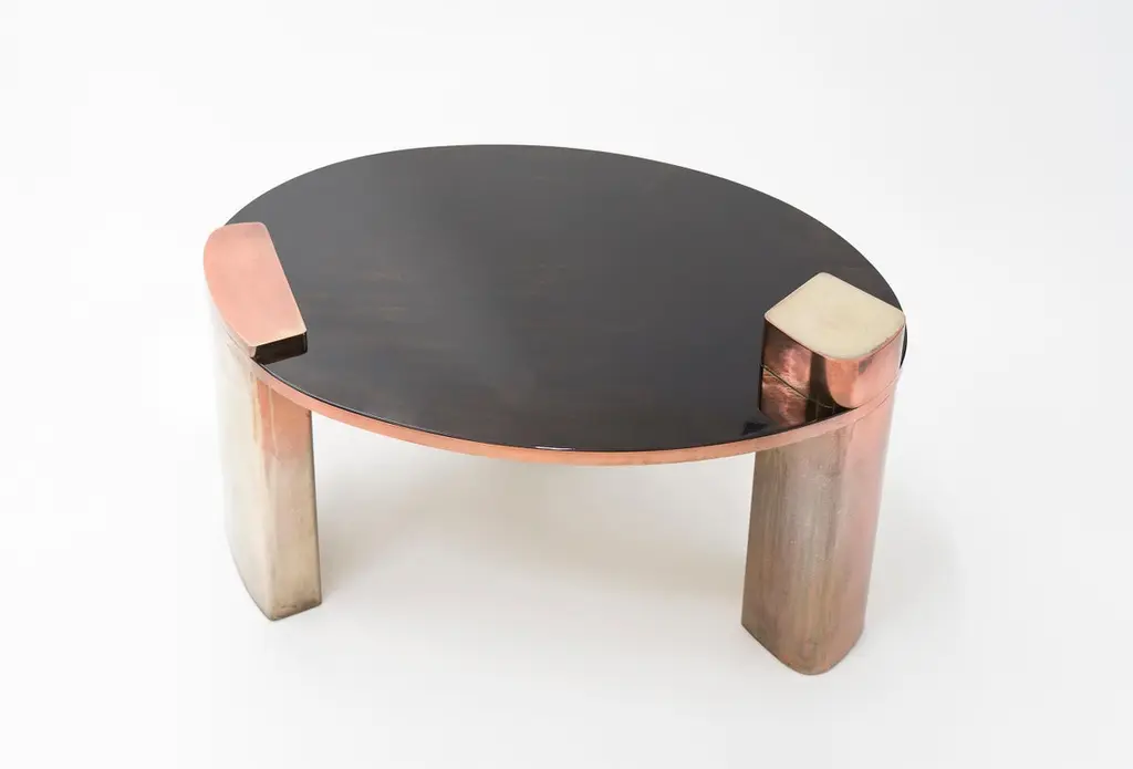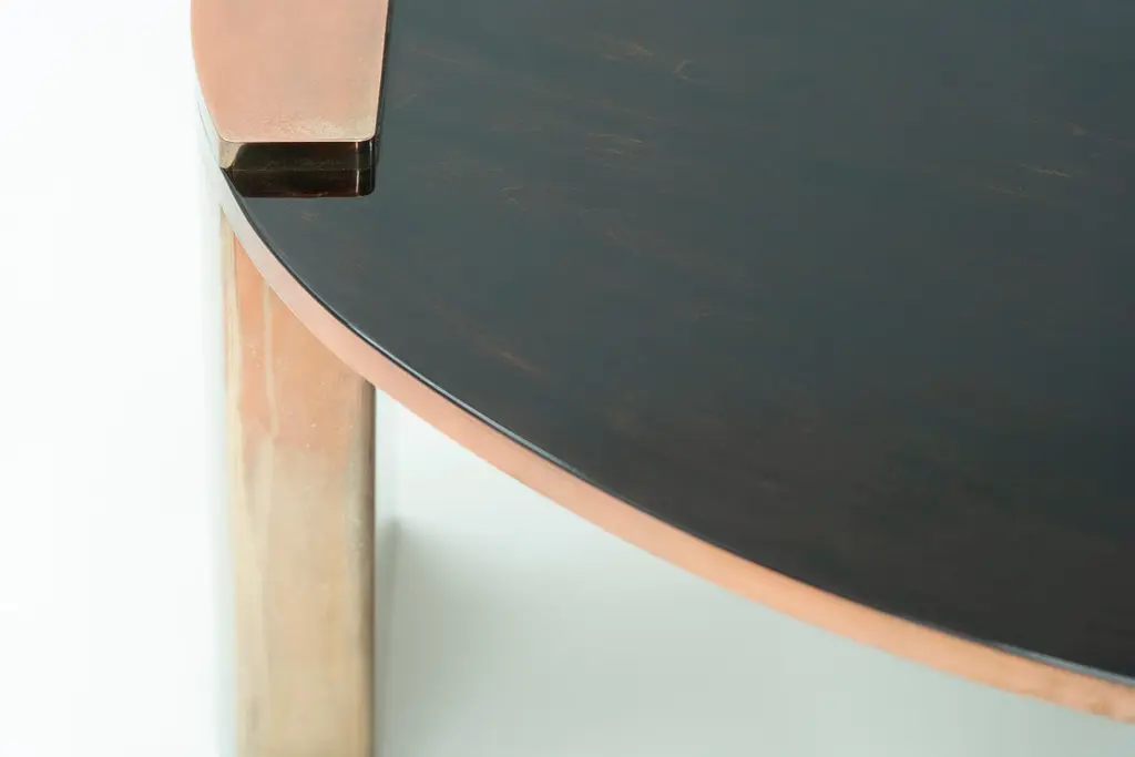 New Moon–21st century lacquered mahogany and silvered copper luxury low tableOur attraction to the Moon is not slighter than the witnessed obsession with our pale satellite from the fading past to every new sunset reborning. Our last table from the MOON collection inevitably takes the name NEW MOON, as her silvered crescent legs surrounding the dark face top of the table marries with the image of a new moon in the night sky. Materials & techniques:Legs: silvered copperTop: highly polished multiple layers of pigmented lacquered mahogany veneerFully customizable.