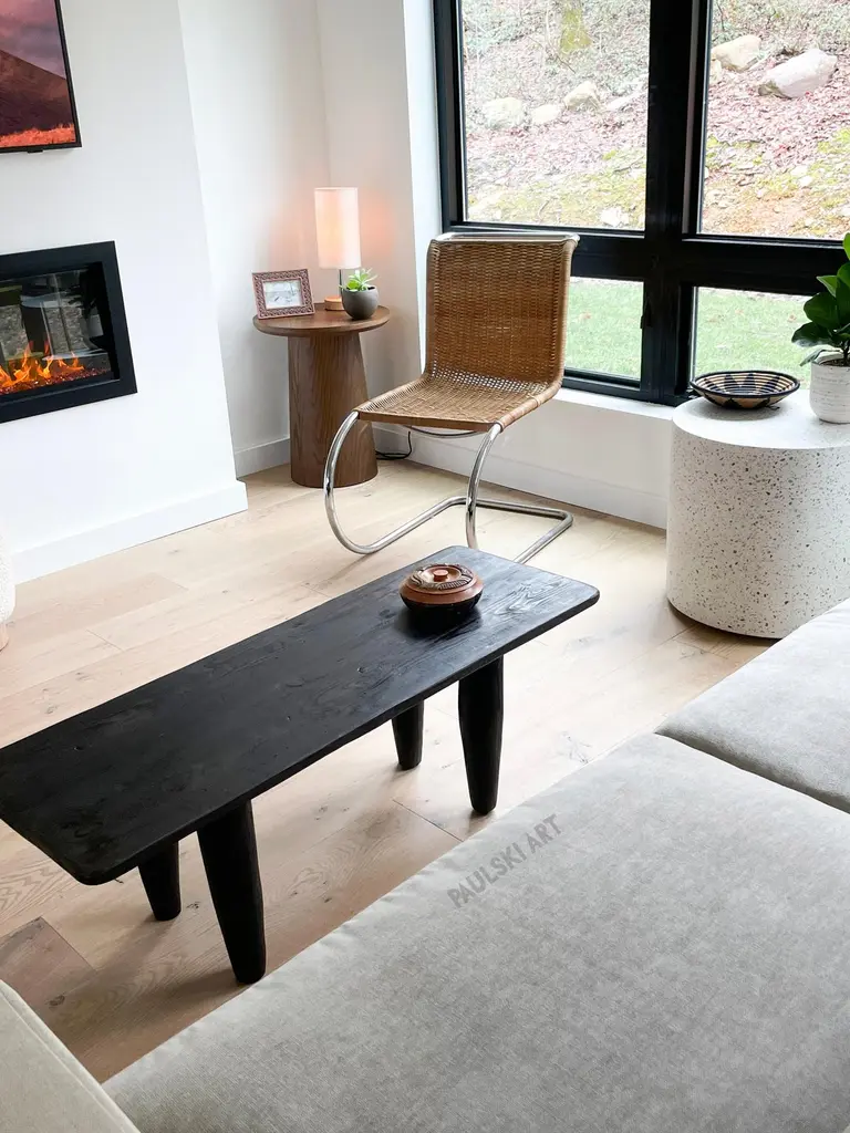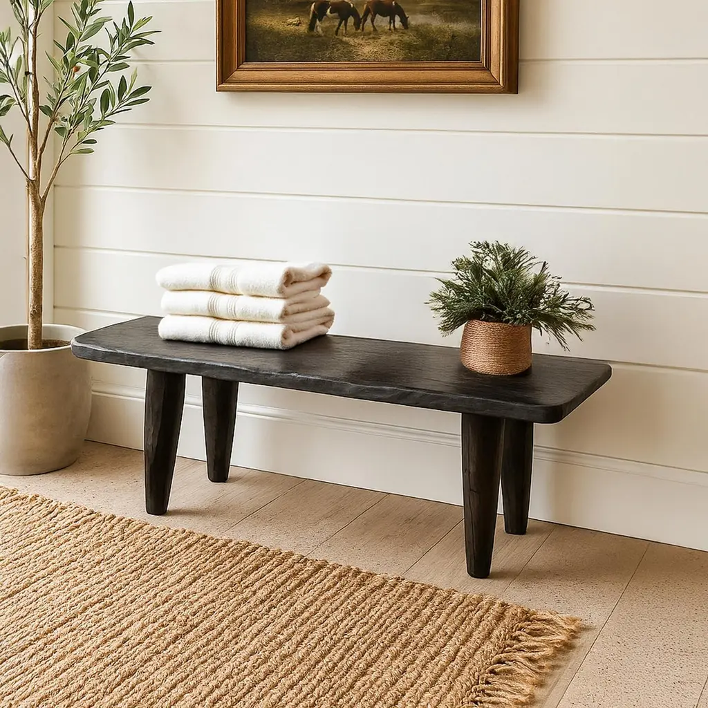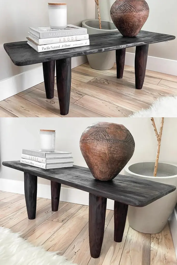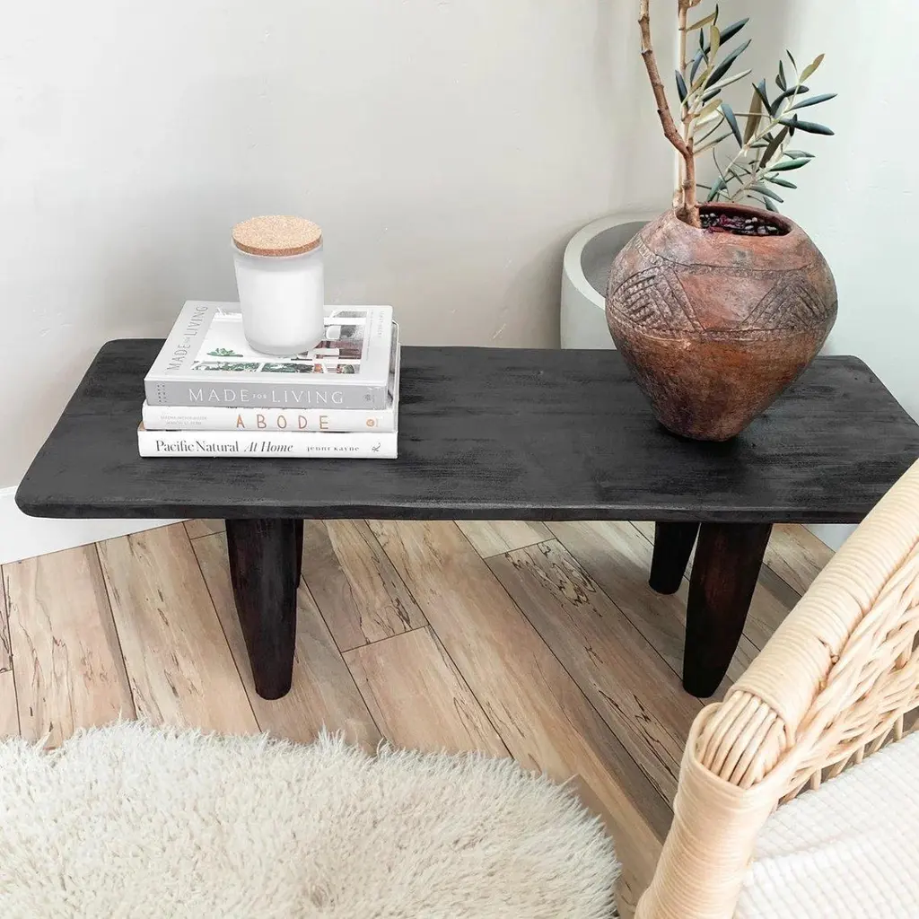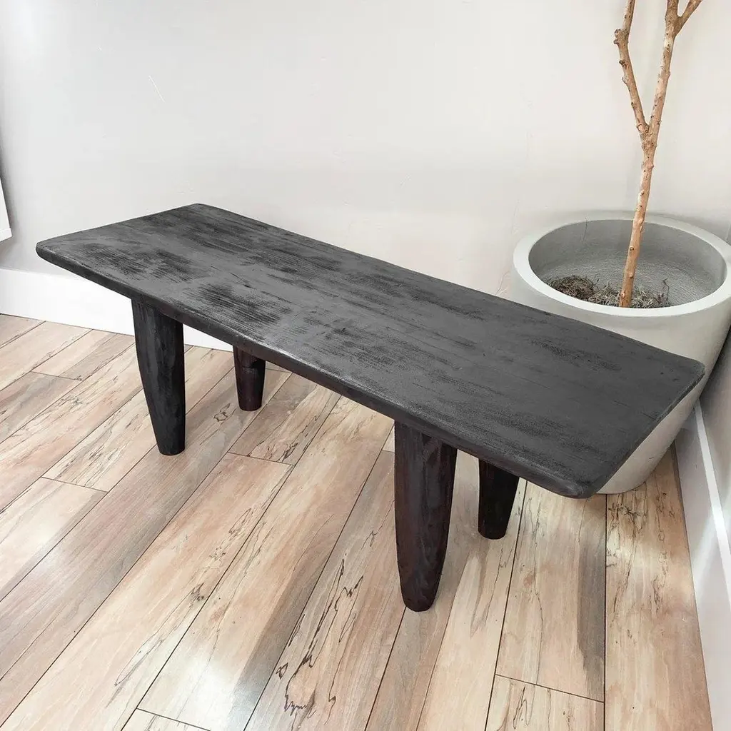 Handcrafted by our in-house team, this African Senufo-inspired bench takes cues from our antique collection, blending rustic charm with modern elegance. Each piece is lightweight, beautifully crafted, and features natural imperfections like slight chips, cracks, and subtle stain variations—adding authentic character. Each bench is finished in a dark walnut paint with a satin finish.DIMENSIONS: Width: 41" x Depth: 15" x Height: 15"DETAILSColor: Espresso Black FinishMaterial: Lightweight Spray finish with applied satin finishVersatile: Use as a coffee table or corner benchSHIPPING AND RETURNS (No International Shipping)Processing time: 5 business daysShipping: UPS GroundReturns: 14 days from delivery, customer covers return costs