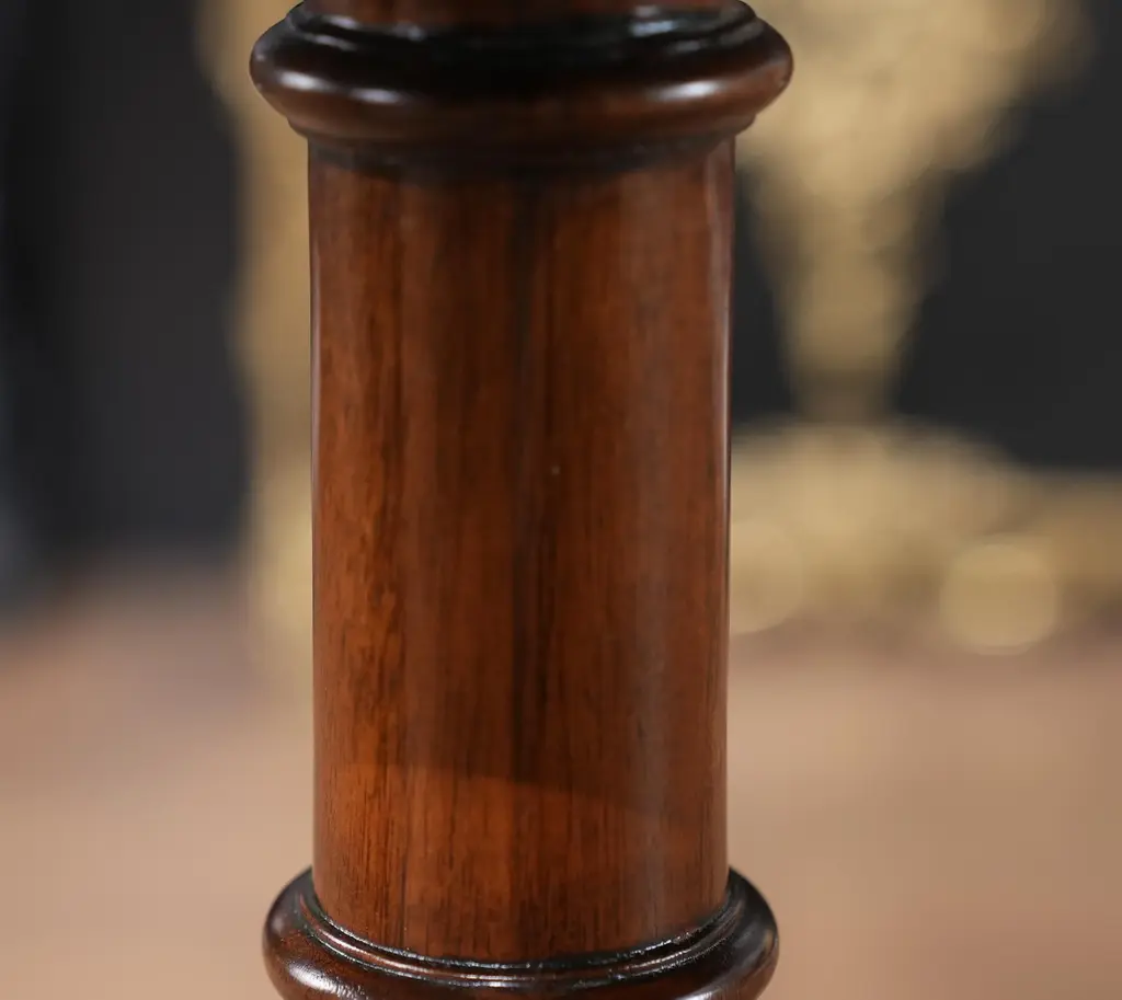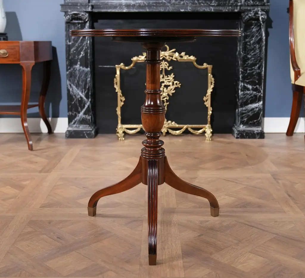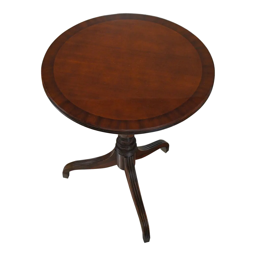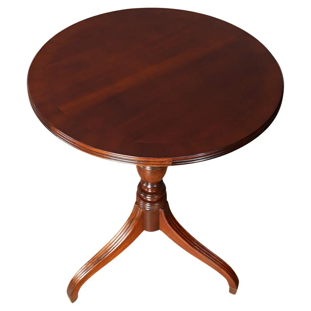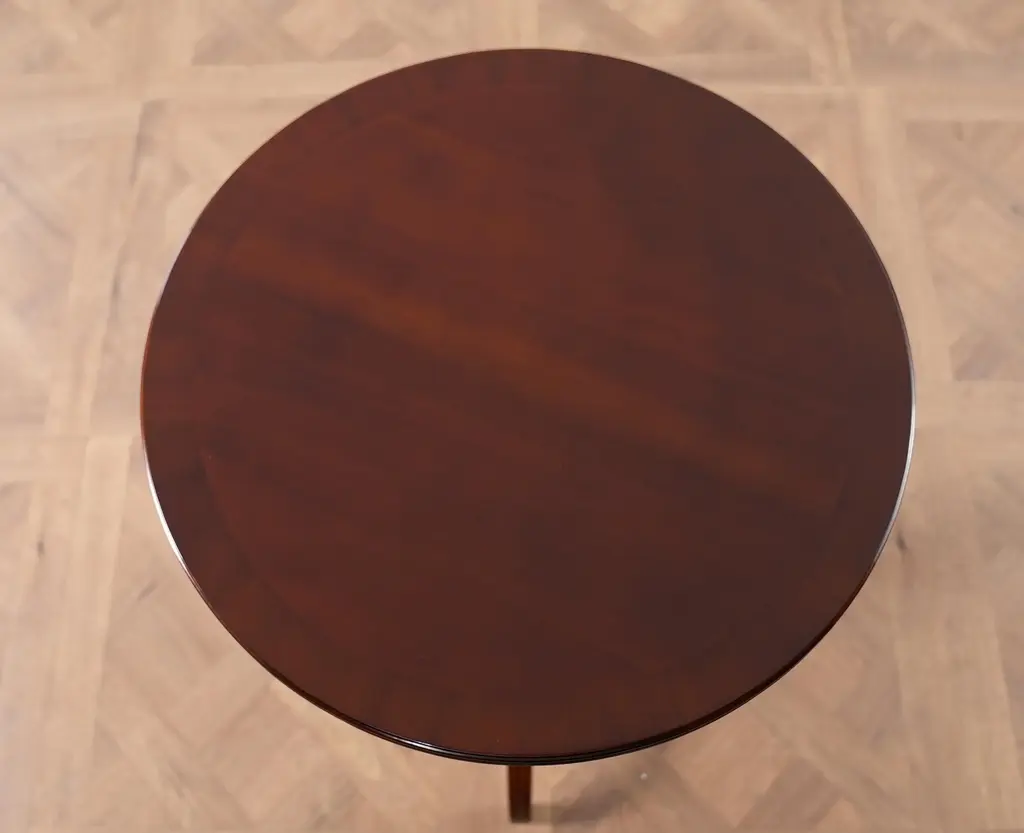 A high quality, Round Mahogany Table with Reeded Edge produced by Niagara Furniture. Beautifully shaped and banded top surrounded by sapele veneers, the entire table supported by three curved and shaped solid mahogany legs, dovetailed into the center platform for added strength and stability. The listed price of the Round Mahogany Table with Reeded Edge includes free curbside shipping for most addresses in the continental USA. Measures 21″w x 21″d x 29″h