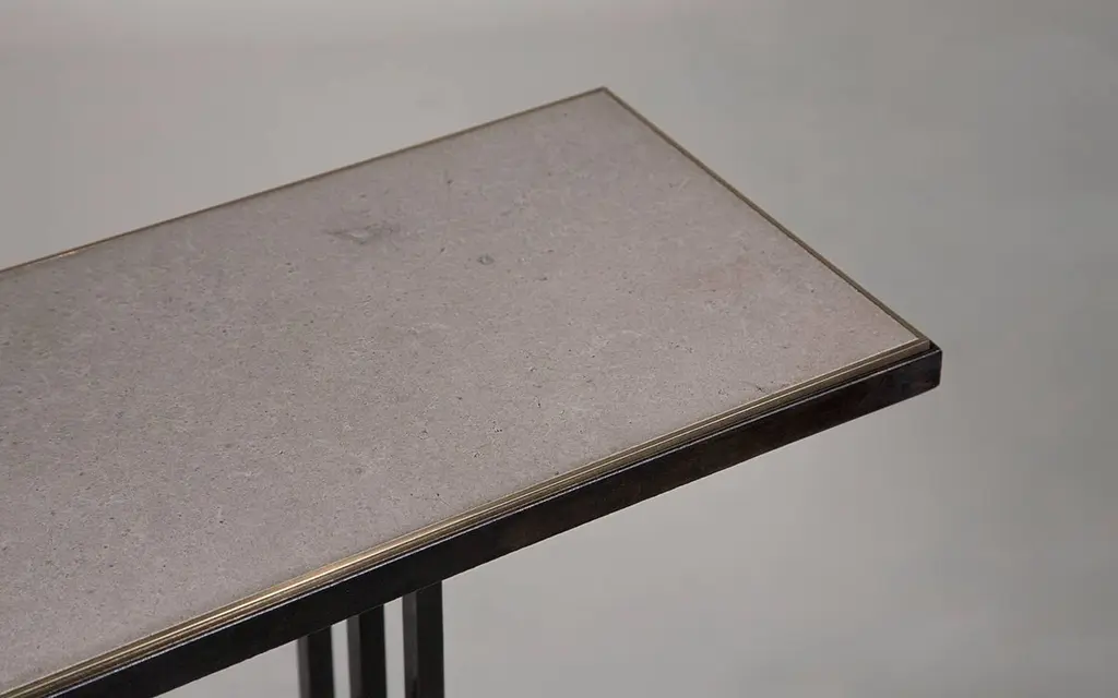 A console table in blackened steel and honed Cumbrian slate, with a polished brass trim. Hand crafted in the North to order. Custom sizes and finishes are available.Measures: 180cm W x 35cm D x 80cm H. Custom sizes available.Made to order in 12 weeks.Price excludes VAT.