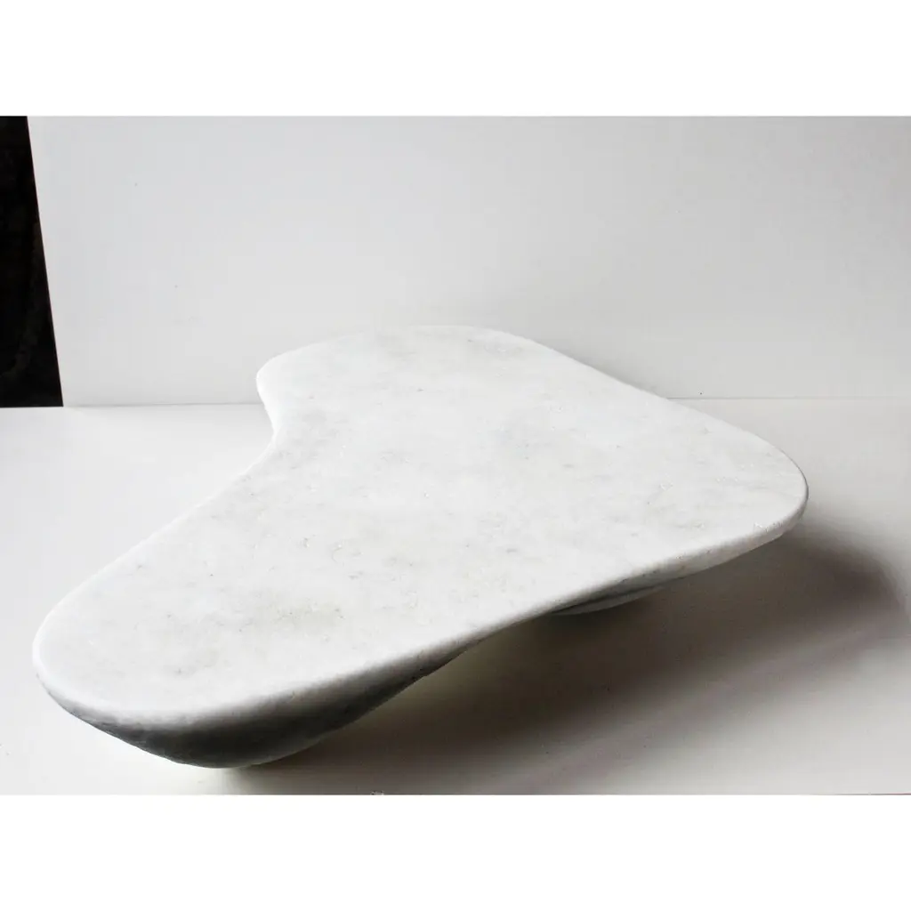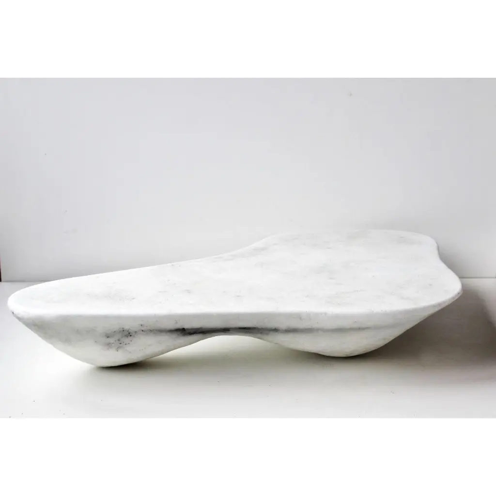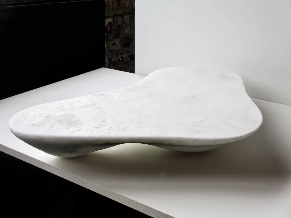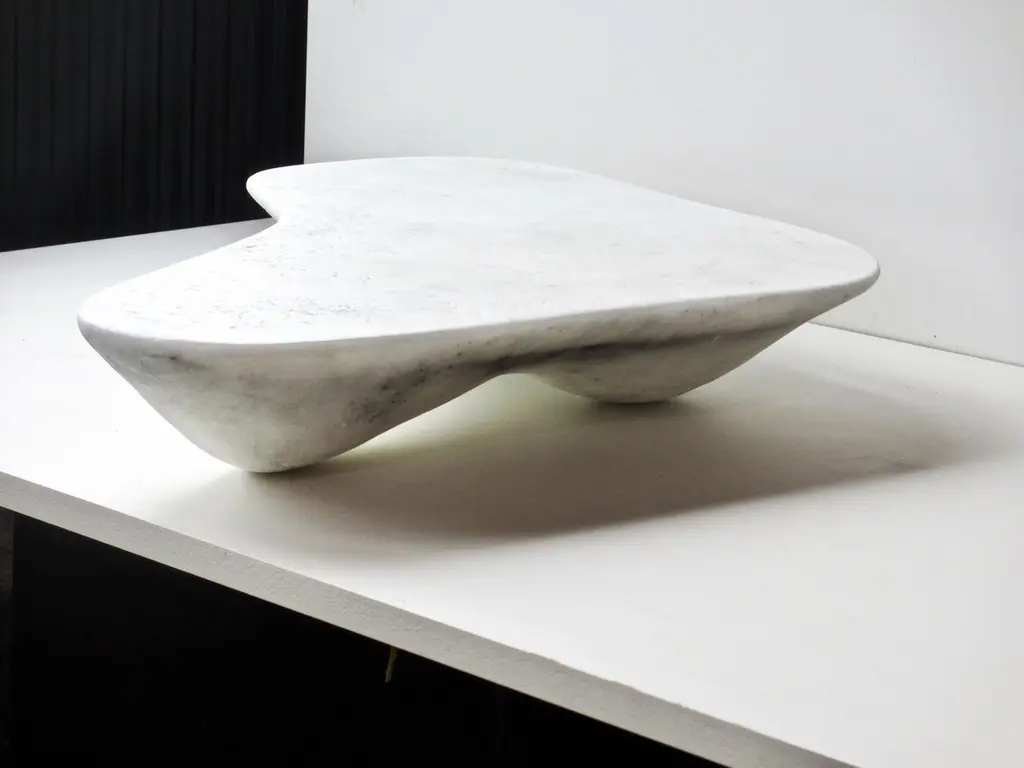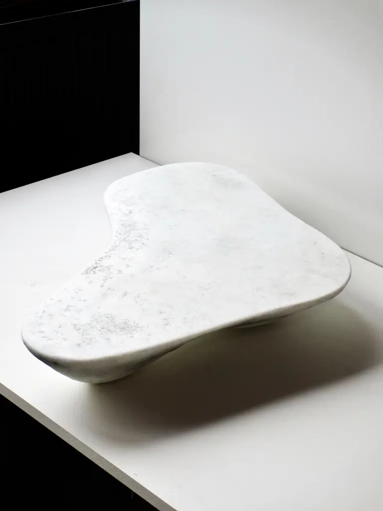 Nimbus low table by Roxane LahidjiDimensions: D 120 x W 55 x H 20 cm.Materials: Marble Salt.Weight: 180 kg.Roxane Lahidji is a social designer specializing in ecological material developments and applications. Her research focuses on achieving luxurious-looking objects and surfaces from low costs and raw resources.In this sense, she seeks to redefine the meaning of the objects she makes by balancing local and renewable resources, environmentally friendly production processes, and essential human values. With the deep concern of conciliating production and sustainability, her design uses disregarded or cheap materials brought to a new life, while twisting low-tech methods and traditional crafts techniques She describes her practice as an alchemical journey by developing her own transforming and molding methods.Roxane Lahidji was born in Paris in 1992 and grew up in the French capital before studying illustration and product design in Strasbourg (HEAR). After graduating from the Social Design department of Design Academy Eindhoven in 2017, Roxane Lahidji developed her project ‘’Marbled salts’’ and was awarded among the 100 best French international designers by FD100 price of the VIA and won the 2019 Bolia award.