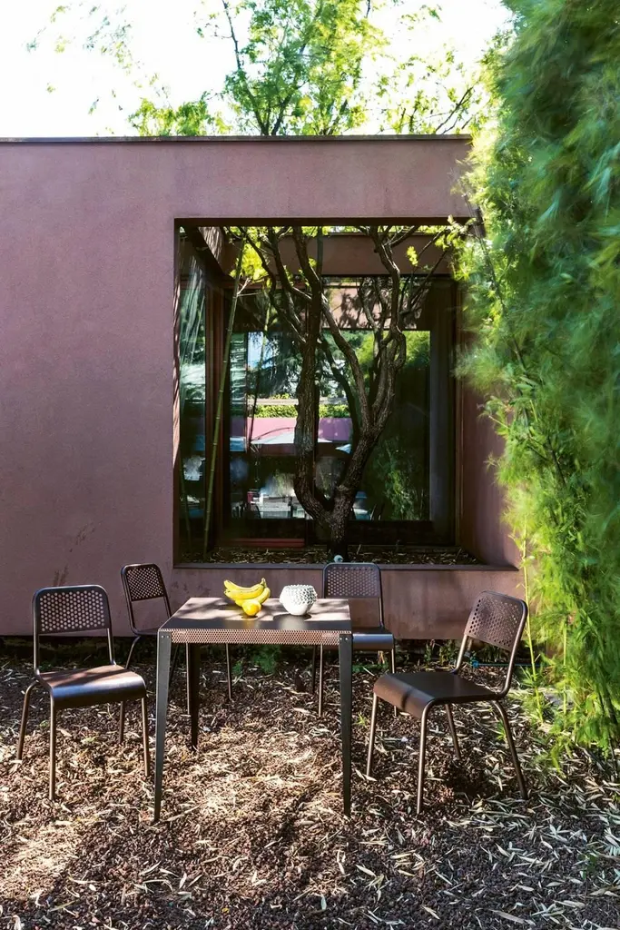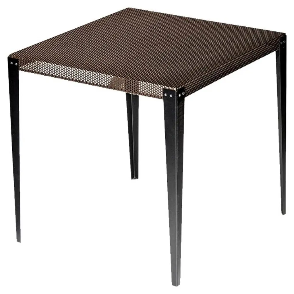 "Nizza" is a square table, designed by Diesel Creative Team and manufactured by Moroso, featuring a top made of a perforated steel sheet varnished with a copper finish and black varnished metal feet.Outdoor and indoor use.Dimensions:D. 39.4", W. 39.4", H. 29.5"Moroso, with Diesel, has created a collection of products with a relaxed and comfortable mood, taking its inspiration from an informal lifestyle concept and targeting consumers who like simple shapes yet at the same time seek a “modern” style made up of high quality combined with a distinctive design of pure lines.“We worked with the Diesel creative team to develop an interesting and alternative collection idea which was to represent two different yet coexisting aspects of certain contemporary trends: one which is darker in tone, inspired by the underground world and with a more aggressive and enigmatic aesthetic, and the other lighter, inspired by nature and a visual radiance, with soft and welcoming shapes”, explained Patrizia Moroso who always follows all the phases of every design project personally.