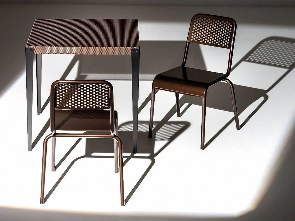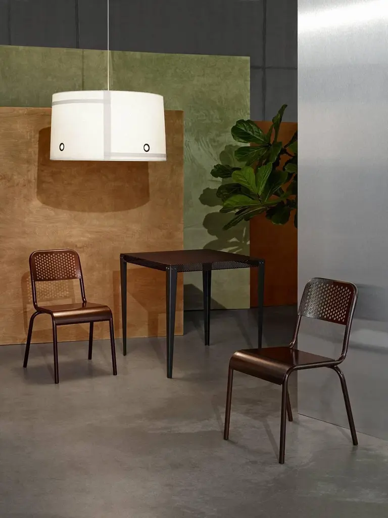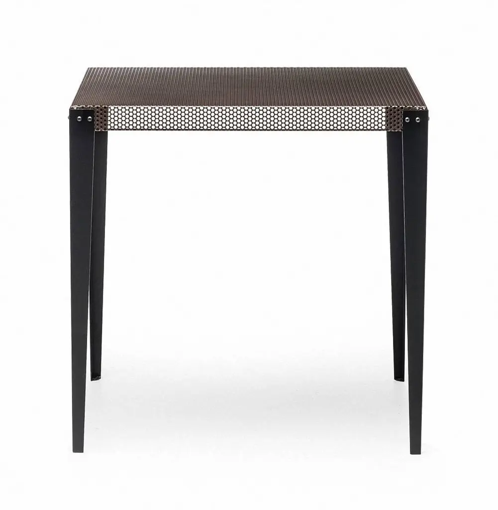 "Nizza" is a square table, designed by Diesel Creative Team and manufactured by Moroso, featuring a top made of a perforated steel sheet varnished with a copper finish and black varnished metal feet.Outdoor and indoor use.Dimensions:D. 29.5", W. 29.5", H. 29.5"Moroso, with Diesel, has created a collection of products with a relaxed and comfortable mood, taking its inspiration from an informal lifestyle concept and targeting consumers who like simple shapes yet at the same time seek a “modern” style made up of high quality combined with a distinctive design of pure lines.“We worked with the Diesel creative team to develop an interesting and alternative collection idea which was to represent two different yet coexisting aspects of certain contemporary trends: one which is darker in tone, inspired by the underground world and with a more aggressive and enigmatic aesthetic, and the other lighter, inspired by nature and a visual radiance, with soft and welcoming shapes”, explained Patrizia Moroso who always follows all the phases of every design project personally.