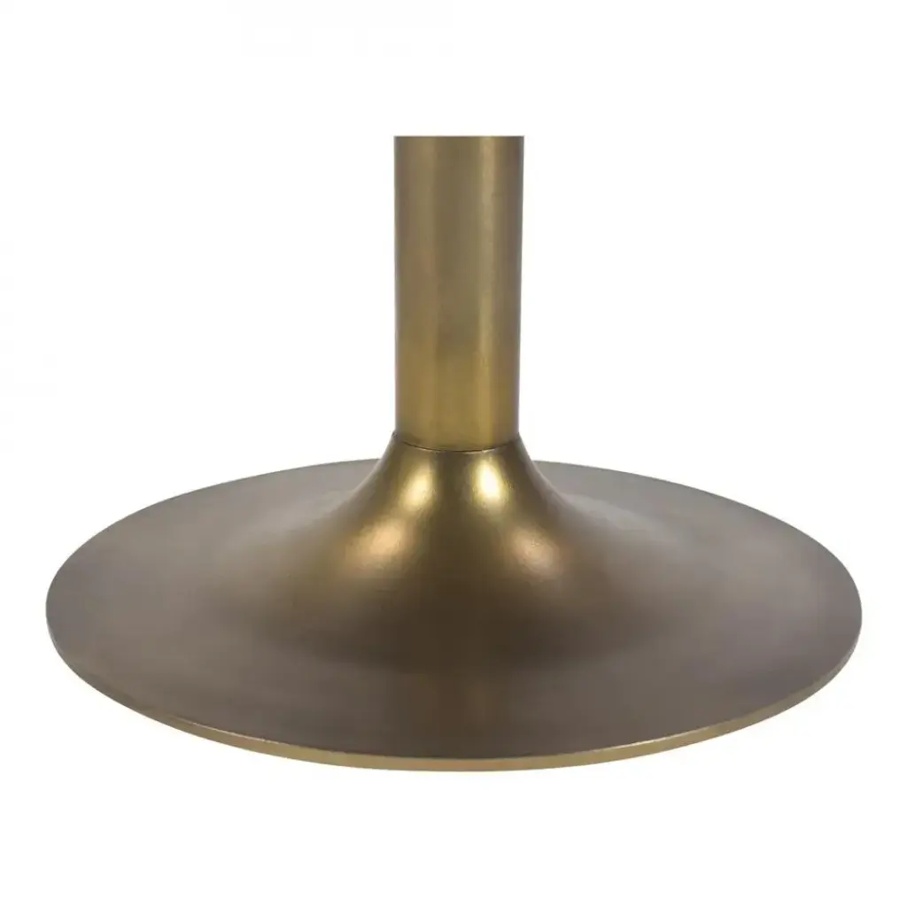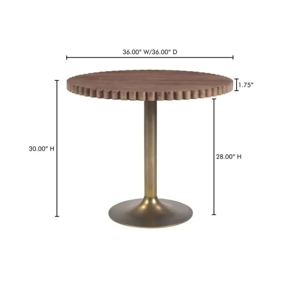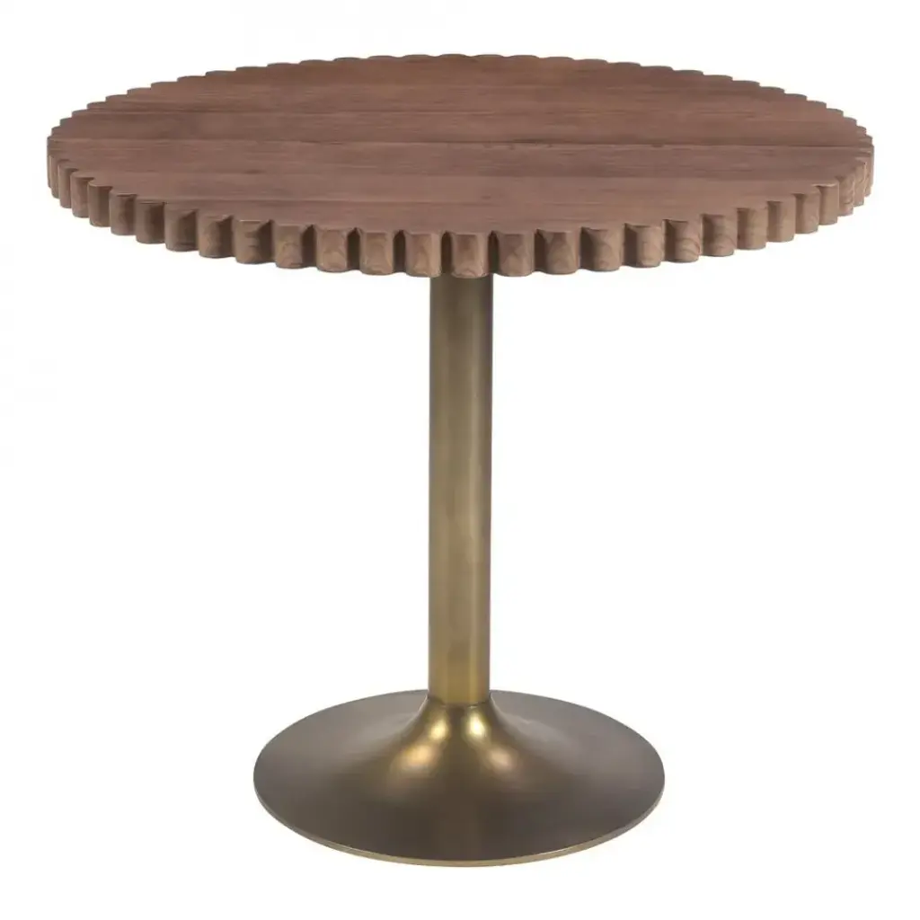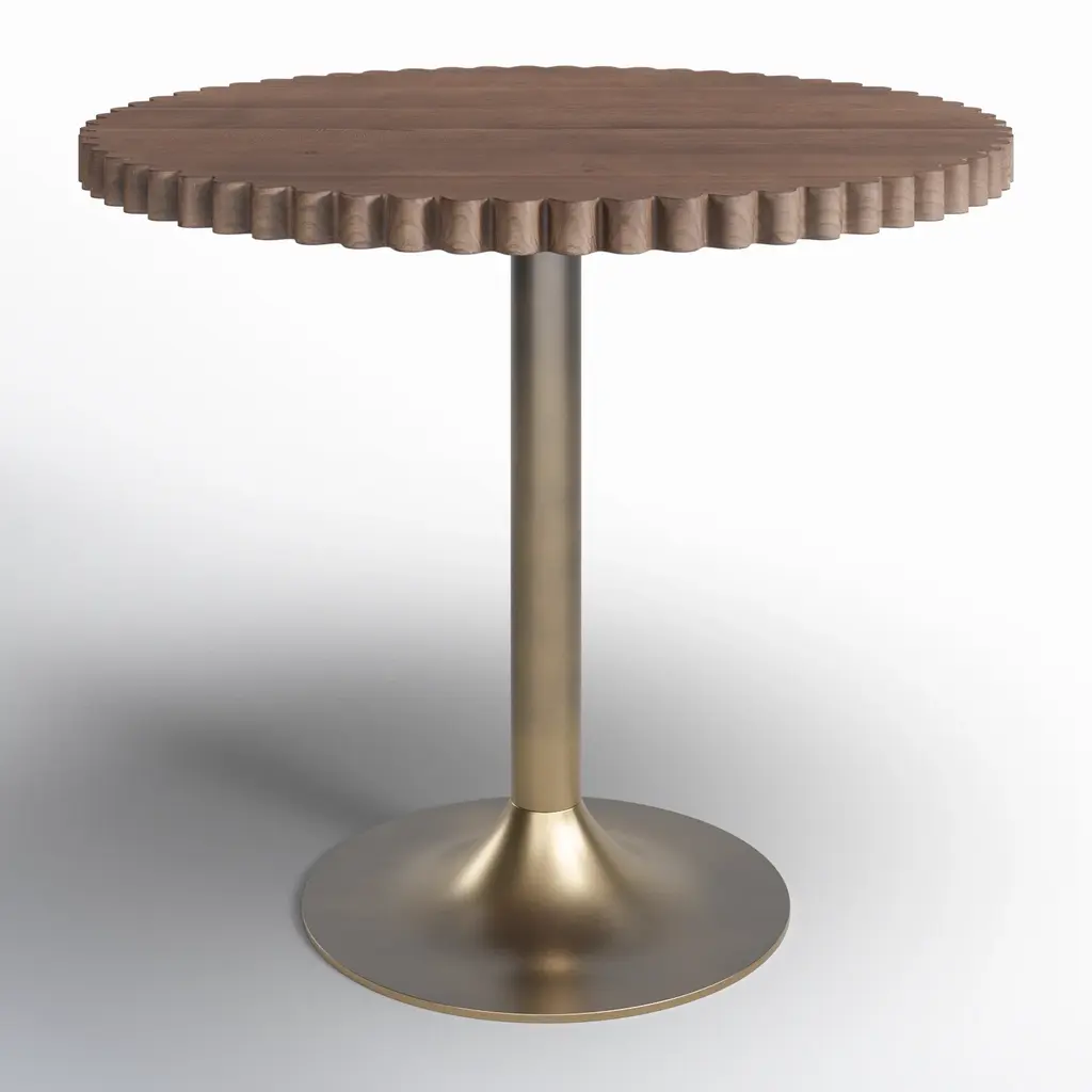 The wave detailing on the Nomi cafe table is a visual highlight, an expression of the thoughtfulness and attention to detail that went into its design, adding a sense of dynamic movement. The repetition of the wave pattern creates an inviting rhythm, providing a memorable visual experience along with a brass base, nodding to vintage design while maintaining a contemporary refinement, together conveying a sense of future heirloom quality.