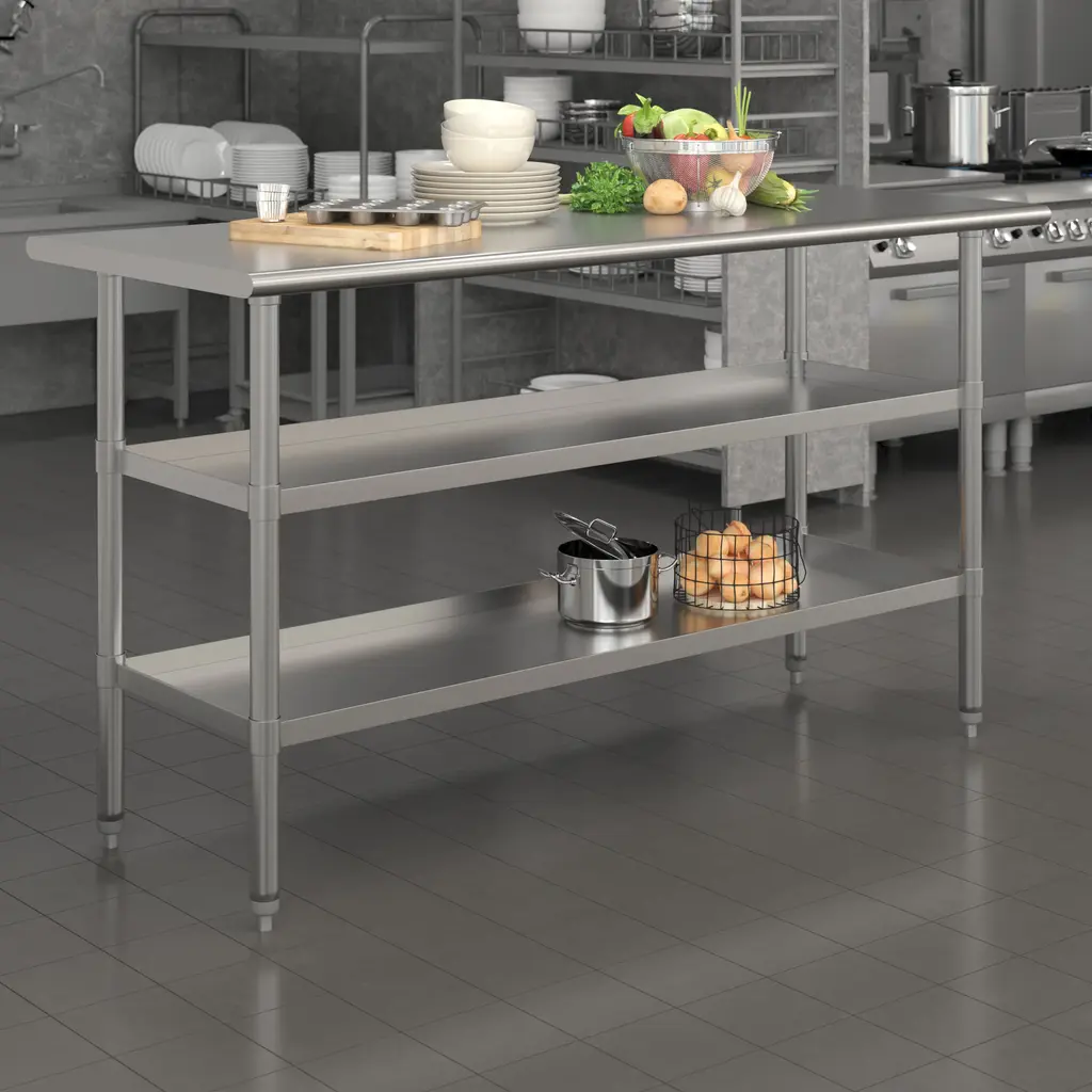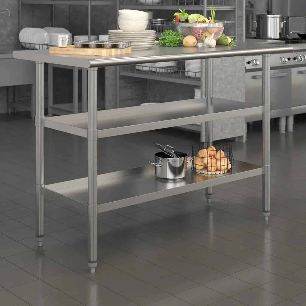 Kitchen space is always at a premium so this commercial stainless steel work table with dual adjustable undershelves is an excellent solution. Great for bulk food preparation for businesses such as daycares, hotels and restaurants, this versatile steel table can be placed against a wall or used as a freestanding kitchen island.Strength and durability are important factors when choosing equipment. Made from quality stainless steel, this metal utility table resists corrosion and holds up to 600 lbs. weight capacity while the undershelves hold up to 200 lbs. each. This commercial grade work table is certified to NSF quality standards reducing the chance of foodborne illness. Not only for kitchen use, this stainless prep table can be used in an outdoor kitchen away from the elements on a covered patio or deck, as a planting station in your greenhouse or a work surface in your garage. Rounded corners prevent scrapes and cuts and this multi-use work table easily assembles in under 10 minutes with the included tools. Adjustable feet move up to 1" to keep you level on uneven flooring. Remove any traces of food contaminants with water and a neutral detergent followed by a dry cloth to keep this shiny piece looking new.