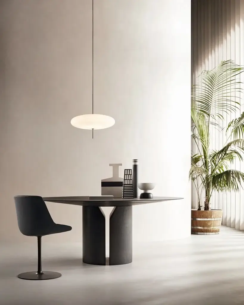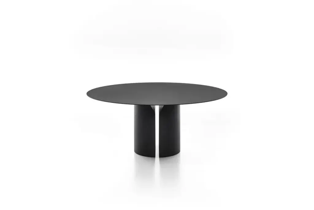 New glossy lacquered blue navy finish.A table made from only one material with contemporary lines that convey strong personality.The distinctive traits of its architecture manifest fully in this table to highlight stylistic elements that have always distinguished the works of Jean Nouvel: pure geometric shapes, formal lightness, graphic marks, and rigour.The simplicity of the shapes plays harmoniously on the contrast with the solidity of the material: the table top appears thin and light and seems to float above the base.The central support consists of two volumes that are tapered on the upper part to create two symmetrical bases that support the top. The effect recalls a trilithon, a structure formed from two vertical elements and a third positioned horizontally on top.Structure and surfacesThe bases and undertop flange are made of moulded high density rigid polyurethane joined together with a mechanical fastener.Each base has a closing plate and internal anti-tilt weight in moulded cast iron, epoxy powder coated in matt black, with specific places for slides and felt pads.The 25 mm top in medium density fibreboard closes the table’s “monolithic” look, with a snap clip and hidden points for fastening to the flange below. The point in which the two parts join creates an elegant rebate, which is a very pleasant technical/aesthetic detail.Dimensions and typesEach table mounts bases of different sizes and types (see following page): round model in the diameters 150 or180 cm, or oval model W200, W250 or 300, are also available. Table height, 74 cm. FinishesThe bases, undertop flange and top are always monochromatic, lacquered or faced with the application of 3 mm slabs, in the variants:• matt lacquer in white, black and red;• glossy lacquer (polyester) in white, black, red, coral red, dune, blue navy and English green;• materials in the variants reconstructed stone Serena, reconstructed stone white Calce, black slate, yellow onyx, pink onyx, red brick and sage green.