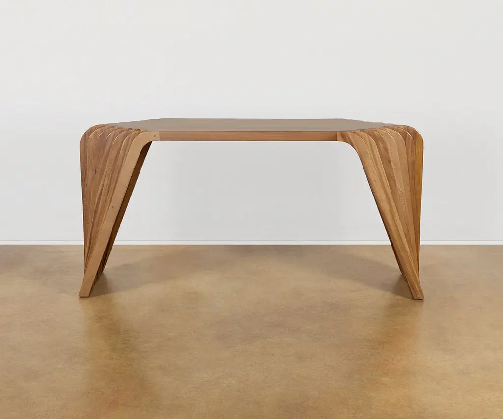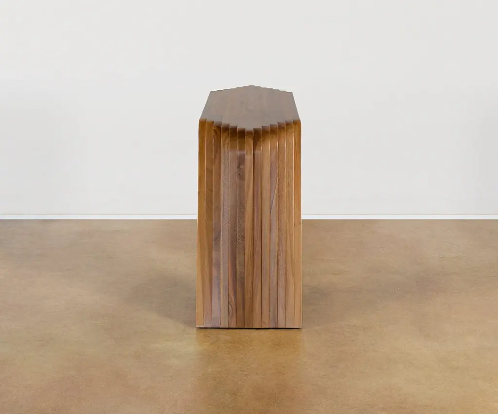 The Nyssa Console Table boasts a uniquely textured, ultra-modern shape handcrafted from suar wood, with a natural finish to highlight the grain.