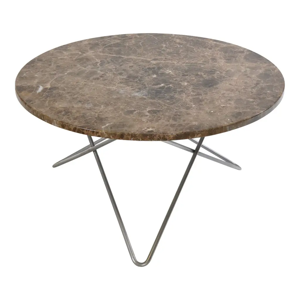 Frame made in stainless steel, powder coated steel or brass (steel with brass surface). Marble tops are to be screwed on to the metal frame. Glass tops can be clicked onto the frame. Leather tables will be delivered assembled. Table tops in Carrara Marble, Black Marquina, Green Indio, Grey Italian (mat) and Brown Emparador will exhibit natural variations in terms of colour, drawings and patterns characteristic for each type of marble. As for Carrara Marble, small cracks can sometimes be found on the polished surface. This phenomenon known as “taroli" is a natural characteristic of the stone, which cannot be eliminated completely. Leather is handmade by skilled craftsmen using high-quality 100 % vegetable tanned aniline leather with a general thickness of 3 mm or more. Natural imperfections on leather surface must be accepted. With time, light and use, the leather will gain depth and lustre as it ages. Due to the highly artisan process used and variation in the natural raw material, leather can wary quite significantly in colour between production batches.
