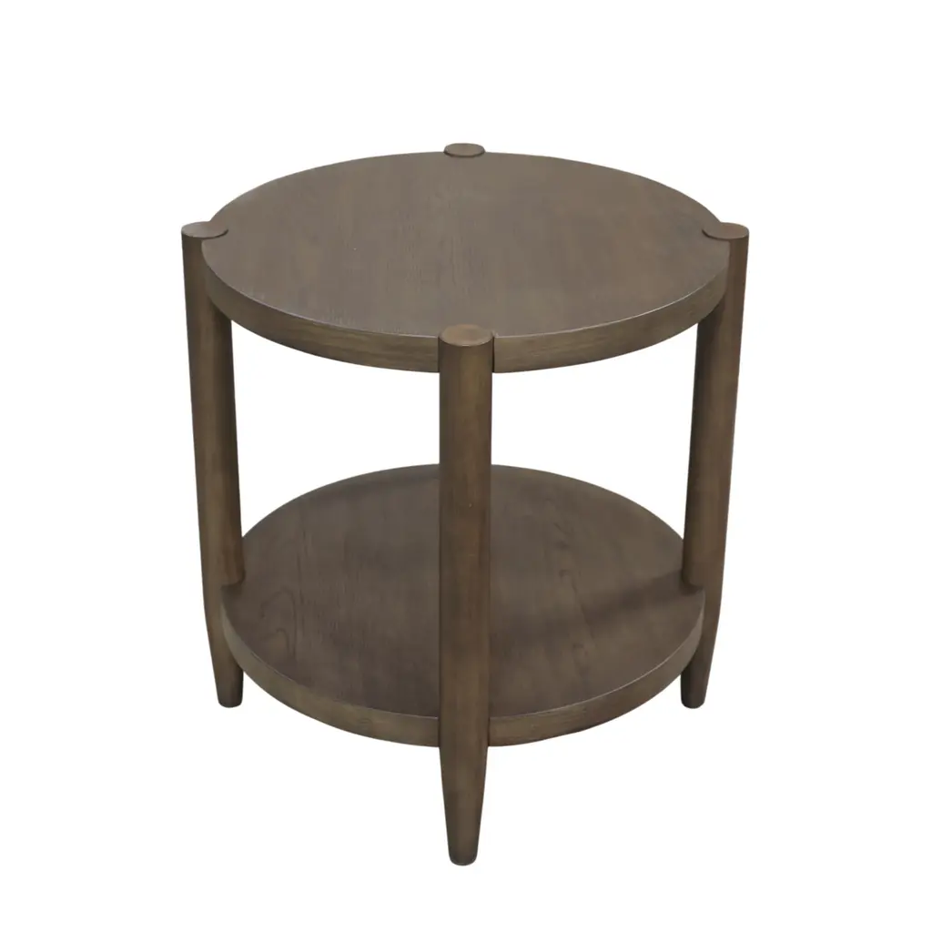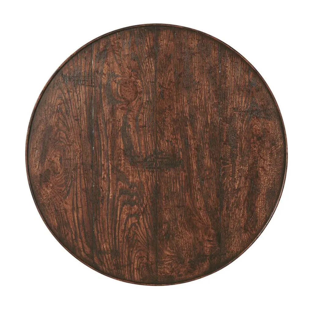 An English reclaimed oak veneered and mahogany cricket table, the circular planked top with a raised edge, on three splayed tapering legs joined by a triangular undertier.Dimensions: 26" W x 26" D x 26.25" H.