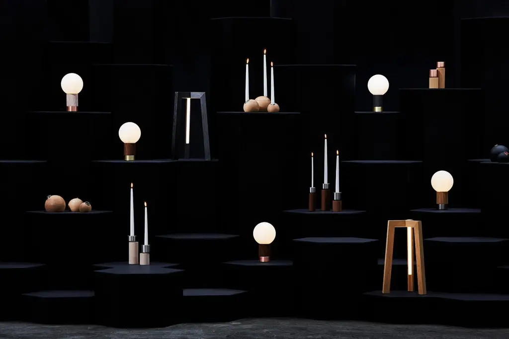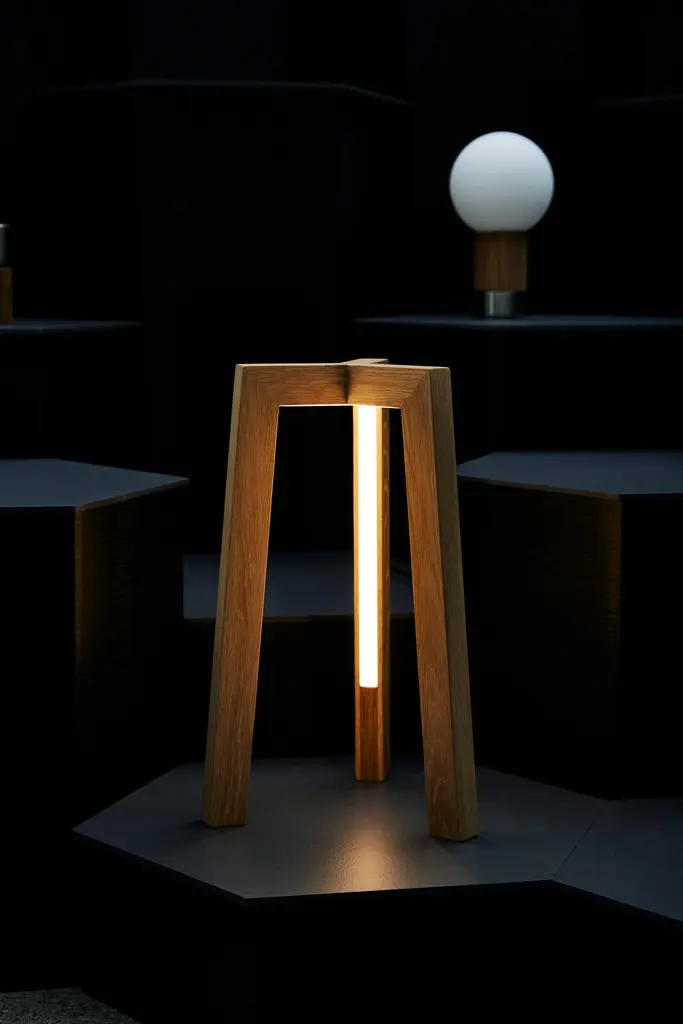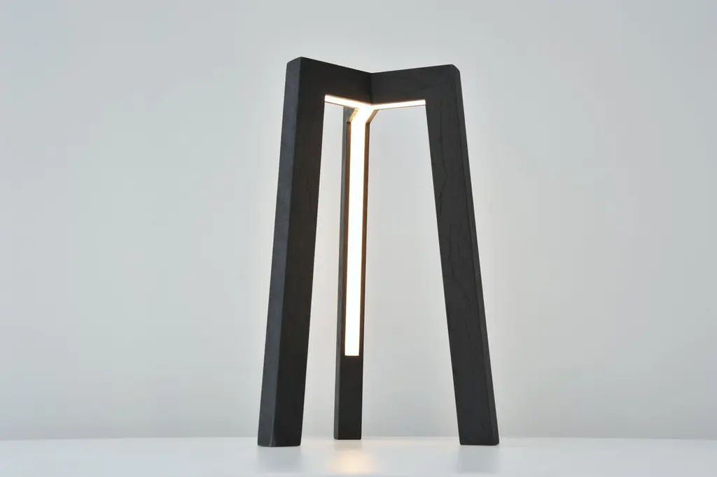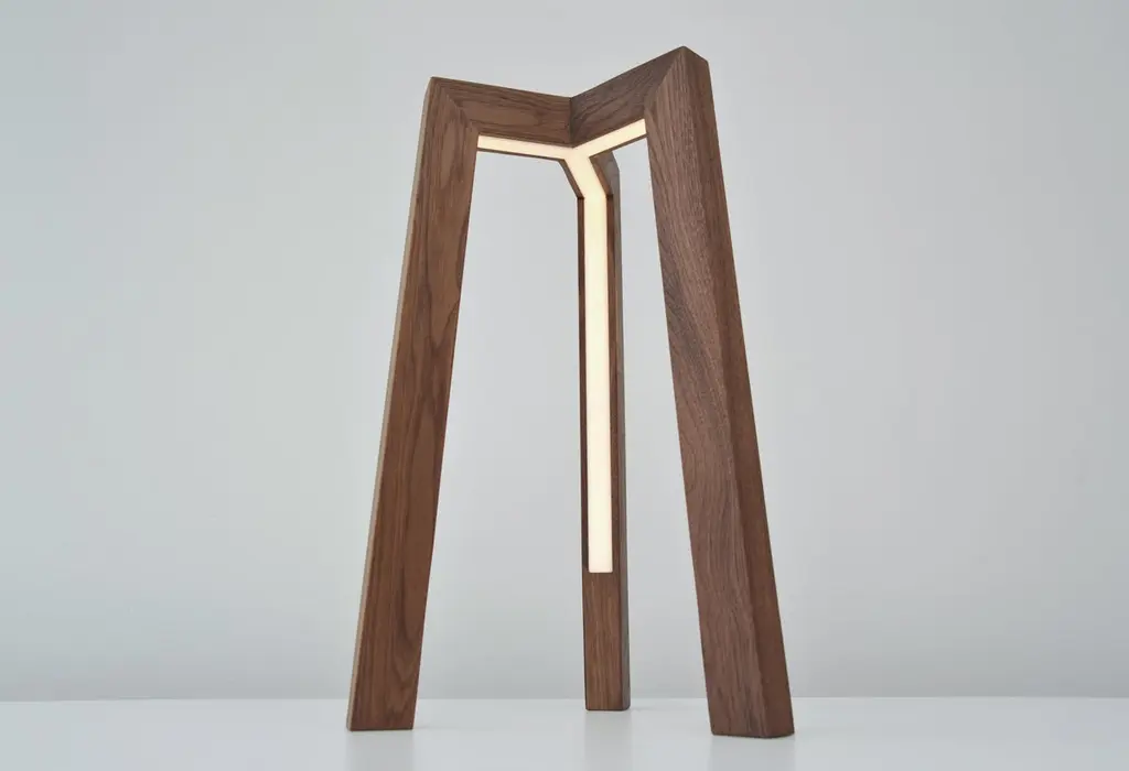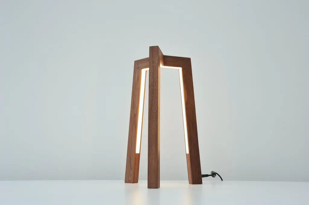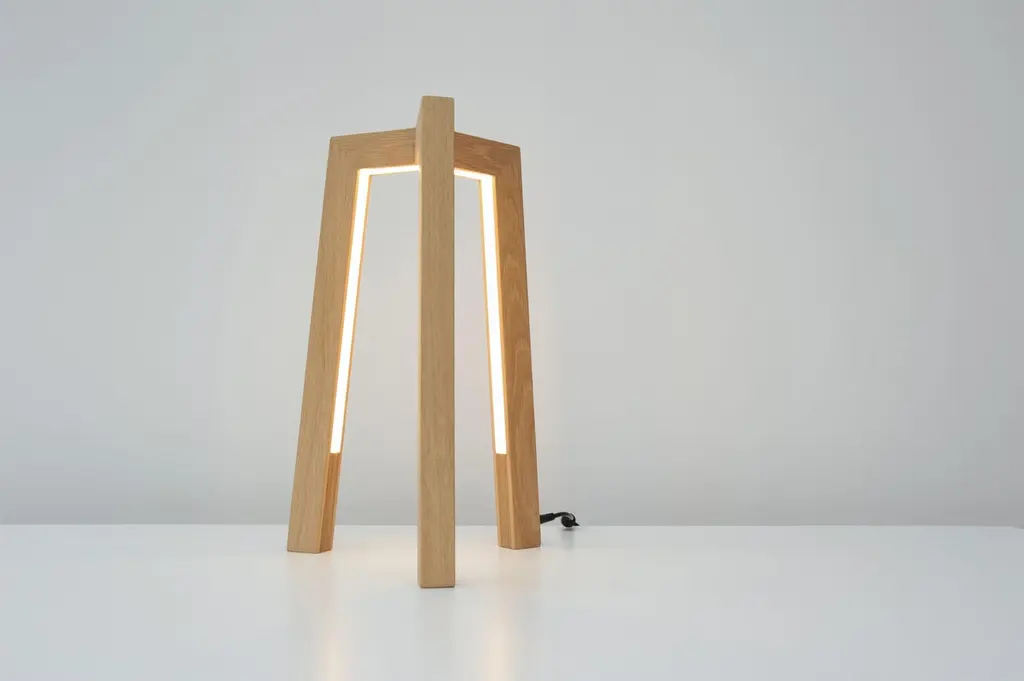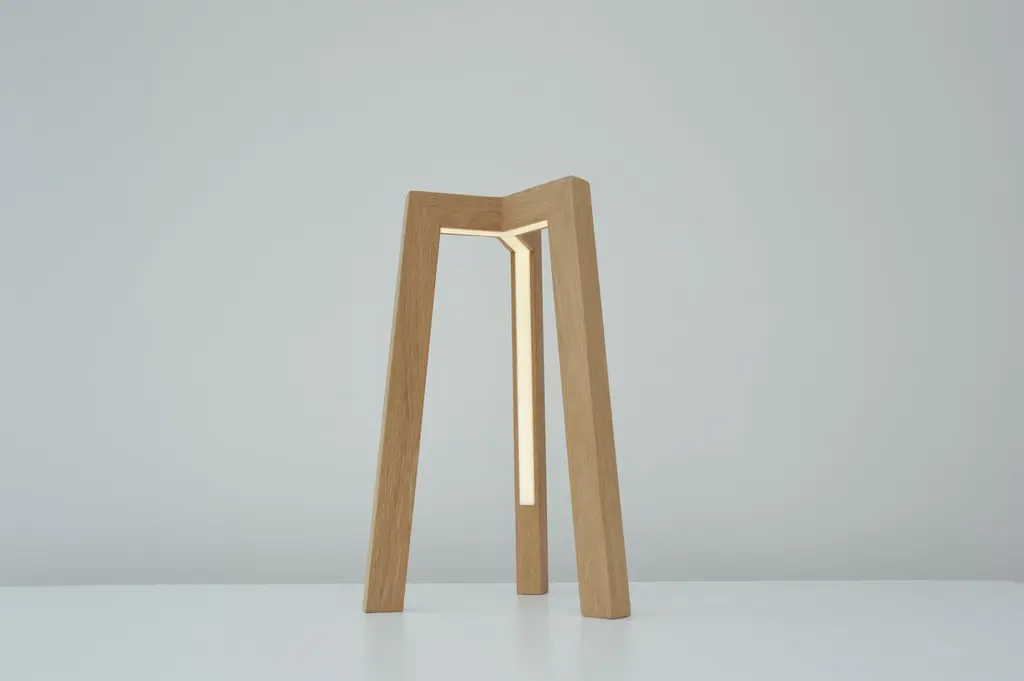 Oak junction table light by Hollis & Morris.Dimensions: 10.5" x H 17".Materials: solid wood, hardwax oil. Also available in natural oak, black oak, white oak, and walnut. Metal brushed finish. All our lamps can be wired according to each country. If sold to the USA it will be wired for the USA for instance.Paying homage to hollis+morris’ Toronto home, the railways of the junction connect to form a creative hub. This light illustrates railways of light intersecting to create a glowing canopy over your space. Solid walnut or W.oak, LED.Based out of Toronto, Hollis & Morris takes its name from an intersection in Halifax where the company started as a series of garage explorations in design. A steadfast commitment to function with a distinctive approach to design. Hollis & Morris creates handmade furniture and lighting which carefully balances modern and honest designs. Versatile, well crafted, and timeless. Pieces by Hollis & Morris easily complement residential, commercial, and hospitality spaces. Driven by respect towards natural and honest processes, trademark integrations of solid wood and metal celebrate the inherent strengths of each material, resulting in thoughtful, quality pieces made to last with you throughout the years.