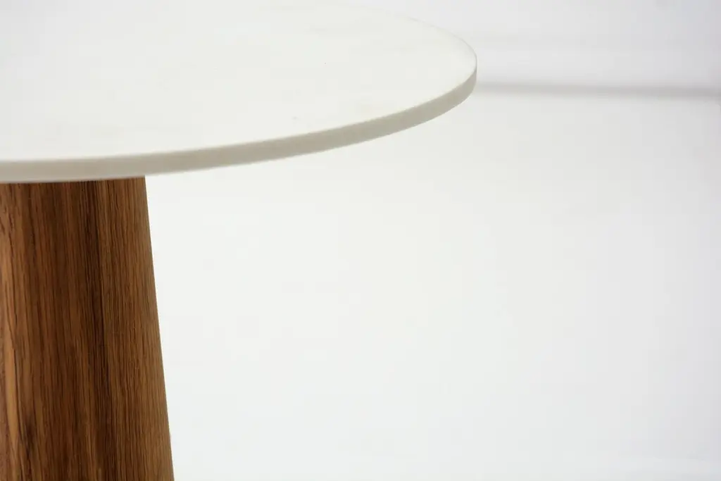 Oak small bedford side table by Hollis & MorrisDimensions: Diameter 16" x Height 19"Materials: solid wood base, Corian top. Hardwax oil finish.Also available in natural oak, black oak, and walnut.Based out of Toronto, Hollis & Morris takes its name from an intersection in Halifax where the company started as a series of garage explorations in design. A steadfast commitment to function with a distinctive approach to design. Hollis & Morris creates handmade furniture and lighting which carefully balances modern and honest designs. Versatile, well crafted, and timeless. Pieces by Hollis & Morris easily complement residential, commercial, and hospitality spaces. Driven by respect towards natural and honest processes, trademark integrations of solid wood and metal celebrate the inherent strengths of each material, resulting in thoughtful, quality pieces made to last with you throughout the years.