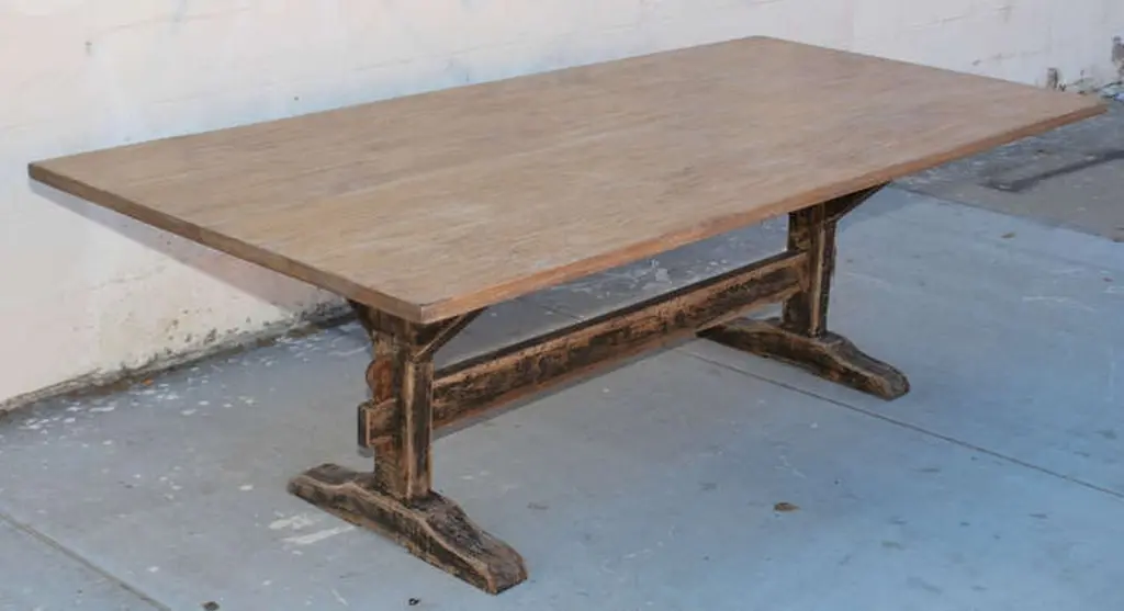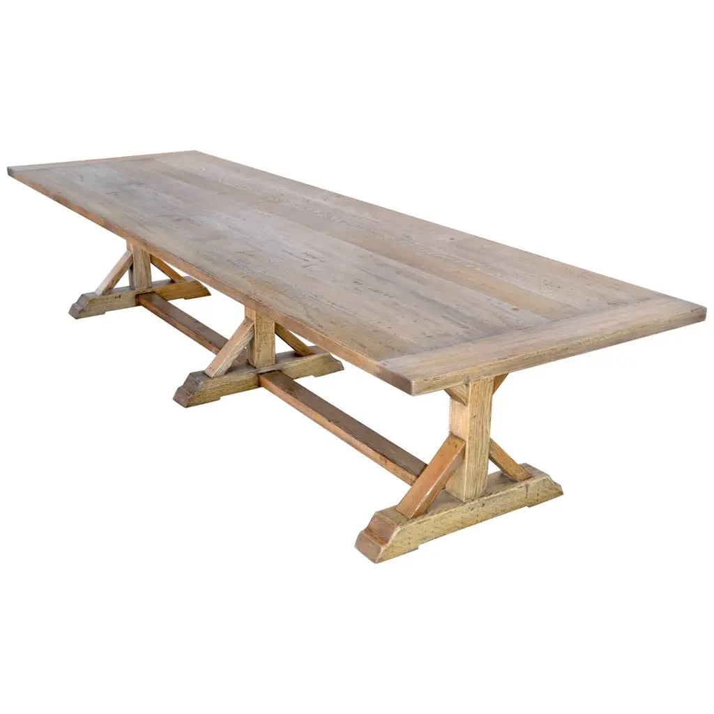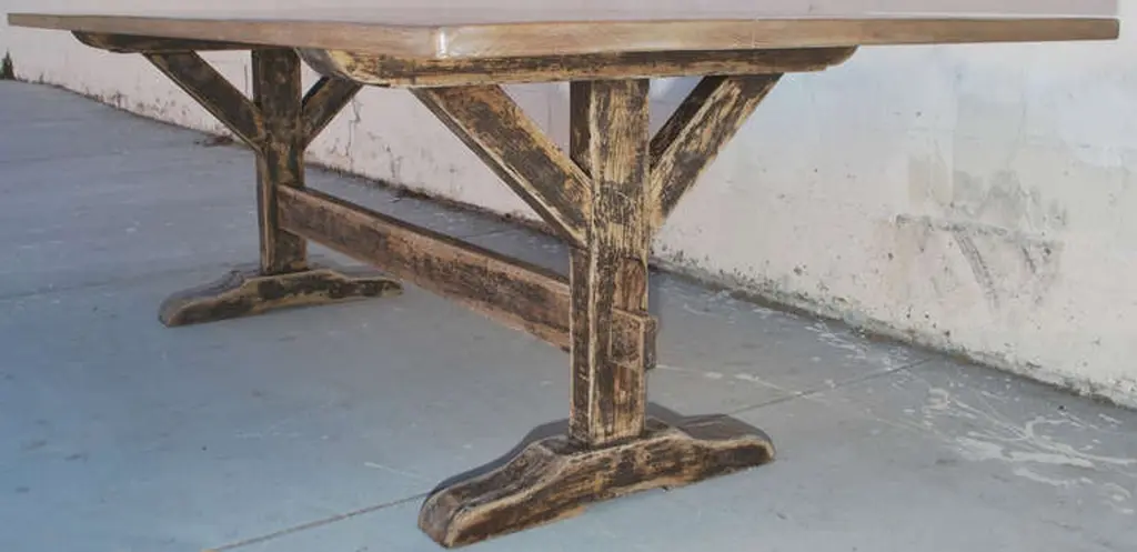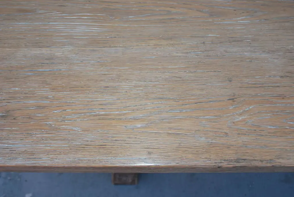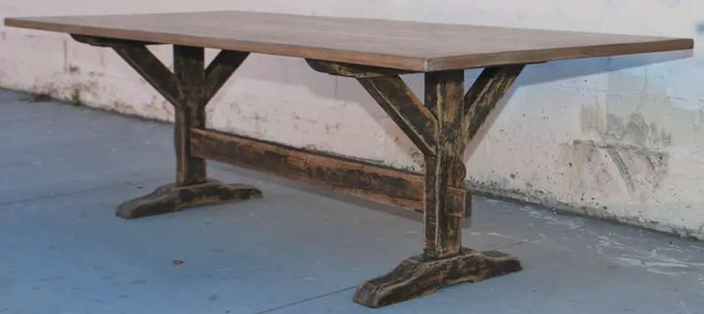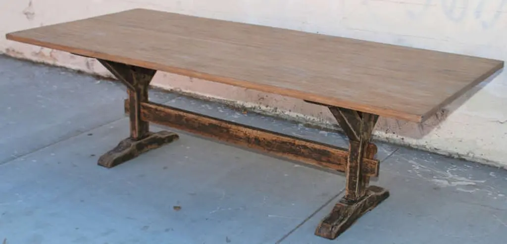 This completely collapsible oak trestle table is nicely weathered with tons of character.Because each table is bench-made in our own Los Angeles workshop you can influence all aspects of design, including size, wood species and finish. We use only traditional carpentry techniques, no nails or metal fasteners of any kind, just mortise and tenon construction reinforced with hand-cut wooden dowels. If you require customized overhang dimensions please stipulate with order.